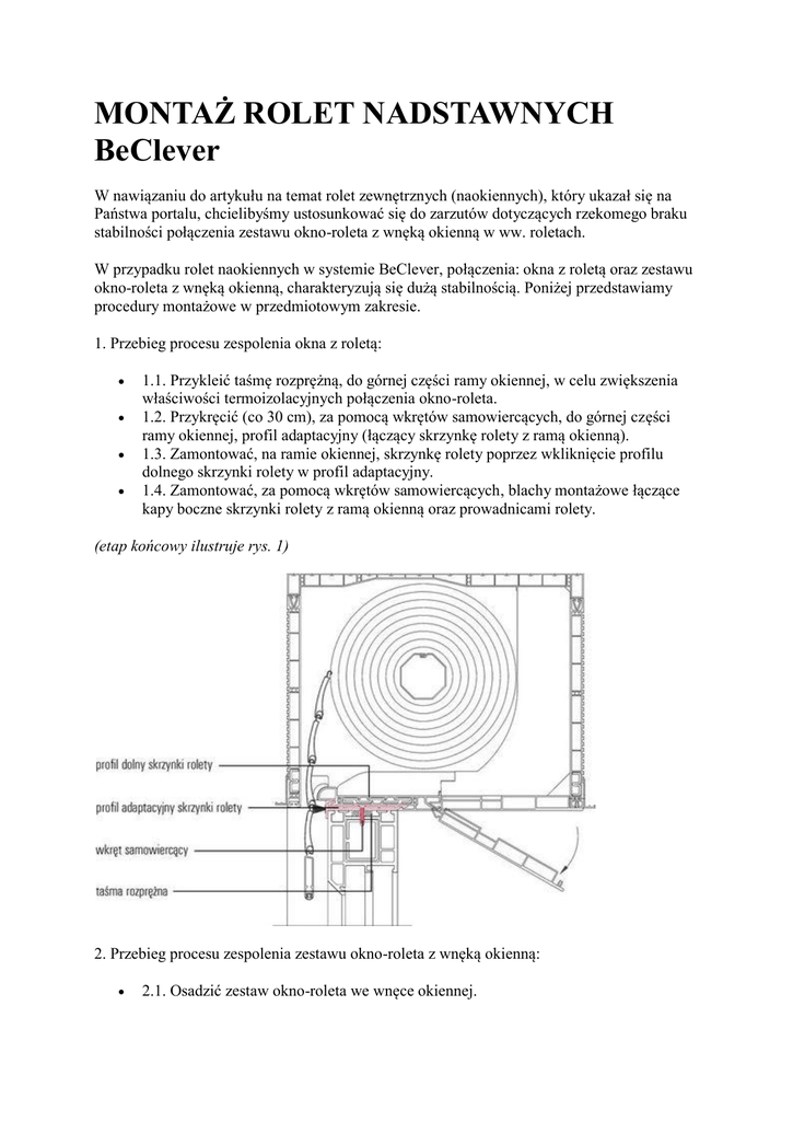 MONTAŻ ROLET NADSTAWNYCH BeClever W nawiązaniu do artykułu na temat rolet zewnętrznych (naokiennych), który ukazał się na Państwa portalu, chcielibyśmy ustosunkować się do zarzutów dotyczących rzekomego braku stabilności połączenia zestawu okno-roleta z wnęką okienną w ww. roletach. W przypadku rolet naokiennych w systemie BeClever, połączenia: okna z roletą oraz zestawu okno-roleta z wnęką okienną, charakteryzują się dużą stabilnością. Poniżej przedstawiamy procedury montażowe w przedmiotowym zakresie. 1. Przebieg procesu zespolenia okna z roletą: 1.1. Przykleić taśmę rozprężną, do górnej części ramy okiennej, w celu zwiększenia właściwości termoizolacyjnych połączenia okno-roleta. 1.2. Przykręcić (co 30 cm), za pomocą wkrętów samowiercących, do górnej części ramy okiennej, profil adaptacyjny (łączący skrzynkę rolety z ramą okienną). 1.3. Zamontować, na ramie okiennej, skrzynkę rolety poprzez wkliknięcie profilu dolnego skrzynki rolety w profil adaptacyjny. 1.4. Zamontować, za pomocą wkrętów samowiercących, blachy montażowe łączące kapy boczne skrzynki rolety z ramą okienną oraz prowadnicami rolety. (etap końcowy ilustruje rys. 1) 2. Przebieg procesu zespolenia zestawu okno-roleta z wnęką okienną: 2.1. Osadzić zestaw okno-roleta we wnęce okiennej. 2.2. Zamontować, za pomocą dybli montażowych lub kotew montażowych, ramę okienną we wnęce okiennej (wg zaleceń producenta stolarki okiennej). 2.3. Zamontować (co 50 cm), za pomocą dybli montażowych (patrz 2.3.1.) lub kotew montażowych (patrz 2.3.2.), skrzynkę rolety do nadproża wnęki okiennej. 2.3.1. Przebieg procesu montażu za pośrednictwem dybli montażowych (metalowych). - bezpośrednie skręcenie skrzynki rolety z nadprożem - zalecane, gdy odległość pomiędzy nadprożem wnęki okiennej a profilem górnym skrzynki rolety nie przekracza 3 cm 2.3.1.1. Otworzyć i wyciągnąć pokrywę rewizyjną skrzynki rolety. 2.3.1.2. Wysunąć ocieplenie ze środka skrzynki rolety. 2.3.1.3. Wywiercić otwór w profilu górnym skrzynki rolety oraz w nadprożu wnęki okiennej. 2.3.1.4. Wkręcić (od środka skrzynki rolety) dybel montażowy (metalowy z dużą podkładką) w wywiercony uprzednio otwór, w celu przymocowania profilu górnego skrzynki rolety do nadproża wnęki okiennej. (etap końcowy ilustruje rys. 2) 2.3.2. Przebieg procesu montażu za pośrednictwem kotew montażowych (blaszanych, wygiętych pod kątem 90o). - pośrednie skręcenie skrzynki rolety z nadprożem zalecane, gdy odległość pomiędzy nadprożem wnęki okiennej a profilem górnym skrzynki rolety przekracza 3 cm 2.3.2.1. Otworzyć i wyciągnąć pokrywę rewizyjną skrzynki rolety. 2.3.2.2. Wysunąć ocieplenie ze środka skrzynki rolety. 2.3.2.3. Wywiercić otwór w profilu górnym skrzynki rolety. 2.3.2.4. Skręcić za pomocą śruby (z dużą podkładką) kotwę montażową z profilem górnym skrzynki rolety (zaleca się wykonanie ww. czynności przed osadzeniem zestawu okno-roleta we wnęce okiennej (przed etapem 2.1.)). 2.3.2.5. Wywiercić otwór w nadprożu poza wnęką okienną - od strony wnętrza pomieszczenia. 2.3.2.6. Wkręcić dybel montażowy (metalowy lub z tworzywa) w wywiercony uprzednio otwór, w celu przymocowania kotwy montażowej do nadproża wnęki okiennej. (etap końcowy ilustruje rys. 3) 3. Przebieg procesu końcowego: 3.1. Wsunąć, w szczelinę pomiędzy profilem górnym skrzynki rolety a nadprożem wnęki okiennej, wkładkę styropianową o wysokości dopasowanej do wymiarów ww. szczeliny. 3.2. Wypełnić, pianką montażową (poliuretanową), przestrzeń pomiędzy zestawem okno-roleta a wnęką okienną (zaleca się ostrożne stosowanie pianki - dawkować w odpowiedniej ilości). Prawidłowo wykonany montaż zarówno okna z roletą, jak i zestawu okno-roleta z wnęką okienną, zapewnia dużą stabilność przedmiotowych połączeń