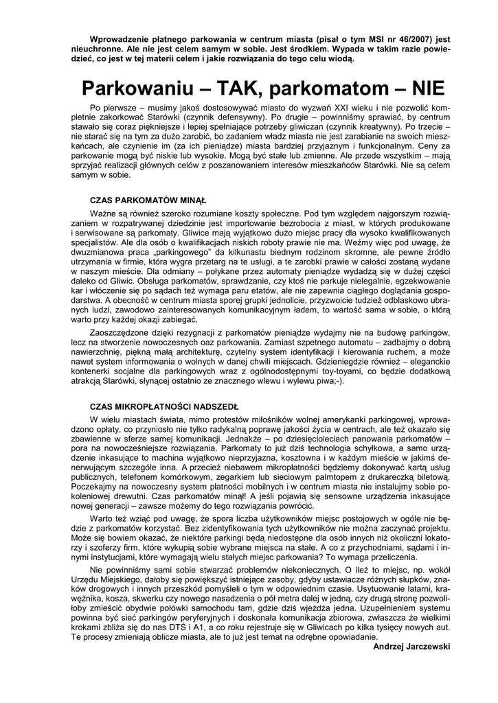 Wprowadzenie płatnego parkowania w centrum miasta (pisał o tym MSI nr 46/2007) jest nieuchronne. Ale nie jest celem samym w sobie. Jest środkiem. Wypada w takim razie powiedzieć, co jest w tej materii celem i jakie rozwiązania do tego celu wiodą. Parkowaniu – TAK, parkomatom – NIE Po pierwsze – musimy jakoś dostosowywać miasto do wyzwań XXI wieku i nie pozwolić kompletnie zakorkować Starówki (czynnik defensywny). Po drugie – powinniśmy sprawiać, by centrum stawało się coraz piękniejsze i lepiej spełniające potrzeby gliwiczan (czynnik kreatywny). Po trzecie – nie starać się na tym za duŜo zarobić, bo zadaniem władz miasta nie jest zarabianie na swoich mieszkańcach, ale czynienie im (za ich pieniądze) miasta bardziej przyjaznym i funkcjonalnym. Ceny za parkowanie mogą być niskie lub wysokie. Mogą być stałe lub zmienne. Ale przede wszystkim – mają sprzyjać realizacji głównych celów z poszanowaniem interesów mieszkańców Starówki. Nie są celem samym w sobie. CZAS PARKOMATÓW MINĄŁ WaŜne są równieŜ szeroko rozumiane koszty społeczne. Pod tym względem najgorszym rozwiązaniem w rozpatrywanej dziedzinie jest importowanie bezrobocia z miast, w których produkowane i serwisowane są parkomaty. Gliwice mają wyjątkowo duŜo miejsc pracy dla wysoko kwalifikowanych specjalistów. Ale dla osób o kwalifikacjach niskich roboty prawie nie ma. Weźmy więc pod uwagę, Ŝe dwuzmianowa praca „parkingowego” da kilkunastu biednym rodzinom skromne, ale pewne źródło utrzymania w firmie, która wygra przetarg na te usługi, a te zarobki prawie w całości zostaną wydane w naszym mieście. Dla odmiany – połykane przez automaty pieniądze wydadzą się w duŜej części daleko od Gliwic. Obsługa parkomatów, sprawdzanie, czy ktoś nie parkuje nielegalnie, egzekwowanie kar i włóczenie się po sądach teŜ wymaga paru etatów, ale nie zapewnia ciągłego doglądania gospodarstwa. A obecność w centrum miasta sporej grupki jednolicie, przyzwoicie tudzieŜ odblaskowo ubranych ludzi, zawodowo zainteresowanych komunikacyjnym ładem, to wartość sama w sobie, o którą warto przy kaŜdej okazji zabiegać. Zaoszczędzone dzięki rezygnacji z parkomatów pieniądze wydajmy nie na budowę parkingów, lecz na stworzenie nowoczesnych oaz parkowania. Zamiast szpetnego automatu – zadbajmy o dobrą nawierzchnię, piękną małą architekturę, czytelny system identyfikacji i kierowania ruchem, a moŜe nawet system informowania o wolnych w danej chwili miejscach. Gdzieniegdzie równieŜ – eleganckie kontenerki socjalne dla parkingowych wraz z ogólnodostępnymi toy-toyami, co będzie dodatkową atrakcją Starówki, słynącej ostatnio ze znacznego wlewu i wylewu piwa;-). CZAS MIKROPŁATNOŚCI NADSZEDŁ W wielu miastach świata, mimo protestów miłośników wolnej amerykanki parkingowej, wprowadzono opłaty, co przyniosło nie tylko radykalną poprawę jakości Ŝycia w centrach, ale teŜ okazało się zbawienne w sferze samej komunikacji. JednakŜe – po dziesięcioleciach panowania parkomatów – pora na nowocześniejsze rozwiązania. Parkomaty to juŜ dziś technologia schyłkowa, a samo urządzenie inkasujące to machina wyjątkowo nieprzyjazna, kosztowna i w kaŜdym mieście w jakimś denerwującym szczególe inna. A przecieŜ niebawem mikropłatności będziemy dokonywać kartą usług publicznych, telefonem komórkowym, zegarkiem lub sieciowym palmtopem z drukareczką biletową. Poczekajmy na nowoczesny system płatności mobilnych i w centrum miasta nie instalujmy sobie pokoleniowej drewutni. Czas parkomatów minął! A jeśli pojawią się sensowne urządzenia inkasujące nowej generacji – zawsze moŜemy do tego rozwiązania powrócić. Warto teŜ wziąć pod uwagę, Ŝe spora liczba uŜytkowników miejsc postojowych w ogóle nie będzie z parkomatów korzystać. Bez zidentyfikowania tych uŜytkowników nie moŜna zaczynać projektu. MoŜe się bowiem okazać, Ŝe niektóre parkingi będą niedostępne dla osób innych niŜ okoliczni lokatorzy i szoferzy firm, które wykupią sobie wybrane miejsca na stałe. A co z przychodniami, sądami i innymi instytucjami, które wymagają wielu stałych miejsc parkowania? To wymaga przeliczenia. Nie powinniśmy sami sobie stwarzać problemów niekoniecznych. O ileŜ to miejsc, np. wokół Urzędu Miejskiego, dałoby się powiększyć istniejące zasoby, gdyby ustawiacze róŜnych słupków, znaków drogowych i innych przeszkód pomyśleli o tym w odpowiednim czasie. Usytuowanie latarni, krawęŜnika, kosza, skwerku czy nowego nasadzenia o pół metra dalej w jedną, czy drugą stronę pozwoliłoby zmieścić obydwie połówki samochodu tam, gdzie dziś wjeŜdŜa jedna. Uzupełnieniem systemu powinna być sieć parkingów peryferyjnych i doskonała komunikacja zbiorowa, zwłaszcza Ŝe wielkimi krokami zbliŜa się do nas DTŚ i A1, a co roku rejestruje się w Gliwicach po kilka tysięcy nowych aut. Te procesy zmieniają oblicze miasta, ale to juŜ jest temat na odrębne opowiadanie. Andrzej Jarczewski