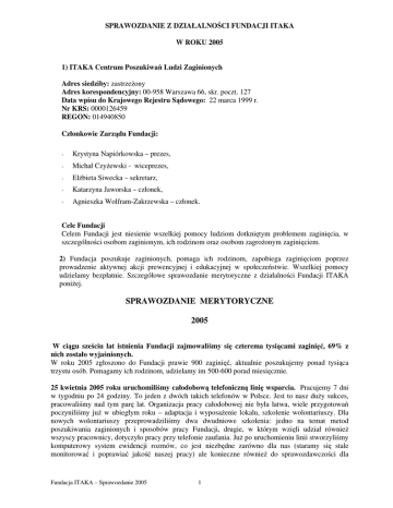 SPRAWOZDANIE Z DZIAŁALNO CI FUNDACJI ITAKA W ROKU 2005 1) ITAKA Centrum Poszukiwa Ludzi Zaginionych Adres siedziby: zastrze ony Adres korespondencyjny: 00-958 Warszawa 66, skr. poczt. 127 Data wpisu do Krajowego Rejestru S dowego: 22 marca 1999 r. Nr KRS: 0000126459 REGON: 014940850 Członkowie Zarz du Fundacji: - Krystyna Napiórkowska – prezes, - Michał Czy ewski - wiceprezes, - El bieta Siwecka – sekretarz, - Katarzyna Jaworska – członek, - Agnieszka Wolfram-Zakrzewska – członek. Cele Fundacji Celem Fundacji jest niesienie wszelkiej pomocy ludziom dotkni tym problemem zagini cia, w szczególno ci osobom zaginionym, ich rodzinom oraz osobom zagro onym zagini ciem. 2) Fundacja poszukuje zaginionych, pomaga ich rodzinom, zapobiega zagini ciom poprzez prowadzenie aktywnej akcji prewencyjnej i edukacyjnej w społecze stwie. Wszelkiej pomocy udzielamy bezpłatnie. Szczegółowe sprawozdanie merytoryczne z działalno ci Fundacji ITAKA poni ej. SPRAWOZDANIE MERYTORYCZNE 2005 W ci gu sze ciu lat istnienia Fundacji zajmowali my si czterema tysi cami zagini , 69% z nich zostało wyja nionych. W roku 2005 zgłoszono do Fundacji prawie 900 zagini , aktualnie poszukujemy ponad tysi ca trzystu osób. Pomagamy ich rodzinom, udzielamy im 500-600 porad miesi cznie. 25 kwietnia 2005 roku uruchomili my całodobow telefoniczn lini wsparcia. Pracujemy 7 dni w tygodniu po 24 godziny. To jeden z dwóch takich telefonów w Polsce. Jest to nasz du y sukces, pracowali my nad tym par lat. Organizacja pracy całodobowej nie była łatwa, wiele przygotowa poczynili my ju w ubiegłym roku – adaptacja i wyposa enie lokalu, szkolenie wolontariuszy. Dla nowych wolontariuszy przeprowadzili my dwa dwudniowe szkolenia: jedno na temat metod poszukiwania zaginionych i sposobów pracy Fundacji, drugie, w którym wzi li udział równie wszyscy pracownicy, dotyczyło pracy przy telefonie zaufania. Ju po uruchomieniu linii stworzyli my komputerowy system ewidencji rozmów, co jest niezb dne zarówno dla nas (staramy si stale monitorowa i poprawia jako naszej pracy) ale konieczne równie do sprawozdawczo ci dla Fundacja ITAKA – Sprawozdanie 2005 1 Komisji Europejskiej, od której otrzymali my grant na lini wsparcia. Nadal mamy wiele pracy organizacyjnej, ale po kilku miesi cach jest nam ju znacznie łatwiej. Przed uruchomieniem linii pracownicy Fundacji odbyli wizyty studyjne w podobnych do naszej organizacjach w Londynie (National Missing Persons Helpline) i Brukseli (Child Focus). Uczyli si tam, jak zorganizowa prac całodobow , jakie metody poszukiwa stosuj te organizacje, z jakimi problemami zwracaj si osoby dzwoni ce do telefonu zaufania. Numer 0-801 24 70 70, finansowany przez Telekomunikacj Polsk pozwala potrzebuj cym z całej Polski dzwoni do nas prawie za darmo – płaci si tylko za pierwszy impuls (35 groszy brutto). Dy ury przy telefonie s finansowane głównie z dotacji Funduszu DAPHNE Komisji Europejskiej. Linia wsparcia jest przeznaczona zarówno dla rodzin zaginionych, które mog uzyska rad i pomoc natychmiast, o ka dej porze dnia i nocy jak i dla samych zaginionych, a przede wszystkim dla młodych ludzi, którzy maj ró ne problemy i niejednokrotnie, nie radz c sobie z nimi, planuj ucieczk z domu. Przy telefonie dy uruj pracownicy Fundacji – psychologowie, prawnicy, pracownicy socjalni, specjali ci ds. zagini cia oraz przeszkoleni wolontariusze. Psychologowie i pracownik socjalny s codziennie, prawnicy dwa razy w tygodniu. Poł czyli my w ten sposób dwa dawne projekty – Telefon Zaufania i Zespół Poszukiwa i Identyfikacji. Ka dy z pracowników i wolontariuszy potrafi przyj zgłoszenie zagini cia, udzieli podstawowych porad rodzinom zaginionych, rozmawia z dzwoni cymi osobami w sytuacji kryzysowej. Nast pnie przekazuje spraw odpowiednim specjalistom, którzy mog lepiej pomóc w rozwi zaniu trudnych problemów. Coraz wi cej pracy maj nasi psychologowie – do całodobowego telefonu dzwoni ludzie załamani, cz sto z my lami samobójczymi, młodzie z problemami wieku dojrzewania. Psychologowie cz sto podejmuj mediacj pomi dzy młodymi lud mi i ich rodzinami a tak e pomi dzy osobami, które odeszły z domu i wahaj si , czy wróci i ich bliskimi. Zwi ksza si ilo udzielanych porad prawnych i socjalnych, obejmujemy rodziny zaginionych coraz pełniejsz i bardziej kompetentn opiek . Staramy si rozszerza i doskonali metody poszukiwania zaginionych – dbamy o dobre kontakty z mediami, pracujemy nad podpisaniem umów o współpracy z przedsi biorstwami taksówkowymi w innych du ych miastach (z MPT współpracujemy ju od kilku lat), ro nie ilo ludzi odnalezionych dzi ki naszej stronie internetowej, ci le współpracujemy z policj i o rodkami pomocy społecznej. Rozpocz li my nowy projekt we współpracy z sieci hipermarketów Tesco – drukujemy plakaty ze zdj ciami zaginionych i wywieszamy je w 52 sklepach Tesco w całej Polsce. Pracownicy Tesco otrzymali te od nas broszury ze zdj ciami zaginionych i zostali pouczeni, co robi je li zauwa kogo poszukiwanego albo młodych ludzi wygl daj cych na uciekinierów. Otrzymujemy coraz wi cej zgłosze zagini za granic . Prowadz c te poszukiwania coraz cz ciej kontaktujemy si z polskimi słu bami konsularnymi i MSZ, nawi zujemy w razie potrzeby kontakty z policj w krajach zagini cia (przede wszystkim Unii Europejskiej). Spotkania grup wsparcia dla rodzin zaginionych odbywaj si spotkania dla osób w ałobie. dwa razy w miesi cu – osobne www.zaginieni.pl – strony internetowe Fundacji ITAKA odwiedza miesi cznie ponad 100 tysi cy internautów. To znaczny wzrost w stosunku do roku ubiegłego. Zanotowali my ju trzy miliony wizyt na naszych stronach. Kontynuujemy program “Nie uciekaj” skierowany do młodzie y, nauczycieli, rodziców. Nasi trenerzy prowadz w warszawskich gimnazjach warsztaty, podczas których pokazuj młodzie y, jak rozwi zywa problemy, tak aby ucieczka nie była jedynym wyj ciem z trudnej sytuacji. Zaj cia ciesz si du ym powodzeniem, szczególni