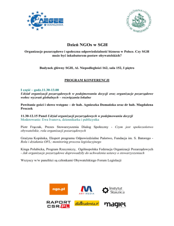 Dzień NGOs w SGH Organizacje pozarządowe i społeczna odpowiedzialność biznesu w Polsce. Czy SGH może być inkubatorem postaw obywatelskich? Budynek główny SGH, Al. Niepodległości 162, sala 152, I piętro PROGRAM KONFERENCJI I część – godz.11.30-13.00 Udział organizacji pozarządowych w podejmowaniu decyzji oraz organizacje pozarządowe wobec wyzwań globalnych – rozwiązania lokalne Powitanie gości i słowo wstępne – dr hab. Agnieszka Domańska oraz dr hab. Magdalena Proczek 11.30-12.15 Panel Udział organizacji pozarządowych w podejmowaniu decyzji Moderowanie: Ewa Ivanova, dziennikarka i publicystka Piotr Frączak, Prezes Stowarzyszenia Dialog Społeczny - Czym jest społeczeństwo obywatelskie, rola organizacji pozarządowych Grażyna Kopińska, Ekspert programu Odpowiedzialne Państwo, Fundacja im. S. Batorego Rola i działania OFL; monitoring procesu legislacyjnego Kinga Polubicka, Program Rzeczniczy, Ogólnopolska Federacja Organizacji Pozarządowych - Jak organizacje pozarządowe doprowadziły do uchwalenia ustawy o stowarzyszeniach Wszyscy w/w paneliści są członkami Obywatelskiego Forum Legislacji 12.15-13.00 Panel Organizacje pozarządowe wobec wyzwań globalnych – rozwiązania lokalne Moderowanie: dr hab. Magdalena Proczek dr Marta Pachocka, Sekretarz PECSA - Polskiego Stowarzyszenia Badań Wspólnoty Europejskiej - Rola organizacji pozarządowych w dobie kryzysu uchodźczego 2014+ w UE Elmi Abdi, Prezes Fundacji dla Somalii - Strach przed imigrantami – czy jest na to rozwiązanie? Olga Korycińska, Prezes Zarządu Fundacji SASA - Zdrowie bez granic 13.00-13.45 Przerwa kawowa i lunch II część – godz.13.45-15.15 Organizacje pozarządowe w Polsce – współpraca z biznesem i społeczeństwem wobec potrzeb finansowych i doświadczeń codziennej praktyki. Jak zbudować własną NGOs - spojrzenie wizjonera a spodziewane wsparcie i przeszkody 13.45.-14.45 Panel Organizacje pozarządowe w Polsce – współpraca z biznesem i społeczeństwem wobec potrzeb finansowych i doświadczeń codziennej praktyki Moderowanie: dr hab. Agnieszka Domańska Włodzimierz Dola, Prezes Fundacji Inicjatyw Młodzieżowych oraz Katarzyna Gorzkowska, członek zespołu merytorycznego Inicjatywy Mieszkańców Warszawy - Formy współpracy NGO z biznesem Monika Dargas-Miszczak, Prezes Zarządu Fundacji Strefa Innowacji - Współpraca przedsiębiorstw z organizacjami pozarządowymi – korzyści i zagrożenia Paula Jeżak, Specjalista w Dziale Relacji z Biznesem, WWF Polska, Przemysław Różycki UPM Raflatac - Rzeki dla Życia - jak biznes może ratować przyrodę Dorota Pieńkowska, Dyrektor PAFPIO - Instrumenty zwrotne jako sposób podtrzymania płynności NGOs Ewa Świerz, Fundacja United Way Polska - Alternatywne sposoby finansowania działalności społecznej na przykładzie narzędzi on-line (sklep internetowy) 14.45-15.15 Panel Jak zbudować własną NGO - spojrzenie wizjonera a spodziewane wsparcie i przeszkody Moderowanie: dr hab. Agnieszka Domańska Przedstawiciele Fundacji Integracja - Socialenterprise – potrzebujący pomocy sami tworzą własną firmę. Czy taka forma finansowania NGOs może stać się powszechna? Wiktor Świetlik, Viceprezes Instytutu Staszica oraz Piotr Gursztyn, Dyrektor TVP Historia Od pomysłu do „przemysłu” – czyli jak stworzyć i rozwijać własną organizację na przykładzie think-tanku. Jakie czekają nas radości i profity? Jakie wyzwania i trudności? Pragniemy pokazać, że SGH jako czołowa uczelnia ekonomiczna w Polsce nie tylko uczy ekonomii i biznesu, ale upowszechniania idee społeczne i dobre praktyki społecznej odpowiedzialności biznesu. W ramach dyskusji panelowej zastanowimy się, czy zasadne jest stworzenie w budynkach kampusu SGH miejsca spotkań społeczności akademickiej SGH z przedstawicielami NGOs o roboczej nazwie „Inkubator Postaw Obywatelskich w SGH” lub „Inkubator Społecznie Zaangażowanego Biznesu w SGH”. Podsumowanie i zakończenie konferencji PATRONAT MERYTORYCZNY ORGANIZATORZY Instytut Studiów Międzynarodowych, SGH Katedra Unii Europejskiej im. J. Monneta, SGH Jean Monnet Centre of Excellence at Warsaw School of Economics Europejskie Forum Studentów AEGEE-Warszawa