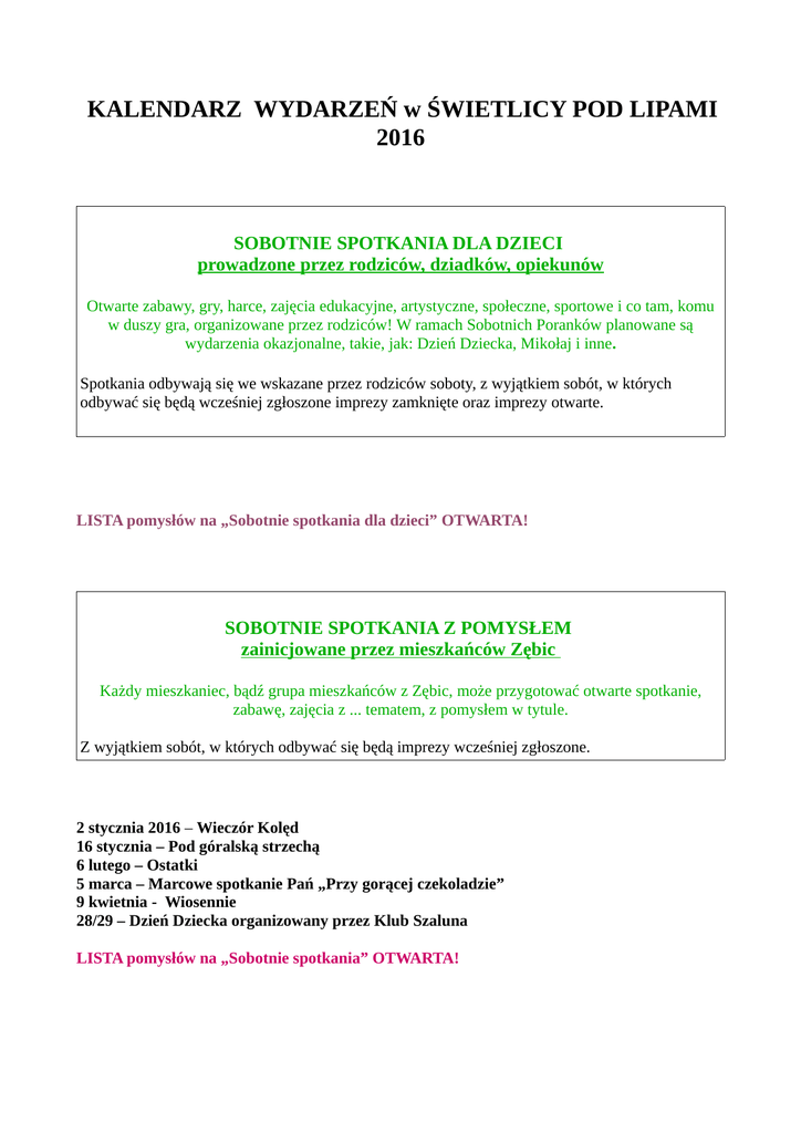 KALENDARZ WYDARZEŃ w ŚWIETLICY POD LIPAMI