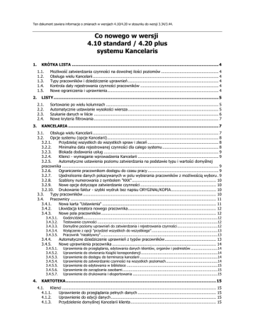 Ten dokument zawiera informacje o zmianach w wersjach 4.10/4.20 w stosunku do wersji 3.34/3.44. Co nowego w wersji 4.10 standard / 4.20 plus systemu Kancelaris 1. KRÓTKA LISTA ........................................................................................................................ 4 1.1. 1.2. 1.3. 1.4. 1.5. 2. LISTY....................................................................................................................................... 5 2.1. 2.2. 2.3. 2.4. 3. Możliwość zatwierdzania czynności na dowolnej ilości poziomów ............................................... 4 Obsługa wielu Kancelarii ....................................................................................................... 4 Typy pracowników i dziedziczenie uprawnień .......................................................................... 4 Kontrola daty rejestrowania czynności pracowników ................................................................ 4 Nowe ograniczenia i uprawnienia........................................................................................... 4 Sortowanie po wielu kolumnach ............................................................................................ 5 Automatycznie ustawianie wysokości wiersza .......................................................................... 5 Szukanie danych w liście ...................................................................................................... 6 Nowe kryteria filtrowania ...................................................................................................... 7 KANCELARIA ........................................................................................................................... 7 3.1. Obsługa wielu Kancelarii ....................................................................................................... 7 3.2. Opcje systemu (opcje Kancelarii) ........................................................................................... 8 3.2.1. Przydzielaj wszystkich do wszystkich spraw i zleceń .......................................................... 8 3.2.2. Minimalna data rejestrowanej czynności dla całego systemu .............................................. 8 3.2.3. Blokada dodawania usług .............................................................................................. 9 3.2.4. Klienci - wymaganie wprowadzenia Kancelarii .................................................................. 9 3.2.5. Automatyczne ustawienia poziomu zatwierdzania na podstawie typu i wartości domyślnej pracownika ................................................................................................................................ 9 3.2.6. Ograniczenie pracownikom dostępu do czasu pracy .......................................................... 9 3.2.7. Ujednolicenie danych pokazywanych w polu wybierania pracowników z możliwością wyboru . 9 3.2.8. Szablony numerowania z symbolem "KKK"..................................................................... 10 3.2.9. Nowe opcje dotyczące zatwierdzanie czynności .............................................................. 10 3.2.10. Drukowanie faktur - szybki wydruk bez napisu ORYGINAŁ/KOPIA..................................... 10 3.3. Typy pracowników ............................................................................................................. 10 3.4. Pracownicy ....................................................................................................................... 11 3.4.1. Nowa karta "Ustawienia" ............................................................................................. 11 3.4.2. Likwidacja kreatora nowego pracownika........................................................................ 12 3.4.3. Nowe pola pracowników .............................................................................................. 12 3.4.3.1. 3.4.3.2. 3.4.3.3. 3.4.3.4. 3.4.3.5. 3.4.4. 3.4.5. 3.4.5.1. 3.4.5.2. 3.4.5.3. 3.4.5.4. 3.4.5.5. 3.4.5.6. 3.4.5.7. 4. Godzin/dzień..................................................................................................................................12 Testowanie czynności ....................................................................................................................12 Domyślne poziomy uprawnień do zatwierdzania i rejestrowania czynności .......................................12 Wyłączenie z opcji "przydziel wszystkich do wszystkiego"................................................................13 Pracownik "nieaktywny" .................................................................................................................13 Automatyczne dziedziczenie uprawnień z typów pracowników.......................................... 13 Nowe uprawnienia pracownika ..................................................................................... 14 Uprawnienia do Uprawnienie do Uprawnienie do Uprawnienie do Uprawnienie do Uprawnienie do Uprawnienie do przeglądania, edytowania danych klientów, organów i podmiotów ..........................14 otwierania Książki korespondencji ..........................................................................14 dostępu do terminarza kancelarii ...........................................................................14 zatwierdzanie czynności na wszystkich poziomach..................................................14 edytowania w bibliotece ........................................................................................15 zarządzania zasobami............................................................................................15 drukowania i eksportowania ..................................................................................15 KARTOTEKA........................................................................................................................... 15 4.1. Klienci .........