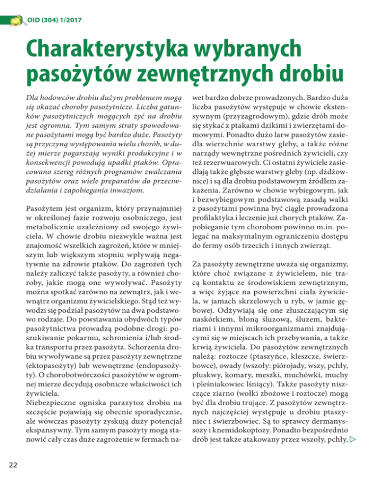 OID (304) 1/2017 OID (267) 12/2013 Charakterystyka wybranych pasożytów zewnętrznych drobiu Dla hodowców drobiu dużym problemem mogą się okazać choroby pasożytnicze. Liczba gatunków pasożytniczych mogących żyć na drobiu jest ogromna. Tym samym straty spowodowane pasożytami mogą być bardzo duże. Pasożyty są przyczyną występowania wielu chorób, w dużej mierze pogarszają wyniki produkcyjne i w konsekwencji powodują upadki ptaków. Opracowano szereg różnych programów zwalczania pasożytów oraz wiele preparatów do przeciwdziałania i zapobiegania inwazjom. Pasożytem jest organizm, który przynajmniej w określonej fazie rozwoju osobniczego, jest metabolicznie uzależniony od swojego żywiciela. W chowie drobiu niezwykle ważna jest znajomość wszelkich zagrożeń, które w mniejszym lub większym stopniu wpływają negatywnie na zdrowie ptaków. Do zagrożeń tych należy zaliczyć także pasożyty, a również choroby, jakie mogą one wywoływać. Pasożyty można spotkać zarówno na zewnątrz, jak i wewnątrz organizmu żywicielskiego. Stąd też wywodzi się podział pasożytów na dwa podstawowo rodzaje. Do powstawania obydwóch typów pasożytnictwa prowadzą podobne drogi: poszukiwanie pokarmu, schronienia i/lub środka transportu przez pasożyta. Schorzenia drobiu wywoływane są przez pasożyty zewnętrzne (ektopasożyty) lub wewnętrzne (endopasożyty). O chorobotwórczości pasożytów w ogromnej mierze decydują osobnicze właściwości ich żywiciela. Niebezpieczne ogniska parazytoz drobiu na szczęście pojawiają się obecnie sporadycznie, ale wówczas pasożyty zyskują duży potencjał ekspansywny. Tym samym pasożyty mogą stanowić cały czas duże zagrożenie w fermach na22 wet bardzo dobrze prowadzonych. Bardzo duża liczba pasożytów występuje w chowie ekstensywnym (przyzagrodowym), gdzie drób może się stykać z ptakami dzikimi i zwierzętami domowymi. Ponadto dużo larw pasożytów zasiedla wierzchnie warstwy gleby, a także różne narządy wewnętrzne pośrednich żywicieli, czy też rezerwuarowych. Ci ostatni żywiciele zasiedlają także głębsze warstwy gleby (np. dżdżownice) i są dla drobiu podstawowym źródłem zakażenia. Zarówno w chowie wybiegowym, jak i bezwybiegowym podstawową zasadą walki z pasożytami powinna być ciągle prowadzona profilaktyka i leczenie już chorych ptaków. Zapobieganie tym chorobom powinno m.in. polegać na maksymalnym ograniczeniu dostępu do fermy osób trzecich i innych zwierząt. Za pasożyty zewnętrzne uważa się organizmy, które choć związane z żywicielem, nie tracą kontaktu ze środowiskiem zewnętrznym, a więc żyjące na powierzchni ciała żywiciela, w jamach skrzelowych u ryb, w jamie gębowej. Odżywiają się one złuszczającym się naskórkiem, błoną śluzową, śluzem, bakteriami i innymi mikroorganizmami znajdującymi się w miejscach ich przebywania, a także krwią żywiciela. Do pasożytów zewnętrznych należą: roztocze (ptaszyńce, kleszcze, świerzbowce), owady (wszoły: piórojady, wszy, pchły, pluskwy, komary, meszki, muchówki, muchy i pleśniakowiec lśniący). Także pasożyty niszczące ziarno (wołki zbożowe i roztocze) mogą być dla drobiu trujące. Z pasożytów zewnętrznych najczęściej występuje u drobiu ptaszyniec i świerzbowiec. Są to sprawcy dermanyssozy i knemidokoptozy. Ponadto bezpośrednio drób jest także atakowany przez wszoły, pchły, OID (304) 1/2017 OID (267) 12/2013 pośrednio zaś - przez muchy domowe, chrząszcze, komary, pluskwy, muchówki. Choroby pasożytnicze w dużej mierze dotyczą ptaków młodych. Zarażają się one od ptaków starszych, które mogą być nie tylko żywicielami, ale i przenosicielami kolejnych inwazji. Ptaki źle karmione (źle zbilansowana dawka pokarmowa pod względem witamin czy składników mineralnych) są podatniejsze na inwazje pasożytnicze. Wymienione niedobory żywieniowe prowadzić mogą do zaburzeń przemiany materii i tym samym do zmniejszenia odporności. Właściwy poziom witamin i składników mineralnych odgrywają bardzo dużą rolę w procesach odpornościowych na pasożytnicze inwazje. W organizmie ptaka odpornego larwy osiadłe w tkankach dłużej pozostają w uśpieniu, nie rosną i nie prowadzą do powstawania objawów klinicznych. Przy przypadkowym zarażeniu pasożytami ptaka dobrze odżywionego zazwyczaj nie dochodzi do powstania choroby albo też okres jej wylęgania jest znacznie dłuższy. Jeżeli już dochodzi do zarażenia to przebieg choroby jest bardzo łagodny. Rozwój pasożytów w środowisku jest ściśle związany z warunkami atmosferycznymi. Duży wpływ na rozwój pasożytów ma m.in. temperatura, wilgotność, a na wybiegach także ich nasłonecznienie. Działanie inwazyjne pasożytów może się w bardzo różny sposób przejawiać: niektóre z nich są zaopatrzone w narządy czepne typu: haki, zęby, kolce - za pomocą których ranią tkanki swego żywiciela, powstałe rany z kolei to miejsca wnikania bakterii i wirusów chorobotwórczych, poprzez wydalanie swoich produktów przemiany materii pasożyty oddziaływają na swojego żywiciela trująco i uczulająco. Ptaszyniec kurzy (Dermanyssus gallinae) Ptaszyniec kurzy jest bardzo szkodliwym i dokuczliwym pasożytem zewnętrznym drobiu. Jest on plagowym pasożytem drobiu grzebiącego (atakuje kury, indyki, perlice, bażanty), 24 a także innych ptaków (gołębie, różne ptaki dzikie), ssaków a nawet człowieka. Może atakować ptaki w każdym wieku i utrzymywane różnymi sposobami (nawet w chowie klatkowym). Ciało ptaszyńca kurzego (Dermanyssus gallinae) jest spłaszczone, kształtu gruszkowatego, o szarej barwie, długości od 0,7 do 0,9 mm, szerokości od 0,4 do 0,5 mm. Ich pokrycie ciała jest bardzo rozciągliwe i po najedzeniu się przybierają prawie kulisty kształt, ubarwienie mają czerwone lub brunatne, a gdy krew jest trawiona, przez pokrycie ciała widoczny jest zarys jelita. Mają mocn