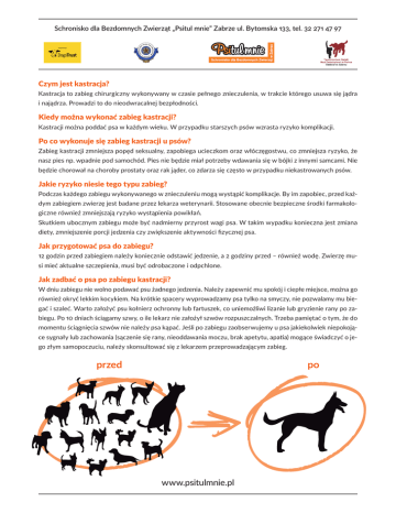 Schronisko dla Bezdomnych Zwierząt „Psitul mnie” Zabrze ul. Bytomska 133, tel. 32 271 47 97 Czym jest kastracja? Kastracja to zabieg chirurgiczny wykonywany w czasie pełnego znieczulenia, w trakcie którego usuwa się jądra i najądrza. Prowadzi to do nieodwracalnej bezpłodności. Kiedy można wykonać zabieg kastracji? Kastracji można poddać psa w każdym wieku. W przypadku starszych psów wzrasta ryzyko komplikacji. Po co wykonuje się zabieg kastracji u psów? Zabieg kastracji zmniejsza popęd seksualny, zapobiega ucieczkom oraz włóczęgostwu, co zmniejsza ryzyko, że nasz pies np. wpadnie pod samochód. Pies nie będzie miał potrzeby wdawania się w bójki z innymi samcami. Nie będzie chorował na choroby prostaty oraz rak jąder, co zdarza się często w przypadku niekastrowanych psów. Jakie ryzyko niesie tego typu zabieg? Podczas każdego zabiegu wykonywanego w znieczuleniu mogą wystąpić komplikacje. By im zapobiec, przed każdym zabiegiem zwierzę jest badane przez lekarza weterynarii. Stosowane obecnie bezpieczne środki farmakologiczne również zmniejszają ryzyko wystąpienia powikłań. Skutkiem ubocznym zabiegu może być nadmierny przyrost wagi psa. W takim wypadku konieczna jest zmiana diety, zmniejszenie porcji jedzenia czy zwiększenie aktywności fizycznej psa. Jak przygotować psa do zabiegu? 12 godzin przed zabiegiem należy koniecznie odstawić jedzenie, a 2 godziny przed – również wodę. Zwierzę musi mieć aktualne szczepienia, musi być odrobaczone i odpchlone. Jak zadbać o psa po zabiegu kastracji? W dniu zabiegu nie wolno podawać psu żadnego jedzenia. Należy zapewnić mu spokój i ciepłe miejsce, można go również okryć lekkim kocykiem. Na krótkie spacery wyprowadzamy psa tylko na smyczy, nie pozwalamy mu biegać i szaleć. Warto założyć psu kołnierz ochronny lub fartuszek, co uniemożliwi lizanie lub gryzienie rany po zabiegu. Po 10 dniach ściągamy szwy, o ile lekarz nie założył szwów rozpuszczalnych. Trzeba pamiętać o tym, że do momentu ściągnięcia szwów nie należy psa kąpać. Jeśli po zabiegu zaobserwujemy u psa jakiekolwiek niepokojące sygnały lub zachowania (sączenie się rany, nieoddawania moczu, brak apetytu, apatia) mogące świadczyć o jego złym samopoczuciu, należy skonsultować się z lekarzem przeprowadzającym zabieg. przed po www.psitulmnie.pl Towarzystwo Opieki nad Zwierzętami w Polsce / Oddział w Zabrzu Czym jest sterylizacja? Sterylizacja to zabieg chirurgiczny wykonywany w czasie pełnego znieczulenia, w trakcie którego usuwa się jajniki, jajowody i macicę. Prowadzi on do nieodwracalnej bezpłodności. Kiedy można wykonać zabieg sterylizacji? Zabiegowi sterylizacji można poddać sukę w każdym wieku. Ważne, aby w czasie sterylizacji nie miała cieczki. Po co wykonuje się zabieg sterylizacji u suk? – U suki nie występuje cieczka, co zabezpiecza przed niechcianymi szczeniakami, a w konsekwencji zmniejsza populację i tak licznej już grupy bezdomnych psów. – Zabieg chroni naszą sukę przed chorobami narządów rodnych typu ropomacicze, nowotwory jajników, nowotwory sutków. – Po zabiegu u suki nie występuje ciąża urojona, której objawy są bardzo uciążliwe dla właścicieli (suka gromadzi przedmioty, zabawki do legowiska i nie pozwala do niego podejść, ponieważ traktuje je jak swoje młode). Czy można sterylizować zwierzę, jeśli podejrzewamy, że jest w ciąży? Ciąża nie jest przeciwwskazaniem do zabiegu sterylizacji. Sterylizacja aborcyjna niesie za sobą większe ryzyko podobne do cesarskiego cięcia, ale pod okiem specjalisty nie powinno się nic złego wydarzyć. Jakie ryzyko niesie tego typu zabieg? Podczas każdego zabiegu wykonywanego w znieczuleniu mogą wystąpić komplikacje. By im zapobiec, przed każdym zabiegiem zwierzę jest badane przez lekarza weterynarii. Stosowane obecnie bezpieczne środki farmakologiczne również zmniejszają ryzyko wystąpienia powikłań. Skutkiem ubocznym zabiegu może być nadmierny przyrost wagi suki. W takim wypadku konieczna jest zmiana diety, zmniejszenie porcji jedzenia czy zwiększenie aktywności fizycznej suki. Bardzo rzadko może wystąpić nietrzymanie moczu, który to problem pozwolą uregulować odpowiednie leki. Czy to prawda, że suka powinna mieć przynajmniej raz w życiu szczenięta? Nieprawda!!! Nie ma medycznych dowodów na to, żeby suka musiała mieć młode. Ciąża nie uchroni jej przed chorobami narządów rodnych, a może je nasilić. Ponadto bardzo często szczenięta rzekomo oddane w „dobre ręce” trafiają do już przepełnionych schronisk. Jak przygotować suczkę do zabiegu? 12 godzin przed zabiegiem należy koniecznie odstawić jedzenie, a 2 godziny przed – również wodę. Zwierzę musi mieć aktualne szczepienia, musi być odrobaczone i odpchlone. Suka nie może być w trakcie cieczki ani krótko po. Jak zadbać o sukę po zabiegu sterylizacji? W dniu zabiegu nie wolno podawać żadnego jedzenia. Należy zapewnić jej spokój i ciepłe miejsce, można ją również okryć lekkim kocykiem. Na krótkie spacery wyprowadzamy sukę tylko na smyczy, nie pozwalamy jej biegać i szaleć. Warto założyć suce kołnierz ochronny lub fartuszek, co uniemożliwi lizanie lub gryzienie rany po zabiegu. Po 10 dniach ściągamy szwy, o ile lekarz nie założył szwów rozpuszczalnych. Trzeba pamiętać, że do momentu ściągnięcia szwów nie należy psa kąpać. Jeśli po zabiegu zaobserwujemy u psa jakiekolwiek niepokojące sygnały lub zachowania (sączenie się rany, nieoddawania moczu, brak apetytu, apatia) mogące świadczyć o jego złym samopoczuciu, należy skonsultować się z lekarzem przeprowadzającym zabieg. www.psitulmnie.pl