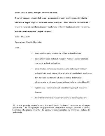 Temat dnia : 5 porcji warzyw, owoców lub soku. 5 porcji warzyw, owoców lub soku – poszerzenie wiedzy o zdrowym odżywianiu człowieka. Super Piątka – kolorowe owoce, warzywa i soki. Badanie cech owoców i warzyw różnymi zmysłami. Zabawy ruchowe z wykorzystaniem owoców i warzyw. Zadania matematyczne „Super – Piątki”. Data : 20.12.2010 Prowadząca: Kamila Marciniak Cele: poszerzenie wiedzy o zdrowym odżywianiu człowieka; utrwalenie wiedzy na temat owoców, warzyw i soków oraz ich znaczenia w diecie człowieka; umiejętności: czytania ze zrozumieniem, wykorzystywania w praktyce informacji zawartych w tekście; wypowiadania swoich sądów na określony temat i ich uzasadniania; dodawania i odejmowania w zakresach przewidzianych dla uczniów klasy III; wyróżnianie i nazywanie cech charakterystycznych owoców i warzyw; próby rozpoznawania owoców i warzyw za pomocą zmysłów. Uczniowie poznają bohaterów oraz ich upodobania „kulinarne” związane ze zdrowym żywieniem – ze szczególnym uwzględnieniem spożywania warzyw, owoców i soków, korzystają z Książeczki (zeszytu ) dla ucznia, w którym znajdują się ćwiczenia i zadania do wykonania. Pomoce i materiały: Książeczki dla uczniów, 2 duże kartki szarego papieru pakowego, kartki z tekstem „Kolorowe warzywa i owoce”, kolorowe gazety ze zdjęciami warzyw i owoców, nożyczki, klej, kartki papieru w 5 kolorach (czarny, biały, czerwony, zielony, żółty), białe kartki papieru, kolorowe mazaki i biała kreda (do zakreślania pętli), warzywa i owoce sezonowe przyniesione przez uczniów, ekologiczna torba na produkty, woreczki w 5 kolorach (biały, czerwony, zielony, niebieski, pomarańczowy 1 1. Wprowadzenie. Nauczyciel rozdaje uczniom „Książeczkę”. Poleca, aby szybko ją obejrzeli i odpowiedzieli, jakiego tematu dotyczy (2–3 minuty). Na dużej kartce papieru (1) zapisuje podawane przez uczniów pomysły. Podsumowuje, że po dzisiejszej lekcji okaże się, kto z nich miał rację i trafnie odgadł temat. Nauczyciel przeprowadza pierwsze badanie wiedzy. 2. Poznaj Super-Piątkę. Nauczyciel czyta sam lub wybiera jednego z uczniów, aby przeczytał tekst z „Książeczki” (2 strona): Cześć! Super-Piątka to my: Mary, Max, Sara, Alex i Diana. Jesteśmy grupą dobrych przyjaciół, którzy bardzo lubią owoce, warzywa i soki. Dużo o nich wiemy i dlatego chcemy podzielić się z Wami naszą wiedzą. Przygotowaliśmy dla Was książeczkę z różnymi zagadkami, zadaniami i łamigłówkami. Zapraszamy do wspólnej nauki i zabawy. Nauczyciel poleca, aby uczniowie wykonali zadanie nr 1. Uczniowie wymieniają na forum informacje uzyskane po wykonaniu zadania nr 1. Dzielą się wrażeniami, który z bohaterów Super-Piątki lubi te same owoce, warzywa lub soki, co dany uczeń. 3. Warzywa, owoce i soki Super-Piątki. Nauczyciel mówi, że Super-Piątka chce najpierw poznać, jakie warzywa, owoce i soki znają, jedzą i lubią uczniowie. Uczniowie ze zgromadzonych wcześniej gazet z kolorowymi zdjęciami produktów żywnościowych wycinają obrazy warzyw i owoców. Przyklejają je na dużej kartce papieru (2). Każdy z uczniów pisze (samodzielnie lub z pomocą nauczyciela) na kartce w linie lub rysuje, jakie owoce, warzywa i soki lubi jeść i pić najbardziej. Podpisane imieniem ucznia kartki przyklejane są wokół dużej kartki papieru. 4. Dyskusja. Dlaczego należy jeść warzywa, owoce i pić sok? Czy wystarczy jeść jeden rodzaj owocu, aby się zdrowo odżywiać? Dlaczego tak sądzicie? 5. Kolorowe owoce, warzywa i soki. Nauczyciel mówi, że Super-Piątka przygotowała ciekawe informacje o owocach i warzywach. Kilku chętnych uczniów losuje przygotowane w załączeniu (załącznik nr 1), wydrukowane przez nauczyciela kartki i odczytuje, jakie właściwości mają warzywa i owoce w danym kolorze i jakie są to warzywa, owoce i soki. A. Kartka czerwona: warzywa, owoce i soki zaliczane do grupy czerwonych to np.: pomidory, papryka czerwona, owoc granatu, jabłko, sok pomidorowy. Zawarte w nich składniki korzystnie wpływają na pracę serca. B. Kartka pomarańczowa: warzywa, owoce i soki zaliczane do grupy pomarańczowych to np.: marchewka, mango, banan, ananas, pomarańcza, sok marchwiowy, sok pomarańczowy. Zawarte w nich witaminy korzystnie wpływają na wzrok. C. Kartka fioletowa: warzywa i owoce zaliczane do grupy filoletowych to: czarna porzeczka, bakłażan, aronia. Zawarte w nich składniki korzystnie wpływają na kondycję całego organizmu. D. Kartka zielona: warzywa i owoce zaliczane do grupy zielonych to: agrest, ogórek, szpinak, sałata. Zawarte w nich witaminy wpływają na układ krwionośny i nerwowy E. Kartka biała: warzywa i owoce zaliczane do grupy białych to: cebula, kapusta pekińska, por, awokado. Mają one właściwości antybakteryjne i antywirusowe – zapobiegają między innymi przeziębieniom. Kartki uczniowie przyklejają do dużej kartki papieru (2). 6. Uczniowie na dużej kartce papieru (2) otaczają pętlami (w kolorach: czarny/czerwony/zielony/pomarańczowy/biały) warzywa i owoce w odpowiednim kolorze. II wersja: kilku chętnych uczniów zaznacza pętlami (w kolorach: czarny/czerwony/zielony/pomarańczowy/biały) zdjęcia odpowiednich warzyw i owoców. 7. Badamy różnymi zmysłami cechy owoców, warzyw i soku. Praca w grupach. Metoda pracy we współpracy. Nauczyciel spośród uczniów wybiera trzech przedstawicieli grup. W tajemnicy wręcza im plakietki z kolorami : czerwonym, zielonym i niebieskim. Uczniowie ci będą w różnych grupach ze względu na to, że są dziećmi z niepełnosprawnością intelektualną ( lub uczniowie mający trudności w nauce). 2 SPOSOBY BADANIA OWOCU JABŁKA WZROK Wielkość Kolor duże małe czerwone zielone malutkie średniej wielkości żółte czerwonożółte WĘCH DOTYK SMAK pachnące twarde słodkie bez zapachu miękkie kwaśne chropowate szorstkie soczyste smaczne Badający:......................................