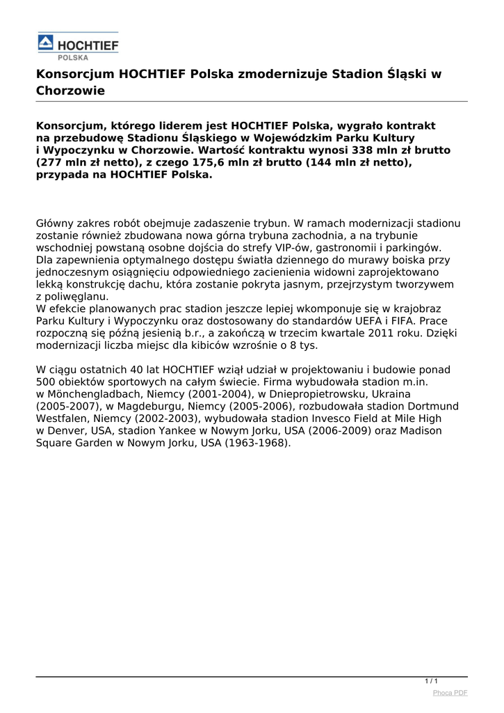 Konsorcjum HOCHTIEF Polska zmodernizuje Stadion Śląski w Chorzowie Konsorcjum, którego liderem jest HOCHTIEF Polska, wygrało kontrakt na przebudowę Stadionu Śląskiego w Wojewódzkim Parku Kultury i Wypoczynku w Chorzowie. Wartość kontraktu wynosi 338 mln zł brutto (277 mln zł netto), z czego 175,6 mln zł brutto (144 mln zł netto), przypada na HOCHTIEF Polska. Główny zakres robót obejmuje zadaszenie trybun. W ramach modernizacji stadionu zostanie również zbudowana nowa górna trybuna zachodnia, a na trybunie wschodniej powstaną osobne dojścia do strefy VIP-ów, gastronomii i parkingów. Dla zapewnienia optymalnego dostępu światła dziennego do murawy boiska przy jednoczesnym osiągnięciu odpowiedniego zacienienia widowni zaprojektowano lekką konstrukcję dachu, która zostanie pokryta jasnym, przejrzystym tworzywem z poliwęglanu. W efekcie planowanych prac stadion jeszcze lepiej wkomponuje się w krajobraz Parku Kultury i Wypoczynku oraz dostosowany do standardów UEFA i FIFA. Prace rozpoczną się późną jesienią b.r., a zakończą w trzecim kwartale 2011 roku. Dzięki modernizacji liczba miejsc dla kibiców wzrośnie o 8 tys. W ciągu ostatnich 40 lat HOCHTIEF wziął udział w projektowaniu i budowie ponad 500 obiektów sportowych na całym świecie. Firma wybudowała stadion m.in. w Mönchengladbach, Niemcy (2001-2004), w Dniepropietrowsku, Ukraina (2005-2007), w Magdeburgu, Niemcy (2005-2006), rozbudowała stadion Dortmund Westfalen, Niemcy (2002-2003), wybudowała stadion Invesco Field at Mile High w Denver, USA, stadion Yankee w Nowym Jorku, USA (2006-2009) oraz Madison Square Garden w Nowym Jorku, USA (1963-1968). 1/1 Phoca PDF Powered by TCPDF (www.tcpdf.org)