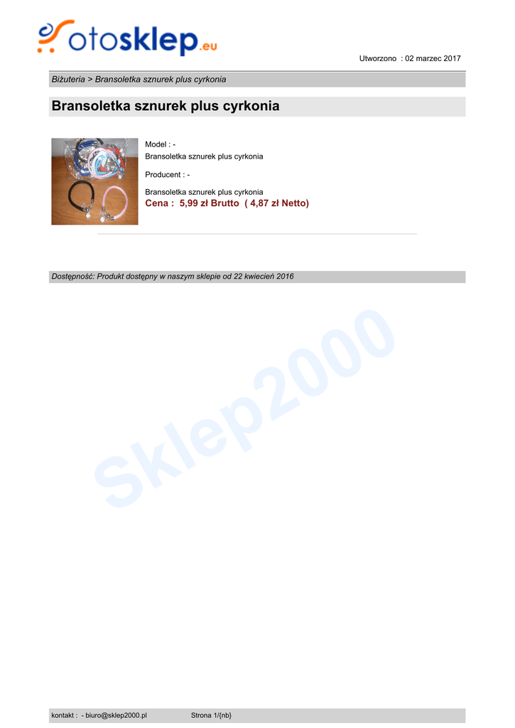 Utworzono : 02 marzec 2017 Biżuteria > Bransoletka sznurek plus cyrkonia Bransoletka sznurek plus cyrkonia Model : Bransoletka sznurek plus cyrkonia Producent : Bransoletka sznurek plus cyrkonia Cena : 5,99 zł Brutto ( 4,87 zł Netto) Dostępność: Produkt dostępny w naszym sklepie od 22 kwiecień 2016 0 2 p le k S kontakt : - [email protected] Strona 1/{nb} 0 0
