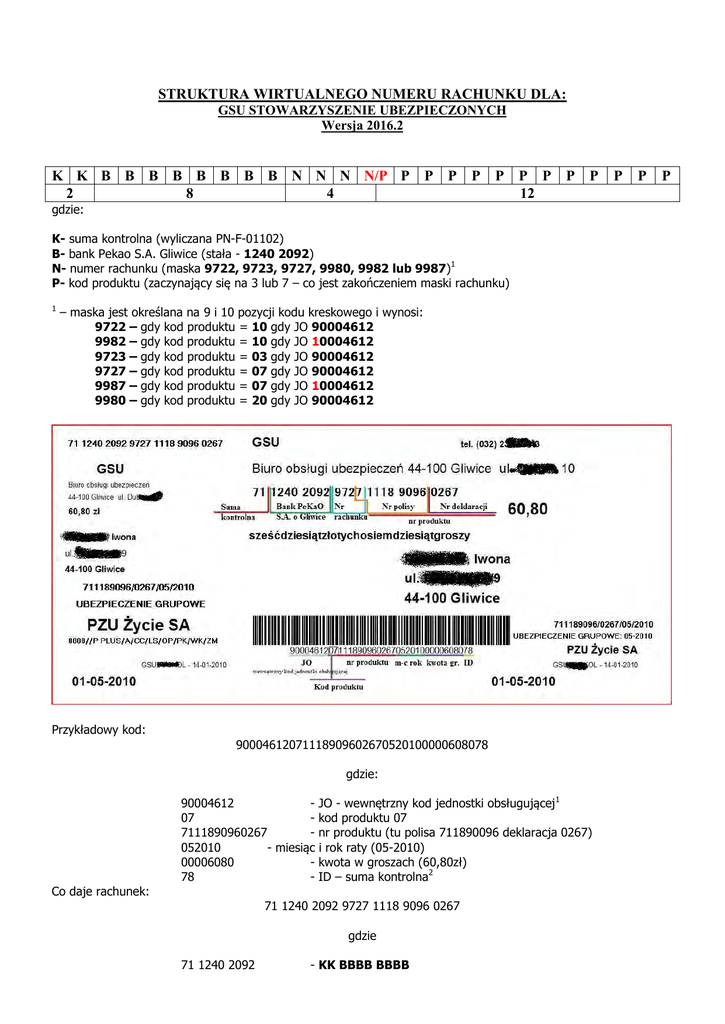 STRUKTURA WIRTUALNEGO NUMERU RACHUNKU DLA: GSU STOWARZYSZENIE UBEZPIECZONYCH Wersja 2016.2 K K B B B B B B B B N N N N/P P 2 8 4 P P P P P P 12 P P gdzie: K- suma kontrolna (wyliczana PN-F-01102) B- bank Pekao S.A. Gliwice (stała - 1240 2092) N- numer rachunku (maska 9722, 9723, 9727, 9980, 9982 lub 9987)1 P- kod produktu (zaczynający się na 3 lub 7 – co jest zakończeniem maski rachunku) 1 – maska jest określana na 9 i 10 pozycji kodu kreskowego i wynosi: 9722 – gdy kod produktu = 10 gdy JO 90004612 9982 – gdy kod produktu = 10 gdy JO 10004612 9723 – gdy kod produktu = 03 gdy JO 90004612 9727 – gdy kod produktu = 07 gdy JO 90004612 9987 – gdy kod produktu = 07 gdy JO 10004612 9980 – gdy kod produktu = 20 gdy JO 90004612 Przykładowy kod: 90004612071118909602670520100000608078 gdzie: Co daje rachunek: 90004612 - JO - wewnętrzny kod jednostki obsługującej1 07 - kod produktu 07 7111890960267 - nr produktu (tu polisa 711890096 deklaracja 0267) 052010 - miesiąc i rok raty (05-2010) 00006080 - kwota w groszach (60,80zł) 78 - ID – suma kontrolna2 71 1240 2092 9727 1118 9096 0267 gdzie 71 1240 2092 - KK BBBB BBBB P P P 2 9727 7 1118 9096 0267 Algorytm obliczania sumy kontrolnej: - NNNN/P - N/P PPPP PPPP PPPP 1) wyznaczamy kod: *) dla klienta: kod = 90004612(JO) + '10' + Nrklienta(zapisany na 12 znakach) + Miesiac(z daty raty zapisany na 2 znakach) + Rok(z daty raty zapisany na 4 znakach) + kwota (w groszach zapisana na 8 znakach) + '00' np. kod = '90004612100000001064391120110006050000' *) dla polisy: kod = 90004612(JO) + r + SeriaPolisy(bez pierwszego znaku) + NumerPolisy + Miesiac(z daty raty zapisany na 2 znakach) + Rok(z daty raty zapisany na 4 znakach) + kwota (w groszach zapisana na 8 znakach) + '00' r = '03' lub '07' np. kod = '90004612070000000008231218990000000000' 2) dopóki długość kodu jest różna od 0 powtarzamy: pom_lk = pierwsze 9 cyfr z kodu modulo 97 np. pom_lk = '95'; usuwamy z kodu pierwsze 9 cyfr np. kod = '70000000008231218990000000000' jeżeli długość kodu jest = 0 przerywamy iteracje kod = pom_lk + kod np. kod = '9570000000008231218990000000000' 3) wyznaczamy liczbę kontrolną: lk = 98 - pom_lk (z ostatniej iteracji) np. lk = 57 4) jeżeli długość lk jest równa 1 dodajemy 0 jako pierwszy znak lk Przykłady: 9722 – gdy kod produktu = 10 gdy JO 90004612 9982 – gdy kod produktu = 10 gdy JO 10004612 9723 – gdy kod produktu = 03 gdy JO 90004612 9727 – gdy kod produktu = 07 gdy JO 90004612 9987 – gdy kod produktu = 07 gdy JO 10004612 9980 – gdy kod produktu = 20 gdy JO 90004612