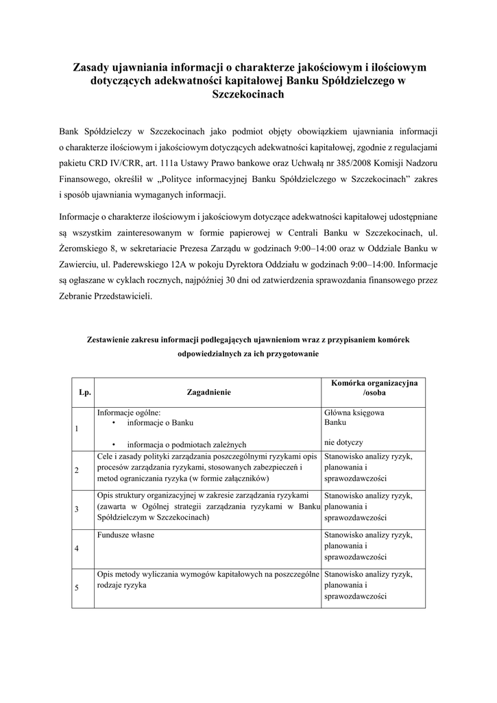Zasady ujawniania informacji o charakterze jakościowym i ilościowym dotyczących adekwatności kapitałowej Banku Spółdzielczego w Szczekocinach Bank Spółdzielczy w Szczekocinach jako podmiot objęty obowiązkiem ujawniania informacji o charakterze ilościowym i jakościowym dotyczących adekwatności kapitałowej, zgodnie z regulacjami pakietu CRD IV/CRR, art. 111a Ustawy Prawo bankowe oraz Uchwałą nr 385/2008 Komisji Nadzoru Finansowego, określił w „Polityce informacyjnej Banku Spółdzielczego w Szczekocinach” zakres i sposób ujawniania wymaganych informacji. Informacje o charakterze ilościowym i jakościowym dotyczące adekwatności kapitałowej udostępniane są wszystkim zainteresowanym w formie papierowej w Centrali Banku w Szczekocinach, ul. Żeromskiego 8, w sekretariacie Prezesa Zarządu w godzinach 9:00–14:00 oraz w Oddziale Banku w Zawierciu, ul. Paderewskiego 12A w pokoju Dyrektora Oddziału w godzinach 9:00–14:00. Informacje są ogłaszane w cyklach rocznych, najpóźniej 30 dni od zatwierdzenia sprawozdania finansowego przez Zebranie Przedstawicieli. Zestawienie zakresu informacji podlegających ujawnieniom wraz z przypisaniem komórek odpowiedzialnych za ich przygotowanie Lp. 1 2 3 Zagadnienie Komórka organizacyjna /osoba Informacje ogólne: • informacje o Banku Główna księgowa Banku • informacja o podmiotach zależnych Cele i zasady polityki zarządzania poszczególnymi ryzykami opis procesów zarządzania ryzykami, stosowanych zabezpieczeń i metod ograniczania ryzyka (w formie załączników) nie dotyczy Stanowisko analizy ryzyk, planowania i sprawozdawczości Opis struktury organizacyjnej w zakresie zarządzania ryzykami Stanowisko analizy ryzyk, (zawarta w Ogólnej strategii zarządzania ryzykami w Banku planowania i Spółdzielczym w Szczekocinach) sprawozdawczości Fundusze własne 4 Stanowisko analizy ryzyk, planowania i sprawozdawczości 5 Opis metody wyliczania wymogów kapitałowych na poszczególne Stanowisko analizy ryzyk, rodzaje ryzyka planowania i sprawozdawczości 6 7 8 9 10 Informacje ilościowe w zakresie adekwatności kapitałowej: 1. Kwoty wymogu kapitałowego z tytułu ryzyka kredytowego w podziale na kategorie ekspozycji. 2. Kwoty wymogu kapitałowego z tytułu ryzyka operacyjnego. Ryzyko kredytowe – informacje jakościowe: 1. Definicje należności przeterminowanych i zagrożonych stosowane dla celów rachunkowości 2. Opis metod przyjętych do ustalania korekt wartości rezerw, w tym rezerw na ryzyko ogólne Ryzyko kredytowe – informacje ilościowe: 1. Łączna kwota ekspozycji kredytowych według wyceny bilansowej, bez uwzględniania efektów technik redukcji ryzyka kredytowego. 2. Kwota ekspozycji w podziale na kategorie. 3. Struktura geograficzna ekspozycji w podziale na kategorie – nie dotyczy z uwagi na obszar działania. 4. Struktura branżowa ekspozycji w podziale na kategorie. 5. Struktura ekspozycji według okresów zapadalności w podziale na kategorie. 6. Wartość ekspozycji zagrożonych, w tym przeterminowanych oraz kwoty korekt wartości rezerw w podziale na istotne branże. 7. Wartość ekspozycji zagrożonych, w tym przeterminowanych oraz kwoty korekt wartości rezerw w podziale na obszary geograficzne – nie dotyczy z uwagi na obszar działania. Ekspozycje kapitałowe nieuwzględnione w portfelu handlowym – informacje jakościowe: 1. Podział ekspozycji ze względu na cel nabycia (zyski kapitałowe, przyczyny strategiczne). 2. Opis stosowanych metod wyceny. Ekspozycje kapitałowe nieuwzględnione w portfelu handlowym – informacje ilościowe: 1. Wartość bilansowa i wartość godziwa oraz dla papierów wartościowych notowanych na giełdzie porównanie ceny rynkowej z wartością godziwą w przypadku, gdy te wielkości różnią się istotnie. 2. Rodzaje i charakter inwestycji w podziale na: a) papiery notowane na giełdzie, b) papiery nie dopuszczone do obrotu regulowanego, c) inne ekspozycje. 3. Zrealizowane zyski lub straty ze sprzedaży w danym okresie. 4. Kwota ogółem nie zrealizowanych zysków i strat w podziale na zyski lub straty z przeszacowania oraz inne pozycje o podobnym charakterze zaliczone do funduszy podstawowych lub uzupełniających. Stanowisko analizy ryzyk, planowania i sprawozdawczości Główna księgowa Banku Stanowisko analiz /weryfikacji ekspozycji kredytowych Główna księgowa Banku Główna księgowa Banku 11 12 13 14 15 16 17 Ryzyko stopy procentowej dla pozycji zakwalifikowanych do portfela bankowego: 1. Informacje jakościowe: opis charakteru ryzyka stopy procentowej w portfelu bankowym oraz podstawowe założenia dotyczące wcześniejszej spłaty kredytów, kształtowania się depozytów o nieokreślonym terminie rozliczenia i częstotliwości pomiaru ryzyka stopy procentowej w portfelu bankowym. 2. Informacje ilościowe – wzrost (spadek) dochodów lub wartości ekonomicznej. W przypadku zakłóceń stopy procentowej w górę lub w dół, obliczony zgodnie ze stosowaną metodą pomiaru ryzyka stopy procentowej, w podziale na poszczególne waluty. Redukcja ryzyka kredytowego przy zastosowaniu metody standardowej, zgodnie z Rozporządzeniem 575/2013 UE – informacje jakościowe i ilościowe: 1. Politykę i procedury wyceny i zarządzania zabezpieczeniami kredytowymi. 2. Opis głównych rodzajów zabezpieczeń kredytowych przyjmowanych przez Bank. 3. Opis zasad polityki w zakresie zarządzania ryzykiem rezydualnym 4. Wartość ekspozycji przed i po zastosowaniu technik redukcji ryzyka kredytowego dla każdego stopnia wiarygodności kredytowej ustalonego dla metody standardowej. Wymogi kapitałowe na kwoty ekspozycji sekurytyzacyjnych ważone ryzykiem Informacja o sumach strat brutto z tytułu ryzyka operacyjnego odnotowanych w danym roku w podziale na klasy zdarzeń wraz z informacją o działaniach mitygujących. Informacje o najpoważniejszych zdarzeniach operacyjnych w okresie – wg uznania Banku. Polityka ustalania zmiennych składników wynagrodzenia os