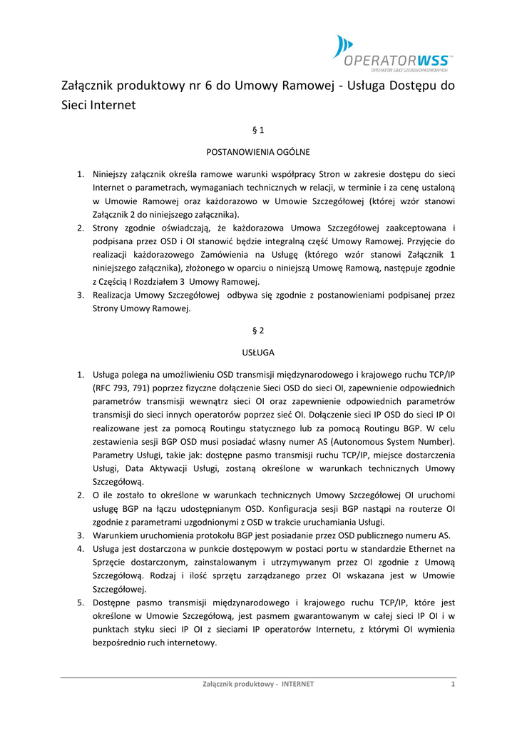 Załącznik produktowy nr 6 do Umowy Ramowej - Usługa Dostępu do Sieci Internet §1 POSTANOWIENIA OGÓLNE 1. Niniejszy załącznik określa ramowe warunki współpracy Stron w zakresie dostępu do sieci Internet o parametrach, wymaganiach technicznych w relacji, w terminie i za cenę ustaloną w Umowie Ramowej oraz każdorazowo w Umowie Szczegółowej (której wzór stanowi Załącznik 2 do niniejszego załącznika). 2. Strony zgodnie oświadczają, że każdorazowa Umowa Szczegółowej zaakceptowana i podpisana przez OSD i OI stanowić będzie integralną część Umowy Ramowej. Przyjęcie do realizacji każdorazowego Zamówienia na Usługę (którego wzór stanowi Załącznik 1 niniejszego załącznika), złożonego w oparciu o niniejszą Umowę Ramową, następuje zgodnie z Częścią I Rozdziałem 3 Umowy Ramowej. 3. Realizacja Umowy Szczegółowej odbywa się zgodnie z postanowieniami podpisanej przez Strony Umowy Ramowej. §2 USŁUGA 1. Usługa polega na umożliwieniu OSD transmisji międzynarodowego i krajowego ruchu TCP/IP (RFC 793, 791) poprzez fizyczne dołączenie Sieci OSD do sieci OI, zapewnienie odpowiednich parametrów transmisji wewnątrz sieci OI oraz zapewnienie odpowiednich parametrów transmisji do sieci innych operatorów poprzez sieć OI. Dołączenie sieci IP OSD do sieci IP OI realizowane jest za pomocą Routingu statycznego lub za pomocą Routingu BGP. W celu zestawienia sesji BGP OSD musi posiadać własny numer AS (Autonomous System Number). Parametry Usługi, takie jak: dostępne pasmo transmisji ruchu TCP/IP, miejsce dostarczenia Usługi, Data Aktywacji Usługi, zostaną określone w warunkach technicznych Umowy Szczegółową. 2. O ile zostało to określone w warunkach technicznych Umowy Szczegółowej OI uruchomi usługę BGP na łączu udostępnianym OSD. Konfiguracja sesji BGP nastąpi na routerze OI zgodnie z parametrami uzgodnionymi z OSD w trakcie uruchamiania Usługi. 3. Warunkiem uruchomienia protokołu BGP jest posiadanie przez OSD publicznego numeru AS. 4. Usługa jest dostarczona w punkcie dostępowym w postaci portu w standardzie Ethernet na Sprzęcie dostarczonym, zainstalowanym i utrzymywanym przez OI zgodnie z Umową Szczegółową. Rodzaj i ilość sprzętu zarządzanego przez OI wskazana jest w Umowie Szczegółowej. 5. Dostępne pasmo transmisji międzynarodowego i krajowego ruchu TCP/IP, które jest określone w Umowie Szczegółową, jest pasmem gwarantowanym w całej sieci IP OI i w punktach styku sieci IP OI z sieciami IP operatorów Internetu, z którymi OI wymienia bezpośrednio ruch internetowy. Załącznik produktowy - INTERNET 1 6. OI nie ponosi odpowiedzialności za zamówienie, realizację i poprawne działanie domen adresowych rejestrowanych przez podmioty trzecie. OI nie jest stroną w działaniach związanych z rezerwacją i rejestracją takich domen. Usługi te nie są objęte Umową Ramową i Umową Szczegółową. 7. Adresy IP są przydzielane OSD na czas trwania Umowy Szczegółowej, na warunkach ustalanych przez organizację RIPE. 8. OSD jest zobowiązany do współpracy z OI w zakresie obsługi i eliminacji nadużyć popełnionych za pomocą infrastruktury telekomunikacyjnej OSD, w szczególności rozsyłania spamu lub wirusów, skanowania portów, włamań do systemów informatycznych, ataków typu DoS i DDoS. §3 OPŁATY 1. Opłaty związane z Dostępem do Sieci Internet UMOWA TERMINOWA od 12 do 23 MIESIĘCY - SLA STANDARD OPŁATA JEDNORAZOWA OPŁATA ABONAMENTOWA PRZEPUSTOWOŚĆ 100 Mb/s 500 650 [PLN] [PLN] 200 Mb/s 500 1 250 300 Mb/s 500 1 800 500 Mb/s 500 2 800 1 Gb/s 500 5 000 Przepustowości powyżej 1 Gb/s 5 PLN za 1 Mb/s Zmiana parametrów łącza 300 PLN Opłata za zarządzanie adresacją 2 PLN za każdy adres IP IPv4 - (8 adresów IP w cenie usługi) 2. Opłaty związane z Dostępem do Sieci Internet w SLA TOP SLA TOP (6h) UMOWA TERMINOWA SLA TOP Dopłata 15% do opłat abonamentowych OI OSD ………………………………………………………. …………………………………………………… (data i podpis) (data i podpis) ZAŁĄCZNIKI: Załącznik 1 - Zamówienie na usługę Dostęp do Sieci Internet Załącznik 2 - Wzór Umowy Szczegółowej Załącznik 3 - Protokół zdawczo-odbiorczy Załącznik produktowy - INTERNET 2 Załącznik 1 – Zamówienie na usługę Dostęp do Sieci Internet Nr ........................... Zamówienie z dnia ......................... Nazwa OSD Adres siedziby Udostępniający OI Do Umowy Ramowej Nowe zamówienie Przedłużenie okresu obowiązywania PRZEDMIOT ZAMÓWIENIA Relacja Lp. Rodzaj interfejsu Lokalizacja A Termin oddania Usługi 1000 Base SX/LX przepływność: ____________ CZAS OBOWIĄZYWANIA UMOWY 1 rok 2 lata Inny: …………………………………... SLA: Wariant Standard Wariant TOP UWAGI Podpis(y) upoważnionego przedstawiciela OSD Imię i nazwisko Data Podpis i pieczątka firmowa Załącznik produktowy - INTERNET 3 Załącznik 2 – Wzór Umowy Szczegółowej Nr ........................... Zamówienie z dnia ......................... Nazwa OSD Adres siedziby Wydzierżawiający OI Do Umowy Ramowej Nowe zamówienie Przedłużenie okresu obowiązywania PRZEDMIOT UMOWY Relacja Lp Rodzaj interfejsu Lokalizacja A Termin oddania Usługi 1000 Base SX/LX przepływność: ____________ CZAS OBOWIĄZYWANIA UMOWY 1 rok 2 lata Inny: …………………………………... SLA: Wariant Standard Wariant TOP OPŁATY Lp Usługa Opłaty jednorazowe netto Opłaty miesięczne netto UWAGI Podpisy przedstawicieli Stron OSD OI Imię i nazwisko Data Imię i nazwisko Podpis i pieczątka firmowa Załącznik produktowy - INTERNET Data Podpis i pieczątka firmowa 4 Załącznik 3 – Protokół zdawczo-odbiorczy Nazwa OSD Adres siedziby Wydzierżawiający OI Do Umowy Szczegółowej Nr ........................... z dnia ......................... Relacja Lp Rodzaj interfejsu Lokalizacja A Data rozpoczęcia świadczenia Usługi 1000 Base SX/LX przepływność: _____