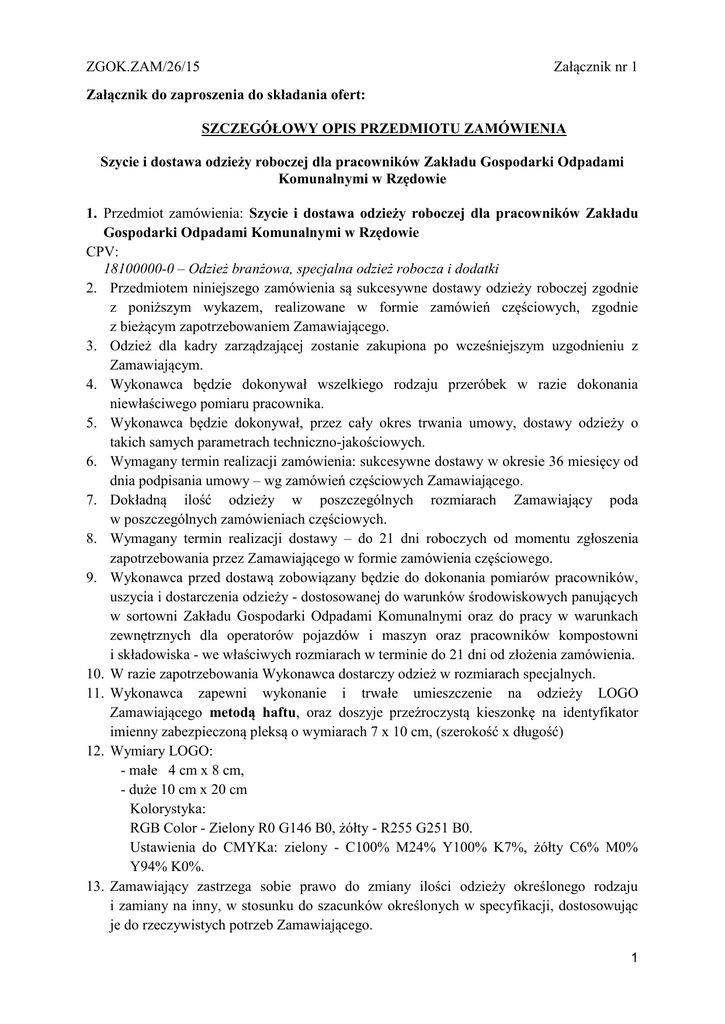 ZGOK.ZAM/26/15 Załącznik nr 1 Załącznik do zaproszenia do