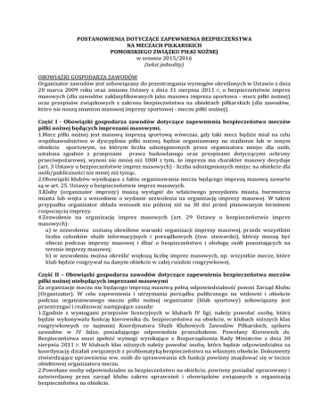 POSTANOWIENIA DOTYCZĄCE ZAPEWNIENIA BEZPIECZEŃSTWA NA MECZACH PIŁKARSKICH POMORSKIEGO ZWIĄZKU PIŁKI NOŻNEJ w sezonie 2015/2016 (tekst jednolity) OBOWIĄZKI GOSPODARZA ZAWODÓW Organizator zawodów jest zobowiązany do przestrzegania wymogów określonych w Ustawie z dnia 20 marca 2009 roku oraz zmianie Ustawy z dnia 31 sierpnia 2011 r, o bezpieczeństwie imprez masowych (dla zawodów zaklasyfikowanych jako masowa impreza sportowa - mecz piłki nożnej) oraz przepisów związkowych z zakresu bezpieczeństwa na obiektach piłkarskich (dla zawodów, które nie noszą znamion masowej imprezy sportowej - meczu piłki nożnej). Część I - Obowiązki gospodarza zawodów dotyczące zapewnienia bezpieczeństwa meczów piłki nożnej będących imprezami masowymi. 1.Mecz piłki nożnej jest masową imprezą sportową wówczas, gdy taki mecz będzie miał na celu współzawodnictwo w dyscyplinie piłki nożnej, będzie organizowany na stadionie lub w innym obiekcie sportowym, na którym liczba udostępnionych przez organizatora miejsc dla osób, ustalona zgodnie z przepisami prawa budowlanego oraz przepisami dotyczącymi ochrony przeciwpożarowej, wynosi nie mniej niż 1000 z tym, że impreza ma charakter masowy decyduje (art. 3 Ustawy o bezpieczeństwie imprez masowych) - liczba udostępnionych miejsc na obiekcie dla osób/publiczności nie mniej niż tysiąc. 2.Obowiązki klubów wynikające z faktu organizowania meczu będącego imprezą masową zawarte są w art. 25. Ustawy o bezpieczeństwie imprez masowych. 3.Kluby (organizator imprezy) muszą wystąpić do właściwego prezydenta miasta, burmistrza miasta lub wójta z wnioskiem o wydanie zezwolenia na organizację imprezy masowej. W takim przypadku organizator składa wniosek nie później niż na 30 dni przed planowanym terminem rozpoczęcia imprezy. 4.Zezwolenie na organizację imprez masowych (art. 29 Ustawy o bezpieczeństwie imprez masowych): a) w zezwoleniu zostaną określone warunki organizacji imprezy masowej, przede wszystkim liczba członków służb informacyjnych i porządkowych (tzw. stewardzi), którzy muszą być obecni podczas imprezy masowej i dbać o bezpieczeństwo i obsługę osób pozostających na terenie imprezy masowej; b) w zezwoleniu można określić większą liczbę imprez masowych, np. wszystkie mecze, które klub będzie rozgrywał na danym obiekcie w całej rundzie rozgrywkowej. Część II – Obowiązki gospodarza zawodów dotyczące zapewnienia bezpieczeństwa meczów piłki nożnej niebędących imprezami masowymi Za organizacje meczu nie będącego imprezą masową pełną odpowiedzialność ponosi Zarząd Klubu (Organizator). W celu zapewnienia i utrzymania porządku publicznego na widowni i obiekcie podczas organizowanego meczu piłki nożnej organizator (klub sportowy) zobowiązany jest przestrzegać i realizować następujące zasady: 1.Zgodnie z wymogami przepisów licencyjnych w klubach IV ligi, należy powołać osobę, która będzie wykonywała funkcję kierownika ds. bezpieczeństwa na obiekcie, w klubach niższych klas rozgrywkowych co najmniej Koordynatora Służb Klubowych Zawodów Piłkarskich, spikera zawodów w IV lidze, posiadającego odpowiednie przeszkolenie. Powołany Kierownik ds. Bezpieczeństwa musi spełnić wymogi wynikające z Rozporządzenia Rady Ministrów z dnia 30 sierpnia 2011 r. W klubach klas niższych należy powołać osobę, która będzie odpowiedzialna za koordynację działań związanych z problematyką bezpieczeństwa na własnym obiekcie. Dokumenty stwierdzające uprawnienia ww. osób do sprawowania ich funkcji powinny znajdować się w teczce obiektowej organizatora meczu. 2.Powołane osoby odpowiedzialne za bezpieczeństwo na obiekcie, powinny posiadać opracowany i zatwierdzony przez zarząd klubu zakres uprawnień i obowiązków związanych z organizacją bezpieczeństwa na obiekcie. 3.Organizator, a w jego imieniu Kierownik ds. Bezpieczeństwa/osoba odpowiedzialna za koordynację działań w zakresie zapewnienia bezpieczeństwa, zobowiązani są przed każdym rozpoczęciem sezonu rozgrywkowego poinformować pisemnie niżej wymienione podmioty o organizowaniu meczów piłki nożnej i zorganizować przegląd obiektu. Należy omówić warunki bezpieczeństwa z udziałem przedstawicieli miejscowych władz samorządowych, Policji, Straży Miejskiej, Straży Pożarnej, służb sanitarnych i medycznych. Z wykonanych czynności powinien zostać sporządzony protokół uzgodnień. 4.Organizator zobowiązany jest do przekazania ww. podmiotom terminarz zawodów na daną rundę rozgrywek i podać przewidywaną ilość miejsc udostępnionych na stadionie w czasie zawodów piłki nożnej. 5.Obiekt, który posiada większą ilość miejsc od udostępnionych publiczności, musi dokonać wyłączenia pozostałej jego części. 6.Organizator meczu piłki nożnej - odpowiada za bezpieczeństwo uczestników zawodów (w tym widzów) od momentu otwarcia bram (udostępniania obiektu dla widzów) do momentu opuszczenia przez widzów obiektu (zamknięcia bram). 7.Jeżeli jakiekolwiek niebezpieczeństwo zagraża sędziom i drużynie gości, drużyna gospodarzy oraz organizator zawodów zobowiązani są zapewnić im wystarczającą ochronę. Jeżeli niebezpieczeństwo zagraża tylko sędziom - obowiązek udzielenia ochrony i pomocy spoczywa na obu drużynach i organizatorze zawodów. 8.Organizator zawodów odpowiedzialny jest za bezpieczeństwo sędziów zarówno przed, podczas ich trwania i po zawodach, jak i podczas opuszczania miejsca rozgrywania zawodów 9.Organizator w przypadku, gdy obiekt nie posiada zewnętrznego ogrodzenia, zobowiązany jest do określenia i oznakowania obszaru (terenu), na którym są organizowane zawody piłki nożnej z udziałem publiczności. 10.Organizator zobowiązany jest do udostępnienia i sprzedaży biletów wstępu tylko na miejsca siedzące. 11.Zgromadzić wszystkie dokumenty związane z organizacją zawodów w Teczce Obiektowej (do klasy 