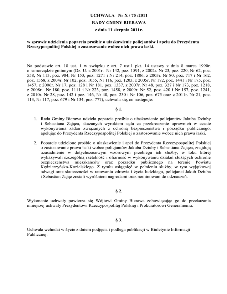 UCHWAŁA Nr X / 75 /2011 RADY GMINY BIERAWA z dnia 11 sierpnia 2011r. w sprawie udzielenia poparcia prośbie o ułaskawienie policjantów i apelu do Prezydenta Rzeczypospolitej Polskiej o zastosowanie wobec nich prawa łaski. Na podstawie art. 18 ust. 1 w związku z art. 7 ust.1 pkt. 14 ustawy z dnia 8 marca 1990r. o samorządzie gminnym (Dz. U. z 2001r. Nr 142, poz. 1591, z 2002r. Nr 23, poz. 220, Nr 62, poz. 558, Nr 113, poz. 984, Nr 153, poz. 1271 i Nr 214, poz. 1806, z 2003r. Nr 80, poz. 717 i Nr 162, poz. 1568, z 2004r. Nr 102, poz. 1055, Nr 116, poz. 1203, z 2005r. Nr 172, poz. 1441 i Nr 175, poz. 1457, z 2006r. Nr 17, poz. 128 i Nr 181, poz. 1337, z 2007r. Nr 48, poz. 327 i Nr 173, poz. 1218, z 2008r. Nr 180, poz. 1111 i Nr 223, poz. 1458, z 2009r. Nr 52, poz. 420 i Nr 157, poz. 1241, z 2010r. Nr 28, poz. 142 i poz. 146, Nr 40, poz. 230 i Nr 106, poz. 675 oraz z 2011r. Nr 21, poz. 113, Nr 117, poz. 679 i Nr 134, poz. 777), uchwala się, co następuje: § 1. 1. Rada Gminy Bierawa udziela poparcia prośbie o ułaskawienie policjantów Jakuba Dziuby i Sebastiana Zająca, skazanych wyrokiem sądu za przekroczenie uprawnień w czasie wykonywania zadań związanych z ochroną bezpieczeństwa i porządku publicznego, apelując do Prezydenta Rzeczypospolitej Polskiej o zastosowanie wobec nich prawa łaski. 2. Poparcie udzielone prośbie o ułaskawienie i apel do Prezydenta Rzeczypospolitej Polskiej o zastosowanie prawa łaski wobec policjantów Jakuba Dziuby i Sebastiana Zająca, znajdują uzasadnienie w dotychczasowym wzorowym przebiegu ich słuŜby, w toku której wykazywali szczególną rzetelność i ofiarność w wykonywaniu działań słuŜących ochronie bezpieczeństwa mieszkańców oraz porządku publicznego na terenie Powiatu Kędzierzyńsko-Kozielskiego. Z tytułu osiągnięć w pełnieniu słuŜby, w tym wyjątkowej odwagi oraz skuteczności w ratowaniu zdrowia i Ŝycia ludzkiego, policjanci Jakub Dziuba i Sebastian Zając zostali wyróŜnieni nagrodami oraz nominowani do odznaczeń. § 2. Wykonanie uchwały powierza się Wójtowi Gminy Bierawa zobowiązując go do przekazania niniejszej uchwały Prezydentowi Rzeczypospolitej Polskiej i Prokuratorowi Generalnemu. § 3. Uchwała wchodzi w Ŝycie z dniem podjęcia i podlega publikacji w Biuletynie Informacji Publicznej.