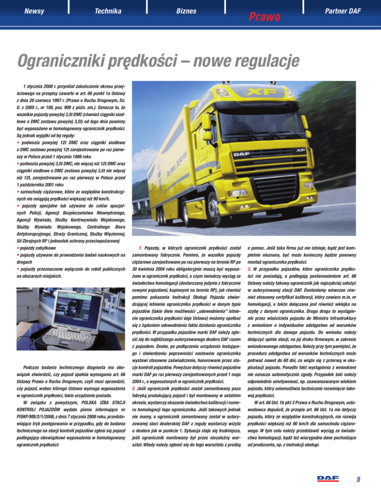 Newsy Technika Biznes Prawo Partner DAF Ograniczniki prędkości – nowe regulacje 1 stycznia 2008 r. przyniósł zakończenie okresu przejściowego na przepisy zawarte w art. 66 punkt 1a Ustawy z dnia 20 czerwca 1997 r. (Prawo o Ruchu Drogowym, Dz. U. z 2005 r., nr 108, poz. 908 z późn. zm.). Oznacza to, że wszelkie pojazdy powyżej 3,5t DMC (również ciągniki siodłowe o DMC zestawu powyżej 3,5t) od tego dnia powinny być wyposażone w homologowany ogranicznik prędkości. Są jednak wyjątki od tej reguły: • podwozia powyżej 12t DMC oraz ciągniki siodłowe o DMC zestawu powyżej 12t zarejestrowane po raz pierwszy w Polsce przed 1 stycznia 1988 roku • podwozia powyżej 3,5t DMC, nie więcej niż 12t DMC oraz ciągniki siodłowe o DMC zestawu powyżej 3,5t nie więcej niż 12t, zarejestrowane po raz pierwszy w Polsce przed 1 października 2001 roku • samochody ciężarowe, które ze względów konstrukcyjnych nie osiągają prędkości większej niż 90 km/h. • pojazdy specjalne lub używane do celów specjalnych Policji, Agencji Bezpieczeństwa Wewnętrznego, Agencji Wywiadu, Służby Kontrwywiadu Wojskowego, Służby Wywiadu Wojskowego, Centralnego Biura Antykorupcyjnego, Straży Granicznej, Służby Więziennej, Sił Zbrojnych RP i jednostek ochrony przeciwpożarowej • pojazdy zabytkowe • pojazdy używane do prowadzenia badań naukowych na drogach • pojazdy przeznaczone wyłącznie do robót publicznych na obszarach miejskich. Podczas badania technicznego diagnosta ma obowiązek stwierdzić, czy pojazd spełnia wymagania art. 66 Ustawy Prawo o Ruchu Drogowym, czyli musi sprawdzić, czy pojazd, wobec którego Ustawa wymaga wyposażenia w ogranicznik prędkości, takie urządzenie posiada. W związku z powyższym, POLSKA IZBA STACJI KONTROLI POJAZDÓW wydała pismo informujące nr PISKP/MB/2/1/2008, z dnia 7 stycznia 2008 roku, przedstawiające tryb postępowania w przypadku, gdy do badania technicznego na stacji kontroli pojazdów zgłosi się pojazd podlegający obowiązkowi wyposażenia w homologowany ogranicznik prędkości: 1. Pojazdy, w których ogranicznik prędkości został zamontowany fabrycznie. Pomimo, że wszelkie pojazdy ciężarowe zarejestrowane po raz pierwszy na terenie RP po 30 kwietnia 2004 roku obligatoryjnie muszą być wyposażone w ogranicznik prędkości, o czym świadczy wyciąg ze świadectwa homologacji (dostarczany jedynie z fabrycznie nowymi pojazdami, kupionymi na terenie RP), jak również pomimo pokazania Instrukcji Obsługi Pojazdu stwierdzającej istnienie ogranicznika prędkości w danym typie pojazdów (takie dwie możliwości „udowodnienia” istnienia ogranicznika prędkości daje Ustawa) możemy spotkać się z żądaniem udowodnienia faktu działania ogranicznika prędkości. W przypadku pojazdów marki DAF należy zgłosić się do najbliższego autoryzowanego dealera DAF razem z pojazdem. Dealer, po podłączeniu urządzenia testującego i stwierdzeniu poprawności nastawów ogranicznika wystawi stosowne zaświadczenie, honorowane przez stacje kontroli pojazdów. Powyższe dotyczy również pojazdów marki DAF po raz pierwszy zarejestrowanych przed 1 maja 2004 r., a wyposażonych w ogranicznik prędkości. 2. Jeśli ogranicznik prędkości został zamontowany poza fabryką produkującą pojazd i był montowany w ostatnim okresie, wystarczy okazanie świadectwa kalibracji i numeru homologacji tego ogranicznika. Jeśli takowych jednak nie mamy, a ogranicznik zamontowany został w autoryzowanej sieci dealerskiej DAF z reguły wystarczy wizyta u dealera jak w punkcie 1. Sytuacja staje się trudniejsza, jeśli ogranicznik montowany był przez niezależny warsztat. Wtedy należy zgłosić się do tego warsztatu z prośbą o pomoc. Jeśli taka firma już nie istnieje, bądź jest kompletnie nieznana, być może konieczny będzie ponowny montaż ogranicznika prędkości. 3. W przypadku pojazdów, które ogranicznika prędkości nie posiadają, a podlegają postanowieniom art. 66 Ustawy należy takowy ogranicznik jak najszybciej założyć w autoryzowanej stacji DAF. Dostaniemy wówczas również stosowny certyfikat kalibracji, który zawiera m.in. nr homologacji, a także dołączana jest również wklejka na szybę z danymi ogranicznika. Druga droga to wystąpienie przez właściciela pojazdu do Ministra Infrastruktury z wnioskiem o indywidualne odstępstwo od warunków technicznych dla danego pojazdu. Do wniosku należy dołączyć opinie stacji, na jej druku firmowym, w zakresie wnioskowanego odstępstwa. Należy przy tym pamiętać, że procedura odstępstwa od warunków technicznych może potrwać nawet do 60 dni, co wiąże się z przerwą w eksploatacji pojazdu. Ponadto fakt wystąpienia z wnioskiem nie oznacza automatycznie zgody. Przypadek taki należy odpowiednio umotywować, np. zaawansowanym wiekiem pojazdu, który uniemożliwia technicznie rozwinięcie takowej prędkości. W art. 66 Ust. 1b pkt 3 Prawa o Ruchu Drogowym, ustawodawca dopuścił, że przepis art. 66 Ust. 1a nie dotyczy pojazdu, który ze względów konstrukcyjnych, nie rozwija prędkości większej niż 90 km/h dla samochodu ciężarowego. W tym celu należy przedstawić wyciąg ze świadectwa homologacji, bądź też wiarygodne dane pochodzące od producenta, np. z instrukcji obsługi.