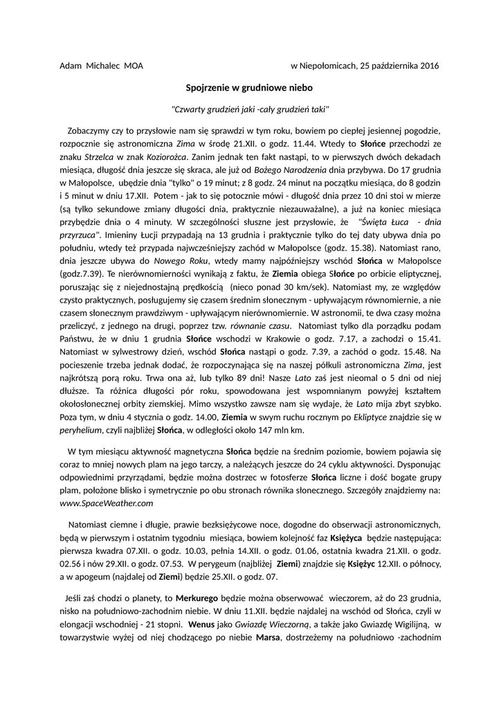 Adam Michalec MOA w Niepołomicach, 25 października 2016 Spojrzenie w grudniowe niebo "Czwarty grudzień jaki -cały grudzień taki" Zobaczymy czy to przysłowie nam się sprawdzi w tym roku, bowiem po ciepłej jesiennej pogodzie, rozpocznie się astronomiczna Zima w środę 21.XII. o godz. 11.44. Wtedy to Słońce przechodzi ze znaku Strzelca w znak Koziorożca. Zanim jednak ten fakt nastąpi, to w pierwszych dwóch dekadach miesiąca, długość dnia jeszcze się skraca, ale już od Bożego Narodzenia dnia przybywa. Do 17 grudnia w Małopolsce, ubędzie dnia "tylko" o 19 minut; z 8 godz. 24 minut na początku miesiąca, do 8 godzin i 5 minut w dniu 17.XII. Potem - jak to się potocznie mówi - długość dnia przez 10 dni stoi w mierze (są tylko sekundowe zmiany długości dnia, praktycznie niezauważalne), a już na koniec miesiąca przybędzie dnia o 4 minuty. W szczególności słuszne jest przysłowie, że "Święta Łuca - dnia przyrzuca". Imieniny Łucji przypadają na 13 grudnia i praktycznie tylko do tej daty ubywa dnia po południu, wtedy też przypada najwcześniejszy zachód w Małopolsce (godz. 15.38). Natomiast rano, dnia jeszcze ubywa do Nowego Roku, wtedy mamy najpóźniejszy wschód Słońca w Małopolsce (godz.7.39). Te nierównomierności wynikają z faktu, że Ziemia obiega Słońce po orbicie eliptycznej, poruszając się z niejednostajną prędkością (nieco ponad 30 km/sek). Natomiast my, ze względów czysto praktycznych, posługujemy się czasem średnim słonecznym - upływającym równomiernie, a nie czasem słonecznym prawdziwym - upływającym nierównomiernie. W astronomii, te dwa czasy można przeliczyć, z jednego na drugi, poprzez tzw. równanie czasu. Natomiast tylko dla porządku podam Państwu, że w dniu 1 grudnia Słońce wschodzi w Krakowie o godz. 7.17, a zachodzi o 15.41. Natomiast w sylwestrowy dzień, wschód Słońca nastąpi o godz. 7.39, a zachód o godz. 15.48. Na pocieszenie trzeba jednak dodać, że rozpoczynająca się na naszej półkuli astronomiczna Zima, jest najkrótszą porą roku. Trwa ona aż, lub tylko 89 dni! Nasze Lato zaś jest nieomal o 5 dni od niej dłuższe. Ta różnica długości pór roku, spowodowana jest wspomnianym powyżej kształtem okołosłonecznej orbity ziemskiej. Mimo wszystko zawsze nam się wydaje, że Lato mija zbyt szybko. Poza tym, w dniu 4 stycznia o godz. 14.00, Ziemia w swym ruchu rocznym po Ekliptyce znajdzie się w peryhelium, czyli najbliżej Słońca, w odległości około 147 mln km. W tym miesiącu aktywność magnetyczna Słońca będzie na średnim poziomie, bowiem pojawia się coraz to mniej nowych plam na jego tarczy, a należących jeszcze do 24 cyklu aktywności. Dysponując odpowiednimi przyrządami, będzie można dostrzec w fotosferze Słońca liczne i dość bogate grupy plam, położone blisko i symetrycznie po obu stronach równika słonecznego. Szczegóły znajdziemy na: www.SpaceWeather.com Natomiast ciemne i długie, prawie bezksiężycowe noce, dogodne do obserwacji astronomicznych, będą w pierwszym i ostatnim tygodniu miesiąca, bowiem kolejność faz Księżyca będzie następująca: pierwsza kwadra 07.XII. o godz. 10.03, pełnia 14.XII. o godz. 01.06, ostatnia kwadra 21.XII. o godz. 02.56 i nów 29.XII. o godz. 07.53. W perygeum (najbliżej Ziemi) znajdzie się Księżyc 12.XII. o północy, a w apogeum (najdalej od Ziemi) będzie 25.XII. o godz. 07. Jeśli zaś chodzi o planety, to Merkurego będzie można obserwować wieczorem, aż do 23 grudnia, nisko na południowo-zachodnim niebie. W dniu 11.XII. będzie najdalej na wschód od Słońca, czyli w elongacji wschodniej - 21 stopni. Wenus jako Gwiazdę Wieczorną, a także jako Gwiazdę Wigilijną, w towarzystwie wyżej od niej chodzącego po niebie Marsa, dostrzeżemy na południowo -zachodnim nieboskłonie. Saturn kryje się za Słońcem i w tym miesiącu go nie zobaczymy. Jowisza możemy obserwować na porannym niebie, bowiem poprzedza wschód Słońca o dobre 2-3 godziny. Planetę Uran, można próbować obserwować późnym wieczorem nad południowym horyzontem w gwiazdozbiorze Ryb, zaś Neptun goszczący w gwiazdozbiorze Wodnika, dostępny jest do obserwacji w pierwszej połowie nocy. Natomiast od wieczora, na południowym wschodzie, będzie się nam dumnie prezentował gwiazdozbiór Oriona, najjaśniejszą gwiazdą nieba u jego stóp, Syriuszem. Światło tej błękitnej gwiazdy, potrzebuje ponad 8 lat, aby przebyć odległość dzielącą ją od Słońca. Aby chociaż część w/w zjawisk zaobserwować, można przespacerować się o porannym rześkim powietrzu lub złożyć wieczorną wizytę w Młodzieżowym Obserwatorium Astronomicznym w Niepołomicach, przy ul. Mikołaja Kopernika 2 (tel. 12-281-15-61). W tym miesiącu promieniują - z bardziej znanych - dwa roje meteorów: Geminidy i Ursydy. Te pierwsze mają radiant w gwiazdozbiorze Bliźniąt, a maksimum ich aktywności (60 do 90 "spadających" gwiazd na godzinę) przypada na wieczór 14 grudnia. W obserwacjach skutecznie będzie nam przeszkadzał Księżyc w pełni. Natomiast radiant Ursydów leży wysoko na niebie, w gwiazdozbiorze Małej Niedźwiedzicy i jego maksimum aktywności przypada na drugą noc tegorocznej Zimy. Rój ten jest słabszy od poprzedniego (5-20 przelotów/godz.). Natomiast warunki ich obserwacji będą lepsze, bowiem Księżyc będzie w ostatniej kwadrze. Ze zjawisk, które bym Państwu szczególnie polecał do obejrzenia na niebie, oprócz wspomnianych powyżej rojów meteorów, to pojawienie się w Wigilię tzw. pierwszej gwiazdki na wieczornym niebie. Największe szanse aby nią być, będzie miała planeta Wenus. Będzie to znak, że czas już - po wspólnej modlitwie - zasiąść do rodzinnego stołu i łamiąc się tradycyjnie opłatkiem, złożyć sobie wzajemnie serdeczne i optymistyczne życzenia doczekania w zdrowiu Nowego 2017 Roku. Pamiętajmy przy tym, obserwując otaczającą nas przyrodę, o staropolskim przysłowiu: "Su