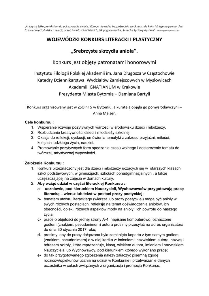 „Anioły są tylko pretekstem do pokazywania świata, którego nie widać bezpośrednio za oknem, ale który istnieje na pewno. Jest to świat międzyludzkich relacji, uczuć i wartości mi bliskich, jak pogoda ducha, śmiech i życiowy dystans”. Artur Więcek Wywiad 2005r. WOJEWÓDZKI KONKURS LITERACKI I PLASTYCZNY „Srebrzyste skrzydła anioła”. Konkurs jest objęty patronatami honorowymi Instytutu Filologii Polskiej Akademii im. Jana Długosza w Częstochowie Katedry Dziennikarstwa Wydziałów Zamiejscowych w Mysłowicach Akademii IGNATIANUM w Krakowie Prezydenta Miasta Bytomia – Damiana Bartyli Konkurs organizowany jest w ZSO nr 5 w Bytomiu, a kuratelą objęła go pomysłodawczyni – Anna Meiser. Cele konkursu : 1. Wspieranie rozwoju pozytywnych wartości w środowisku dzieci i młodzieży. 2. Rozbudzanie kreatywności dzieci i młodzieży szkolnej. 3. Okazja do refleksji, dyskusji, omówienia tematyki z zakresu przyjaźni, miłości, kolejach ludzkiego życia, nadziei. 4. Promowanie pozytywnych form spędzania czasu wolnego i dostarczenie tematu do twórczej, artystycznej wypowiedzi. Założenia Konkursu : 1. Konkurs przeznaczony jest dla dzieci i młodzieży uczących się w starszych klasach szkół podstawowych, w gimnazjach, szkołach ponadgimnazjalnych , a także uczęszczającej na zajęcia w domach kultury. 2. Aby wziąć udział w części literackiej Konkursu : a- uczniowie, pod kierunkiem Nauczycieli, Wychowawców przygotowują pracę literacką – wiersz lub tekst w postaci prozy poetyckiej; b- tematem utworu literackiego (wiersza lub prozy poetyckiej) mogą być anioły w swych różnych postaciach, refleksje na temat doświadczania aniołów, ich obecności, opieki, różnych aspektów mody na anioły i ich powrotu do naszego życia; c- prace o objętości do jednej strony A-4, napisane komputerowo, oznaczone godłem (znakiem, pseudonimem) autora prosimy przesyłać na adres organizatora do dnia 30 stycznia 2017 roku; d- prosimy, aby do pracy dołączona była zamknięta koperta z tym samym godłem (znakiem, pseudonimem) a w niej kartka z: imieniem i nazwiskiem autora, nazwą i adresem szkoły, którą reprezentuje, klasą, wiekiem autora, imieniem i nazwiskiem Nauczyciela lub Wychowawcy, pod kierunkiem którego wykonano pracę; e- do tak przygotowanego zgłoszenia należy załączyć pisemną zgodę rodziców/opiekunów ucznia na udział w Konkursie i przetwarzanie danych uczestnika w celach związanych z organizacja i promocja Konkursu; f- prosimy o podanie telefonu kontaktowego (np. telefonu reprezentowanej szkoły, placówki). 3. Aby wziąć udział w części plastycznej Konkursu : a- uczniowie, pod kierunkiem Nauczycieli, Wychowawców przygotowują pracę plastyczną – collage o formacie do A-3; b- tematem utworu plastycznego jest wizerunek współczesnego anioła w dowolnie wybranej sytuacji (także wizerunek anioła wykonany techniką collage); c- prace prosimy przesyłać na adres organizatora do dnia 30 stycznia 2017 roku; d- prosimy, aby każda praca opisana była imieniem i nazwiskiem autora, nazwą i adresem szkoły, którą reprezentuje, klasą, wiekiem autora, imieniem i nazwiskiem Nauczyciela lub Wychowawcy, pod kierunkiem którego wykonano pracę; e- do tak przygotowanego zgłoszenia należy załączyć pisemną zgodę rodziców/opiekunów ucznia na udział w Konkursie i przetwarzanie danych uczestnika w celach związanych z organizacją i promocją Konkursu; f- prosimy o podanie telefonu kontaktowego (np. telefonu reprezentowanej szkoły, placówki). 4. Uczestnicy Konkursu otrzymają nagrody oraz wyróżnienia. 5. Prace nagrodzone i wyróżnione umieszczone będą na wystawie pokonkursowej, o otwarciu której laureaci zostaną powiadomieni telefonicznie. Wręczenie nagród odbędzie się w sposób uroczysty w ZSO nr 5 w Bytomiu w dniu 9 lutego 2017 r. (organizatorzy zastrzegają sobie prawo zmiany powyższego terminu z różnych przyczyn losowych). 6. Złożenie przez autora prac oznacza akceptację warunków konkursu i regulaminu, którego ostateczna interpretacja należy do jury konkursu. Żadne odwołania nie zostaną uwzględnione. 7. Organizator zastrzega sobie prawo do przerwania lub odwołania konkursu. 8. Udział w konkursie jest równoznaczny z wyrażeniem przez osoby uczestniczące zgody na przetwarzanie przez organizatora ich danych osobowych na potrzeby konkursu /Ustawa o ochronie danych osobowych z dn.29.08.1997 r. Dz.U. Nr 133 poz.833 z póz. zm./ Informacje : ZSO nr 5 im. J.F.Kennedy’ego w Bytomiu, ul. Nickla 19, 41 – 908 Bytom, Tel. 32 286 41 54, e – mail : [email protected]