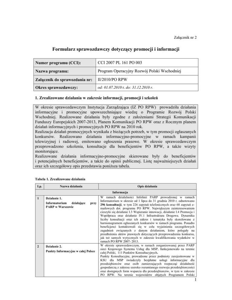 Załącznik nr 2 Formularz sprawozdawczy dotyczący promocji i informacji Numer programu (CCI): CCI 2007 PL 161 PO 003 Nazwa programu: Program Operacyjny Rozwój Polski Wschodniej Załącznik do sprawozdania nr: II/2010/PO RPW Okres sprawozdawczy: od: 01.07.2010 r. do: 31.12.2010 r. 1. Zrealizowane działania w zakresie informacji, promocji i szkoleń W okresie sprawozdawczym Instytucja Zarządzająca (IZ PO RPW) prowadziła działania informacyjne i promocyjne upowszechniające wiedzę o Programie Rozwój Polski Wschodniej. Realizowane działania były zgodne z załoŜeniami Strategii Komunikacji Funduszy Europejskich 2007-2013, Planem Komunikacji PO RPW oraz z Rocznym planem działań informacyjnych i promocyjnych PO RPW na 2010 rok. Realizacja działań promocyjnych wynikała z bieŜących potrzeb, w tym promocji ogłaszanych konkursów. Realizowano działania informacyjno-promocyjne w ramach kampanii telewizyjnej i radiowej, emitowano ogłoszenia prasowe. W okresie sprawozdawczym przeprowadzono szkolenia, konsultacje dla beneficjentów PO RPW, a takŜe wizyty monitorujące. Realizowane działania informacyjno-promocyjne skierowane były do beneficjentów i potencjalnych beneficjentów, a takŜe do opinii publicznej. Listę najwaŜniejszych działań oraz ich szczegółowy opis przedstawia poniŜsza tabela. Tabela 1. Zrealizowane działania Lp. Nazwa działania Opis działania Informacja 1 2 Działanie 1. Informatorium działające PARP w Warszawie przy Działanie 2. Punkty Informacyjne w całej Polsce W ramach działalności Infolinii PARP prowadzonej w ramach Informatorium w okresie od 1 lipca do 31 grudnia 2010 r. odnotowano 296 konsultacji, w tym 226 zapytań telefonicznych oraz 68 zapytań emailowych dot. programu PO RPW. Największym zainteresowaniem cieszyło się działanie I.3 Wspieranie innowacji, działanie I.4 Promocja i Współpraca oraz działanie IV.1 Infrastruktura Drogowa. Dynamika liczby konsultacji oraz ich zakres i tematyka były skorelowane z harmonogramem ogłaszanych konkursów w ramach programu. Ponadto beneficjenci kontaktowali się w celu wyjaśnienia szczegółowych zagadnień związanych z danym działaniem, które polegały na przedłoŜeniu aktów prawnych dotyczących przeprowadzenia konkursu, jak teŜ samych wytycznych w zakresie kwalifikowania wydatków w ramach PO RPW 2007- 2013. W okresie sprawozdawczym, w ramach zorganizowanej przez PARP sieci Krajowego Systemu Usług dla MSP, funkcjonowało na terenie całej Polski, 111 Punktów Konsultacyjnych. Punkty Konsultacyjne, prowadzone przez podmioty zarejestrowane w KSU dla MSP świadczyły bezpłatne usługi informacyjne dla przedsiębiorców oraz osób zamierzających rozpocząć działalność gospodarczą z zakresu szeroko rozumianego rozwoju przedsiębiorczości oraz dostępnych form wsparcia dla przedsiębiorców, w tym w zakresie PO RPW. Na terenie województw objętych Programem Polski 1 3 4 5 Działanie 3 Główne Punkty Informacyjne oraz Lokalne Punkty Informacyjne działające w ramach Systemu Informacji o Funduszach Europejskich Działanie4. Ogłoszenia prasowe dot. konkursów ogłaszanych w 2010 r. w ramach PO RPW Działanie 5 Ogłoszenia radiowe dot. konkursów ogłaszanych w 2010 r. w ramach PO RPW Wschodniej obecnie funkcjonuje 27 Punktów Konsultacyjnych. W II kwartale 2010 r. wdroŜono we wszystkich Punktach Konsultacyjnych w kraju, narzędzie umoŜliwiające pozyskanie wskaźników dla ilości udzielonych konsultacji w ramach PO RPW z podziałem na formę świadczonych usług. Od dnia 1 lipca do 31 grudnia 2010 r. udzielono 206 konsultacji, z czego 190 w formie bezpośrednich spotkań, 14 w formie e-mailowej oraz 2 w formie telefonicznej. W okresie sprawozdawczym IZ PO RPW współpracowała z Centalnym Punktem Informacyjnym w Warszawie oraz z Głównymi Punktami Informacyjnymi (GPI) i Lokalnymi Punktami Informacyjnymi (LPI) m.in. dostarczając materiały informacyjno-promocyjne o PO RPW. Na obszarze Polski Wschodniej funkcjonowało w okresie sprawozdawczym 5 GPI i 18 LPI W okresie sprawozdawczym opublikowano 2 ogłoszenia ogólnopolskie oraz 10 ogłoszeń regionalnych, w tym: a) 1 grudnia br. – 5 ogłoszeń w gazetach regionalnych woj. lubelskiego, podkarpackiego, świętokrzyskiego oraz warmińskomazurskiego: Nowiny, Echo Dnia, Kurier Lubelski i Gazeta Olsztyńska - Dziennik Elbląski dot. działania IV.1 Infrastruktura transportowa b) 20 grudnia br. - 2 ogłoszenia w dzienniku ogólnopolskim „Gazeta Wyborcza” dot. działania I.4 Promocja i współpraca, 1.4.2. Komponent współpraca, w tym: 1 ogłoszenie dot. obszaru tworzenia i rozwoju klastrów oraz 1 ogłoszenie dot. obszaru tworzenia i rozwoju polityki regionalnej. c) 20 grudnia br. – 5 ogłoszeń w gazetach regionalnych woj. lubelskiego, podkarpackiego, świętokrzyskiego oraz warmińskomazurskiego: Nowiny, Echo Dnia, Kurier Lubelski i Gazeta Olsztyńska - Dziennik Elbląski dot. działania I.4. Promocja i współpraca, 1.4.2. Komponent współpraca. W II półroczu br. kontynuowano współprace z Wykonawcą Audytorium17 Sp. z o.o., w zakresie realizacji kampanii radiowej PO RPW dla działania I.3 Wspieranie innowacji. Kampania trwała do 27 sierpnia br. W dniach 1 lipca – 27 sierpnia br. na antenie rozgłośni regionalnych Polskiego Radia: Radio Białystok, Radio Kielce, Radio Lublin, Radio Olsztyn oraz Radio Rzeszów zrealizowano 5 audycji - wywiadów z przedstawicielem Zespołu ING na temat działania I.3 PO RPW. Ponadto, wyemitowanych zostało 140 zapowiedzi 20 sekundowych w/w audycji w wymienionych stacjach radiowych. Promocja 1 Działanie 1 Kampania promocyjna PO RPW o szerokim zasięgu W okresie sprawozdawczym została przeprowadzona kampania medialna promująca PO RPW (2 listopada - 30 listopada 2010), w której podkreślono wpływ programu na rozwój w Polsce Wschodniej nowoczesnej i konkurencyjnej gospodarki. Kampania była przeprowadzona w mediach ogólnopolskich: telewizji ogólnopolskiej (TVP1, TVP2, TVN, P