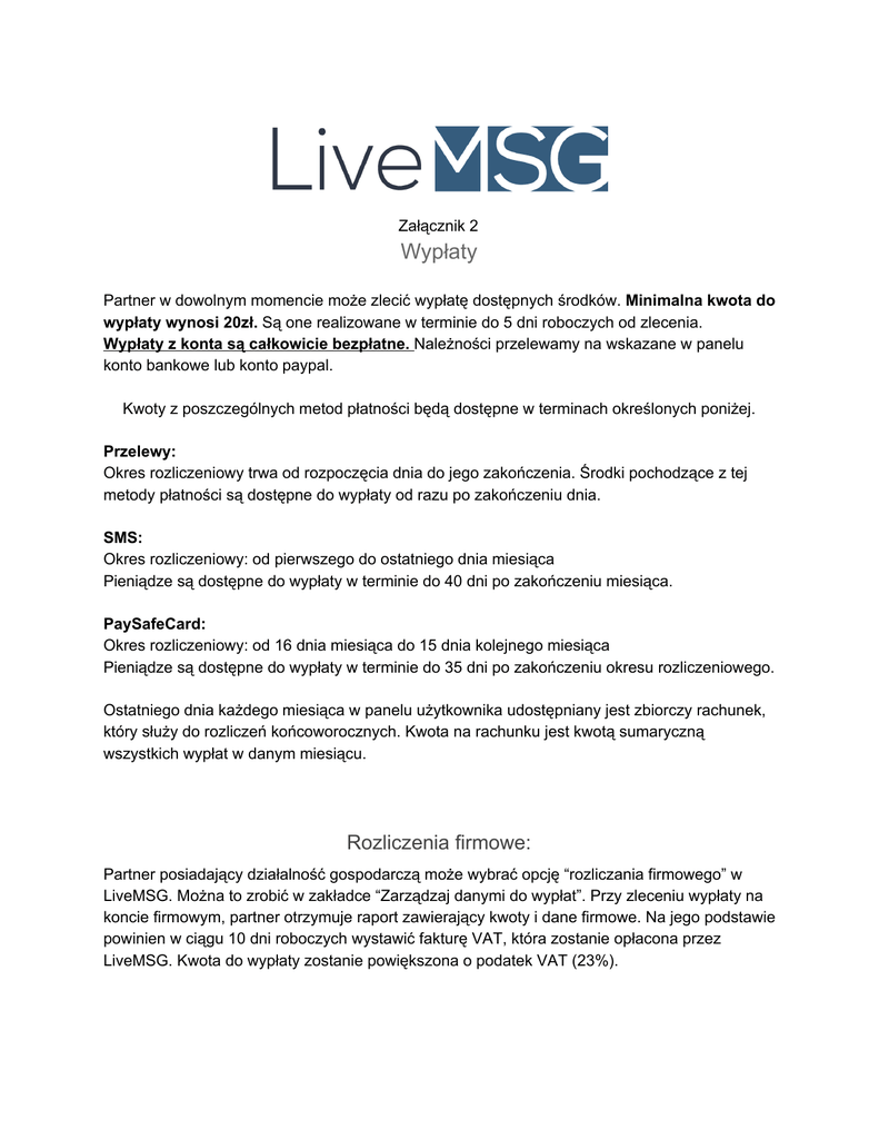 Załącznik 2 Wypłaty Partner w dowolnym momencie może zlecić wypłatę dostępnych środków. M inimalna kwota do wypłaty wynosi 20zł. Są one realizowane w terminie do 5 dni roboczych od zlecenia. Wypłaty z konta są całkowicie bezpłatne. Należności przelewamy na wskazane w panelu konto bankowe lub konto paypal. Kwoty z poszczególnych metod płatności będą dostępne w terminach określonych poniżej. Przelewy: Okres rozliczeniowy trwa od rozpoczęcia dnia do jego zakończenia. Środki pochodzące z tej metody płatności są dostępne do wypłaty od razu po zakończeniu dnia. SMS: Okres rozliczeniowy: od pierwszego do ostatniego dnia miesiąca Pieniądze są dostępne do wypłaty w terminie do 40 dni po zakończeniu miesiąca. PaySafeCard: Okres rozliczeniowy: od 16 dnia miesiąca do 15 dnia kolejnego miesiąca Pieniądze są dostępne do wypłaty w terminie do 35 dni po zakończeniu okresu rozliczeniowego. Ostatniego dnia każdego miesiąca w panelu użytkownika udostępniany jest zbiorczy rachunek, który służy do rozliczeń końcoworocznych. Kwota na rachunku jest kwotą sumaryczną wszystkich wypłat w danym miesiącu. Rozliczenia firmowe: Partner posiadający działalność gospodarczą może wybrać opcję “rozliczania firmowego” w LiveMSG. Można to zrobić w zakładce “Zarządzaj danymi do wypłat”. Przy zleceniu wypłaty na koncie firmowym, partner otrzymuje raport zawierający kwoty i dane firmowe. Na jego podstawie powinien w ciągu 10 dni roboczych wystawić fakturę VAT, która zostanie opłacona przez LiveMSG. Kwota do wypłaty zostanie powiększona o podatek VAT (23%). Wypłaty przedterminowe LiveMSG oferuje możliwość przedterminowej wypłaty środków z konta partnera. Opcja ta dotyczy wszystkich płatności dostępnych w panelu. Koszt wypłaty środków przed ich dostępnością wynosi 5% wypłaty. Przykład: Użytkownik do 10 marca zebrał w livemsg kwotę 500zł za pomocą płatności PaySafeCard. Chciałby wypłacić te pieniądze, ale standardowo będą one dostępne za ok. 55 dni. Postanowił jednak skorzystać z funkcji wypłaty przedterminowej. Na jego koncie pojawi się kwota 475zł, która będzie natychmiastowo gotowa do wypłaty. Jak obliczać kwotę do wypłaty: wybrana kwota * 0,95 LiveMSG może chwilowo wyłączyć opcje “Przedterminowych wypłat” w przypadku braku środków na tą opcję. Taka informacja będzie widniała w zakładce tej funkcji.