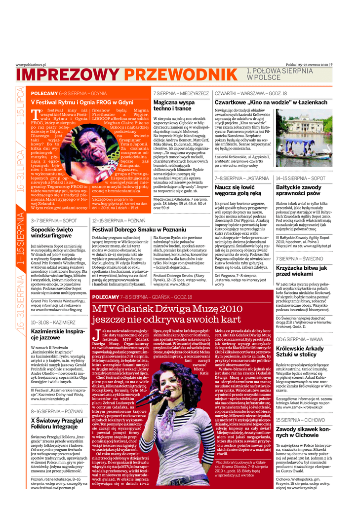 www.polskatimes.pl Polska | 25–27 czerwca 2010 | ? 16–31 SIERPNIA 1– 15 SIERPNIA 16–31 LIPCA 1–15 LIPCA IMPREZOWY PRZEWODNIK 1. POŁOWA SIERPNIA W POLSCE POLECAMY 6–8 SIERPNIA – GDYNIA 7 SIERPNIA – MIEDZYRZECZ CZWARTKI – WARSZAWA – GODZ. 18 V Festiwal Rytmu i Ognia FROG w Gdyni Magiczna wyspa techno i trance Czwartkowe „Kino na wodzie” w Łazienkach T o festiwal inny niż wszystkie! Mowa o Festiwalu Rytmu i Ognia FROG, który w sierpniu po raz piąty odbędzie się w Gdyni. Dlaczego jest taki wyjątkowy? Bo to kilka dni wypełnionych muzyką płynącą z egzotycznych bębnów i fireshow w wykonaniu najlepszych grup ogniowych z Polski i z zagranicy. Tegoroczny FROG to także warsztaty poi, tańca wywodzącego się z tradycji plemienia Maori żyjącego w Nowej Zelandii. W tym roku gwiazdami sceny fireshow będą: Magma Firetheater z Węgier, LOOOOP z Berlina oraz soliści Meghan Claire Pike ze Szkocji i najbardziej podziwiany na świecie firespinner Yuta z Japonii. Za doznania muzyczne odpowiedzialna będzie zaś Kumpania Algazarra, grupa z Portugalii specjalizująca się w energetycznej mieszance muzyki ludowej połączonej z brzmieniami ska. 3–7 SIERPNIA – SOPOT 12–15 SIERPNIA – POZNAŃ Sopockie święto windsurfingowe Festiwal Dobrego Smaku w Poznaniu Już niebawem Sopot zamieni się w europejską stolicę windsurfingu. W dniach od 3 do 7 sierpnia u wybrzeży Sopotu odbędzie się Grand Prix Formuła Windsurfingu, w którym udział wezmą światowi zawodnicy i mistrzowie Europy. Dla miłośników windsurfingu, kibiców i wszystkich, którym nieobce są sportowe emocje, to prawdziwe święto. Podczas zawodów Sopot stanie się miastem multijęzycznym. Grand Prix Formuła Windsurfingu, więcej informacji już niebawem na www.formulawindsurfing.org 10–31.08 – KAZIMIERZ Kazimierskie Inspiracje jazzowe W ramach II Festiwalu „Kazimierskie Inspiracje” na kazimierskim rynku wystąpią artyści z 9 krajów, m.in. wybitny wiedeński muzyk jazzowy Gerald Preinfalk wspólnie z zespołami, Andre Ohodlo – nowojorski muzyk freejazzowy, sopranistka Olga Szwajgier i wielu innych. III Festiwal „Kazimierskie Inspiracje”. Kazimierz Dolny nad Wisłą, www.kazimierzdolny.pl 8–16 SIERPNIA – POZNAŃ X Światowy Przegląd Folkloru Integracje Światowy Przegląd Folkloru „Integracje” zrzesza przede wszystkim zespoły folklorystyczne i ludowe. Od 2005 roku program festiwalu jest wzbogacony prezentacjami sportów tradycyjnych, uprawianych w dawnej Polsce, m.in. gry w pierścieniówkę. Jedyna nagroda przyznawana jest przez publiczność. Poznań, różne lokalizacje, 8–16 sierpnia, wstęp wolny, szczegóły na www.festiwal.awf.poznan.pl Szczegółowy program na www.frog-gdynia.pl, karnet na dwa dni – 20 zł, na 1 dzień – 15 zł Dokładny program najbardziej sycącej imprezy w Wielkopolsce nie jest jeszcze znany, ale już teraz można w ciemno obstawiać, że w dniach 12–15 sierpnia nikt nie wyjdzie z poznańskiego Starego Rynku głodny. IV edycja Festiwalu Dobrego Smaku to jak co roku spotkania z kucharzami, wystawcami i wszystkimi, którzy na co dzień parają się przygotowywaniem i handlem kulinarnymi frykasami. W sierpniu na jedną noc ośrodek wypoczynkowy Głębokie w Międzyrzeczu zamieni się w wielkopolską stolicę muzyki klubowej. Na imprezie Magic Island zagrają didżeje Andrew Bennett, Matt Cerf, Mike Shiver, Duderstadt, Miqro i Sentive. Jak zapowiadają organizatorzy: „To magiczna wyspa pełna pięknych trance’owych melodii, charakterystycznych house’owych brzmień, relaksujących chilloutowych klimatów. Będzie scena niejako unoszącą się na wodzie i wspaniała oprawa wizualna od laserów po światła podświetlające taflę wody”. Impreza rozpocznie się o godz. 18. Nawiązując do tradycji obiadów czwartkowych Łazienki Królewskie zapraszają do udziału w drugiej edycji projektu „Kino na wodzie”. Tym razem zobaczymy filmy historyczne. Partnerem projektu jest Filmoteka Narodowa. Bezpłatne pokazy będą się odbywały na scenie amfiteatru. Seanse rozpoczynać się będą po zmierzchu. Łazienki Królewskie, ul. Agrykola 1, amfiteatr, sierpniowe czwartki po zmierzchu, wstęp wolny 7–8 SIERPNIA – JASTARNIA 14–15 SIERPNIA – SOPOT Naucz się łowić węgorza gołą ręką Bałtyckie zawody sprawności psów Slalom i skok w dal to tylko kilka przeszkód, jakie będą musiały pokonać psy startujące w III Bałtyckich Zawodach Agility Sopot 2010. Pod wodzą swoich właścicieli mają za zadanie jak najsprawniej i jak najszybciej pokonać trasę. Na Starym Rynku nie powinno zabraknąć także pokazów mistrzów kuchni, spotkań autorskich, premier książek o tematyce kulinarnej, konkursów, koncertów i warsztatów dla łasuchów i nie tylko. No i tego co najważniejsze – licznych degustacji.... Jak przed laty łowiono węgorze, w jaki sposób rybacy przygotowywali sprzęt do pracy na morzu, będzie można zobaczyć podczas dorocznych Dni Węgorza. Atrakcją imprezy będzie z pewnością konkurs polegający na przeciąganiu kutra rybackiego oraz walki na bukszprycie – belce przerzuconej między dwiema jednostkami pływającymi. Śmiałkowie będą starali się za pomocą obijaczy zwalić przeciwnika do wody. Podczas Dni Węgorza odbędzie się również konkurs w łowieniu ryby gołą ręką. Komu się to uda, zabiera zdobycz. Festiwal Dobrego Smaku (Stary Rynek), 12–15 lipca, wstęp wolny, więcej na: www.ofds.pl Dni Węgorza, 7–8 sierpnia, Jastarnia, wstęp na imprezy jest wolny Międzyrzecz/Głębokie, 7 sierpnia, godz. 18, bilety: 39 zł, 45 zł, 50 zł oraz 59 zł POLECAMY 7–8 SIERPNIA – GDAŃSK – GODZ. 18 MTV Gdańsk Dźwiga Muzę 2010 jeszcze nie odkrywa swoich kart J ak na razie wiadome są jedynie daty tegorocznej edycji festiwalu MTV Gdańsk Dźwiga Muzę. Organizatorzy naswoichstronachinternetowych zapowiadająpodanieprogramuimprezy planowanej na 7 i 8 sierpnia. Miejmy nadzieję, że będzi