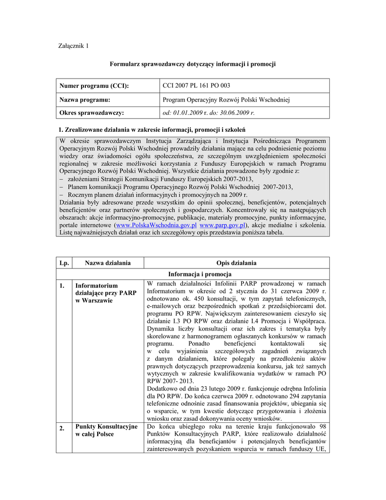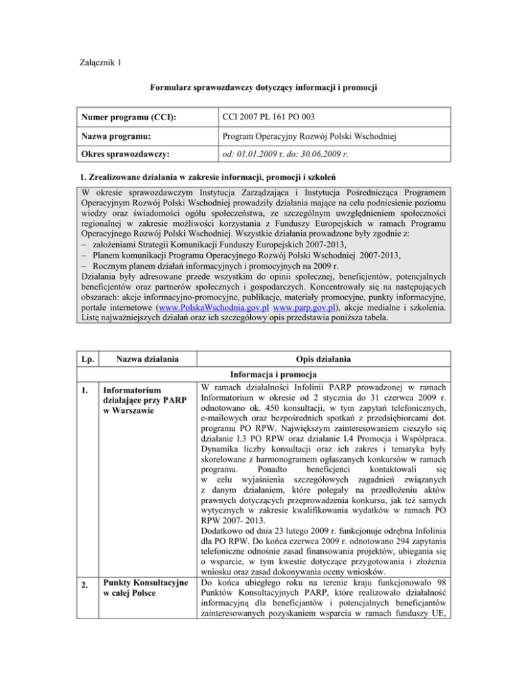 Załącznik 1 Formularz sprawozdawczy dotyczący informacji i promocji Numer programu (CCI): CCI 2007 PL 161 PO 003 Nazwa programu: Program Operacyjny Rozwój Polski Wschodniej Okres sprawozdawczy: od: 01.01.2009 r. do: 30.06.2009 r. 1. Zrealizowane działania w zakresie informacji, promocji i szkoleń W okresie sprawozdawczym Instytucja Zarządzająca i Instytucja Pośrednicząca Programem Operacyjnym Rozwój Polski Wschodniej prowadziły działania mające na celu podniesienie poziomu wiedzy oraz świadomości ogółu społeczeństwa, ze szczególnym uwzględnieniem społeczności regionalnej w zakresie moŜliwości korzystania z Funduszy Europejskich w ramach Programu Operacyjnego Rozwój Polski Wschodniej. Wszystkie działania prowadzone były zgodnie z: − załoŜeniami Strategii Komunikacji Funduszy Europejskich 2007-2013, − Planem komunikacji Programu Operacyjnego Rozwój Polski Wschodniej 2007-2013, − Rocznym planem działań informacyjnych i promocyjnych na 2009 r. Działania były adresowane przede wszystkim do opinii społecznej, beneficjentów, potencjalnych beneficjentów oraz partnerów społecznych i gospodarczych. Koncentrowały się na następujących obszarach: akcje informacyjno-promocyjne, publikacje, materiały promocyjne, punkty informacyjne, portale internetowe (www.PolskaWschodnia.gov.pl www.parp.gov.pl), akcje medialne i szkolenia. Listę najwaŜniejszych działań oraz ich szczegółowy opis przedstawia poniŜsza tabela. Lp. Nazwa działania 1. Informatorium działające przy PARP w Warszawie 2. Punkty Konsultacyjne w całej Polsce Opis działania Informacja i promocja W ramach działalności Infolinii PARP prowadzonej w ramach Informatorium w okresie od 2 stycznia do 31 czerwca 2009 r. odnotowano ok. 450 konsultacji, w tym zapytań telefonicznych, e-mailowych oraz bezpośrednich spotkań z przedsiębiorcami dot. programu PO RPW. Największym zainteresowaniem cieszyło się działanie I.3 PO RPW oraz działanie I.4 Promocja i Współpraca. Dynamika liczby konsultacji oraz ich zakres i tematyka były skorelowane z harmonogramem ogłaszanych konkursów w ramach programu. Ponadto beneficjenci kontaktowali się w celu wyjaśnienia szczegółowych zagadnień związanych z danym działaniem, które polegały na przedłoŜeniu aktów prawnych dotyczących przeprowadzenia konkursu, jak teŜ samych wytycznych w zakresie kwalifikowania wydatków w ramach PO RPW 2007- 2013. Dodatkowo od dnia 23 lutego 2009 r. funkcjonuje odrębna Infolinia dla PO RPW. Do końca czerwca 2009 r. odnotowano 294 zapytania telefoniczne odnośnie zasad finansowania projektów, ubiegania się o wsparcie, w tym kwestie dotyczące przygotowania i złoŜenia wniosku oraz zasad dokonywania oceny wniosków. Do końca ubiegłego roku na terenie kraju funkcjonowało 98 Punktów Konsultacyjnych PARP, które realizowało działalność informacyjną dla beneficjantów i potencjalnych beneficjantów zainteresowanych pozyskaniem wsparcia w ramach funduszy UE, 3 Ogólnopolska i regionalna kampania promocyjna PO RPW 4. Kampanie informacyjne o naborach do konkursów w tym wsparcia w zakresie Programu Operacyjnego Polski Wschodniej. W Rocznym Planie Działań Informacyjnych i Promocyjnych na 2009 r. zaplanowano wyłonienie kolejnych 22 Punktów Konsultacyjnych. W wyniku ogłoszonej II edycji Konkursu dla Wnioskodawców ubiegających się o wsparcie na prowadzenie Punktu Konsultacyjnego (PK) świadczącego bezpłatne usługi informacyjne dla przedsiębiorców i osób zamierzających rozpocząć działalność gospodarczą, wybrano 13 nowych Punktów Konsultacyjnych. W II półroczu br. planowana jest III edycja Konkursu na PK i wyłonienie kolejnych, co najmniej 9 Punktów Konsultacyjnych. W ramach działań informacyjno-promocyjnych IZ PO RPW zaplanowała na przełom III i IV kwartału 2009 r. przeprowadzenie kampanii medialnej promującej PO RPW.. Będzie to pierwsza kampania Programu o tak szerokim zasięgu, z wykorzystaniem róŜnych mediów równocześnie. W czerwcu 2009 r. została opracowana strategia mediowa kampanii. Na podstawie wyników I etapu badania ewaluacyjnego przygotowano brief kreatywny oraz zorganizowano przegląd ofert na koncepcję kreatywną kampanii jesiennej. W okresie sprawozdawczym IP PO RPW wyemitowała 4 ogłoszenia dotyczące uruchomienia konkursów w ramach PO RPW w wydaniu ogólnopolskim Gazety Wyborczej: 1. Działanie 1.3 „Wspieranie innowacji” - publikacja w dniu 20 lutego br. 2. Działanie 1.4 „Promocja i współpraca” Komponent Współpraca, obszar tworzenie polityki rozwoju regionalnego - publikacja w dniu 3 kwietnia 2009 r. 3. Działanie 1.4 „Promocja i współpraca” Komponent Promocja, obszar stworzenie współpracy centrów obsługi inwestora – publikacja w dniu 3 kwietnia 2009 r. 4. Działanie 1.4 Promocja i współpraca” Komponent Współpraca, obszar tworzenie i rozwój klastrów – publikacja w dniu 3 kwietnia 2009 r. W następujących tytułach prasy regionalnej: „Echo Dnia’, „Gazeta Współczesna”, „Dziennik Wschodni”, „Nowiny” oraz „Gazeta Olsztyńska” + „Dziennik Elbląski”, ukazały się równocześnie po 2 emisje ogłoszeń (łącznie 10 ogłoszeń) dotyczących PO RPW: 1. Działanie 1.3 „Wspieranie innowacji” – publikacja w dniu 6 marca 2009 r. 2. Działanie 1.4 „Promocja i współpraca” w obszarach tworzenie polityki rozwoju regionalnego, stworzenie współpracy centrów obsługi inwestora, tworzenie i rozwój klastrów - publikacja w dniu 6 kwietnia 2009 r. Ponadto w okresie sprawozdawczym odbyło się 5 audycji radiowych o zasięgu lokalnym; audycje dotyczyły działań I.4 oraz I.3. Kampania odbyła się w terminie pomiędzy 25 marca a 8 kwietnia 2009 r., równocześnie w 5 regionalnych rozgłośniach Polskiego Radia: Olsztyn, Białystok, Lublin, Kielce oraz Rzeszów. Kampania obejmowała w kaŜdej z w/w rozgłośni regionalnej: emisję 6 zapowiedzi dotyczących ogłoszenia konkursów z działania I.3 o