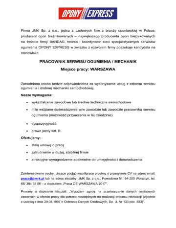 Firma JMK Sp. z o.o., jedna z czołowych firm z branży oponiarskiej w Polsce, producent opon bieżnikowanych – największego producenta opon bieżnikowanych na świecie firmy BANDAG, twórca i koordynator sieci specjalistycznych serwisów ogumienia OPONY EXPRESS w związku z rozwojem firmy poszukuje kandydata na stanowisko: PRACOWNIK SERWISU OGUMIENIA / MECHANIK Miejsce pracy: WARSZAWA Zatrudniona osoba będzie odpowiedzialna za wykonywanie usług z zakresu serwisu ogumienia i drobnej mechaniki samochodowej. Nasze wymagania: wykształcenie zawodowe lub średnie techniczne samochodowe mile widziane doświadczenie w/w zawodzie lub zawodzie pracownika serwisu ogumienia (możliwość przyuczenia w tej dziedzinie) dyspozycyjność prawo jazdy kat. B Ofertujemy: stałą umowę o pracę zatrudnienie w dużej, stabilnej firmie atrakcyjne wynagrodzenie adekwatne do umiejętności i doświadczenia Zainteresowane osoby, chcące podjąć współpracę prosimy o przesyłanie CV na adres email: [email protected] lub na adres siedziby: JMK Sp. z o.o., Powodowo 51, 64-200 Wolsztyn, tel. 68/ 384 38 56 – z dopiskiem „Praca OE WARSZAWA 2017”. Prosimy o dopisanie klauzuli: „Wyrażam zgodę na przetwarzanie danych osobowych zawartych w ofercie pracy dla potrzeb niezbędnych do realizacji procesu rekrutacji (zgodnie z ustawą z dnia 29.08.1997 o Ochronie Danych Osobowych, Dz. U. Nr 133 poz. 833)”.