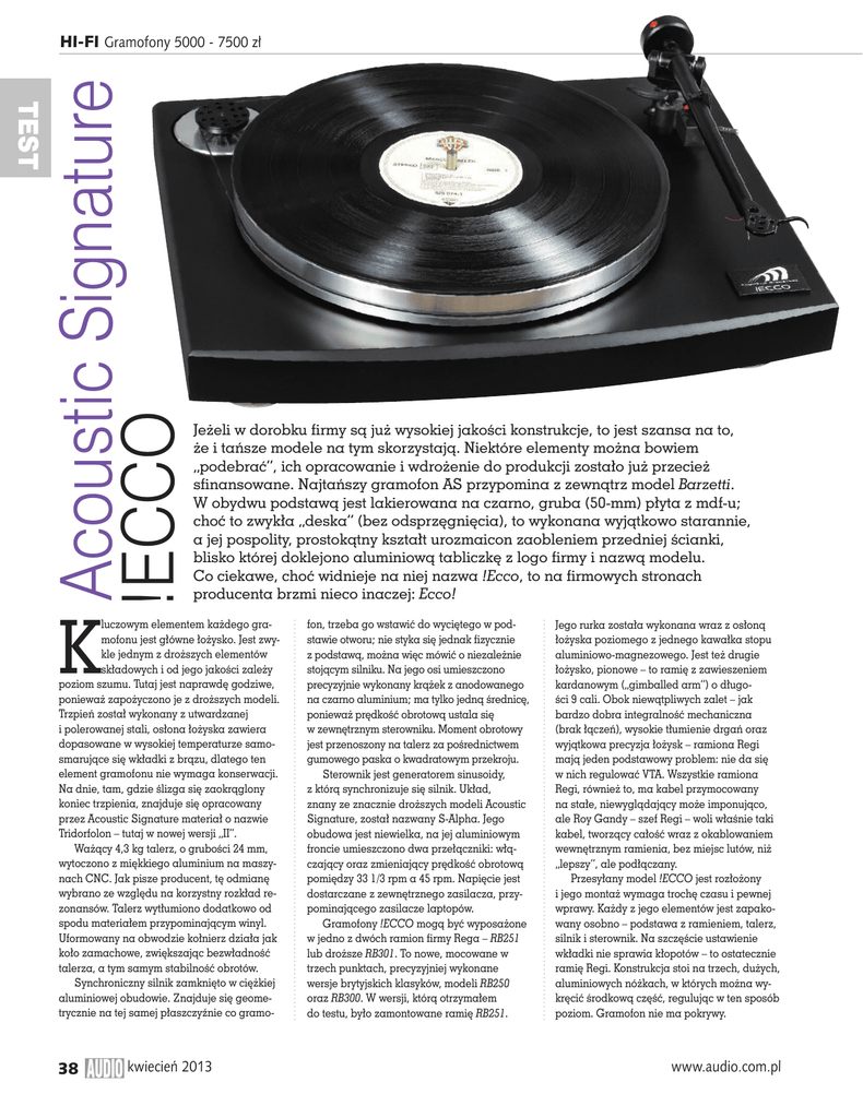 TEST Acoustic Signature !ECCO HI-FI Gramofony 5000 - 7500 zł K Jeżeli w dorobku firmy są już wysokiej jakości konstrukcje, to jest szansa na to, że i tańsze modele na tym skorzystają. Niektóre elementy można bowiem „podebrać”, ich opracowanie i wdrożenie do produkcji zostało już przecież sfinansowane. Najtańszy gramofon AS przypomina z zewnątrz model Barzetti. W obydwu podstawą jest lakierowana na czarno, gruba (50-mm) płyta z mdf-u; choć to zwykła „deska” (bez odsprzęgnięcia), to wykonana wyjątkowo starannie, a jej pospolity, prostokątny kształt urozmaicon zaobleniem przedniej ścianki, blisko której doklejono aluminiową tabliczkę z logo firmy i nazwą modelu. Co ciekawe, choć widnieje na niej nazwa !Ecco, to na firmowych stronach producenta brzmi nieco inaczej: Ecco! luczowym elementem każdego gramofonu jest główne łożysko. Jest zwykle jednym z droższych elementów składowych i od jego jakości zależy poziom szumu. Tutaj jest naprawdę godziwe, ponieważ zapożyczono je z droższych modeli. Trzpień został wykonany z utwardzanej i polerowanej stali, osłona łożyska zawiera dopasowane w wysokiej temperaturze samosmarujące się wkładki z brązu, dlatego ten element gramofonu nie wymaga konserwacji. Na dnie, tam, gdzie ślizga się zaokrąglony koniec trzpienia, znajduje się opracowany przez Acoustic Signature materiał o nazwie Tridorfolon – tutaj w nowej wersji „II”. Ważący 4,3 kg talerz, o grubości 24 mm, wytoczono z miękkiego aluminium na maszynach CNC. Jak pisze producent, tę odmianę wybrano ze względu na korzystny rozkład rezonansów. Talerz wytłumiono dodatkowo od spodu materiałem przypominającym winyl. Uformowany na obwodzie kołnierz działa jak koło zamachowe, zwiększając bezwładność talerza, a tym samym stabilność obrotów. Synchroniczny silnik zamknięto w ciężkiej aluminiowej obudowie. Znajduje się geometrycznie na tej samej płaszczyźnie co gramo- 38 kwiecień 2013 fon, trzeba go wstawić do wyciętego w podstawie otworu; nie styka się jednak fizycznie z podstawą, można więc mówić o niezależnie stojącym silniku. Na jego osi umieszczono precyzyjnie wykonany krążek z anodowanego na czarno aluminium; ma tylko jedną średnicę, ponieważ prędkość obrotową ustala się w zewnętrznym sterowniku. Moment obrotowy jest przenoszony na talerz za pośrednictwem gumowego paska o kwadratowym przekroju. Sterownik jest generatorem sinusoidy, z którą synchronizuje się silnik. Układ, znany ze znacznie droższych modeli Acoustic Signature, został nazwany S-Alpha. Jego obudowa jest niewielka, na jej aluminiowym froncie umieszczono dwa przełączniki: włączający oraz zmieniający prędkość obrotową pomiędzy 33 1/3 rpm a 45 rpm. Napięcie jest dostarczane z zewnętrznego zasilacza, przypominającego zasilacze laptopów. Gramofony !ECCO mogą być wyposażone w jedno z dwóch ramion firmy Rega – RB251 lub droższe RB301. To nowe, mocowane w trzech punktach, precyzyjniej wykonane wersje brytyjskich klasyków, modeli RB250 oraz RB300. W wersji, którą otrzymałem do testu, było zamontowane ramię RB251. Jego rurka została wykonana wraz z osłoną łożyska poziomego z jednego kawałka stopu aluminiowo-magnezowego. Jest też drugie łożysko, pionowe – to ramię z zawieszeniem kardanowym („gimballed arm”) o długości 9 cali. Obok niewątpliwych zalet – jak bardzo dobra integralność mechaniczna (brak łączeń), wysokie tłumienie drgań oraz wyjątkowa precyzja łożysk – ramiona Regi mają jeden podstawowy problem: nie da się w nich regulować VTA. Wszystkie ramiona Regi, również to, ma kabel przymocowany na stałe, niewyglądający może imponująco, ale Roy Gandy – szef Regi – woli właśnie taki kabel, tworzący całość wraz z okablowaniem wewnętrznym ramienia, bez miejsc lutów, niż „lepszy”, ale podłączany. Przesyłany model !ECCO jest rozłożony i jego montaż wymaga trochę czasu i pewnej wprawy. Każdy z jego elementów jest zapakowany osobno – podstawa z ramieniem, talerz, silnik i sterownik. Na szczęście ustawienie wkładki nie sprawia kłopotów – to ostatecznie ramię Regi. Konstrukcja stoi na trzech, dużych, aluminiowych nóżkach, w których można wykręcić środkową część, regulując w ten sposób poziom. Gramofon nie ma pokrywy. www.audio.com.pl ODSŁUCH To doskonale wyważony dźwięk. Nie „doskonały”, bo z typowymi dla niedrogich gramofonów problemami i ograniczeniami, ale przy tym świetnie ułożony, zharmonizowany. Nie ma w nim miejsca na ostrość i jaskrawość. Wydaje się, że najwyższa góra jest lekko wycofana, podobnie zresztą jak najniższy dół. Do tej obserwacji dochodzimy jednak stopniowo, „ucząc” się tego dźwięku, a nie w krótkim demo. Wszystko, co znajduje się pomiędzy, jest nasycone i ma niezłą dynamikę. Brzmienie nie jest ciepłe, choć niski środek – delikatnie wzmocniony, atak zaokrąglony, a góra pasma wygładzona. Ponieważ jednak wyższa średnica jest mocna i otwarta, nie ma się wrażenia spowolnienia ani stłumienia. Po stronie pozytywów należy zapisać zredukowane trzaski i szum przesuwu – oczywiście jak na gramofon, bo nie obiecuję, że ich w ogóle nie będzie. W !ECCO są na bardzo niskim poziomie, mimo że głosy są mocne i bezpośrednie. Także elementy perkusyjne są dźwięczne i różnicowane, co było słychać i z akustycznym materiałem z płyty Keitha Jarretta „The Survivors’ Suite”, jak i z elektronicznym materiałem z „Caverna Magica” Vollenveidera. Uderzona blacha wybrzmiewa długo, a mimo to słyszymy nutę słodyczy. Z drugiej strony nie dostaniemy czegoś, co pojawia się w przypadku droższych konstrukcji – efektu „zawieszenia” między kolumnami nowej przestrzeni, przeniesionej ze studia. To niezwykłe przeżycie, kiedy po opuszczeniu igły wchodzimy w inny świat. Tutaj go nie ma – i nie ma w żadnym innym gramofonie za te pienią