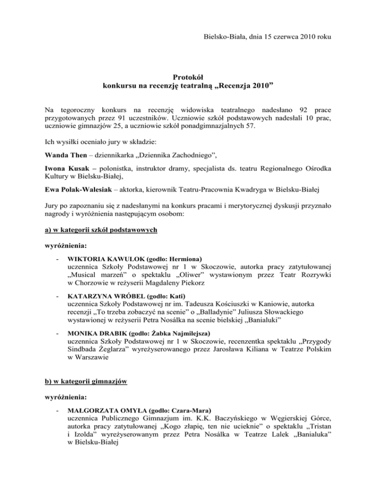 Bielsko-Biała, dnia 15 czerwca 2010 roku Protokół konkursu na recenzję teatralną „Recenzja 2010” Na tegoroczny konkurs na recenzję widowiska teatralnego nadesłano 92 prace przygotowanych przez 91 uczestników. Uczniowie szkół podstawowych nadesłali 10 prac, uczniowie gimnazjów 25, a uczniowie szkół ponadgimnazjalnych 57. Ich wysiłki oceniało jury w składzie: Wanda Then – dziennikarka „Dziennika Zachodniego”, Iwona Kusak – polonistka, instruktor dramy, specjalista ds. teatru Regionalnego Ośrodka Kultury w Bielsku-Białej, Ewa Polak-Walesiak – aktorka, kierownik Teatru-Pracownia Kwadryga w Bielsku-Białej Jury po zapoznaniu się z nadesłanymi na konkurs pracami i merytorycznej dyskusji przyznało nagrody i wyróŜnienia następującym osobom: a) w kategorii szkół podstawowych wyróŜnienia: - WIKTORIA KAWULOK (godło: Hermiona) uczennica Szkoły Podstawowej nr 1 w Skoczowie, autorka pracy zatytułowanej „Musical marzeń” o spektaklu „Oliwer” wystawionym przez Teatr Rozrywki w Chorzowie w reŜyserii Magdaleny Piekorz - KATARZYNA WRÓBEL (godło: Kati) uczennica Szkoły Podstawowej nr im. Tadeusza Kościuszki w Kaniowie, autorka recenzji „To trzeba zobaczyć na scenie” o „Balladynie” Juliusza Słowackiego wystawionej w reŜyserii Petra Nosálka na scenie bielskiej „Banialuki” - MONIKA DRABIK (godło: śabka Najmilejsza) uczennica Szkoły Podstawowej nr 1 w Skoczowie, recenzentka spektaklu „Przygody Sindbada śeglarza” wyreŜyserowanego przez Jarosława Kiliana w Teatrze Polskim w Warszawie b) w kategorii gimnazjów wyróŜnienia: - MAŁGORZATA OMYŁA (godło: Czara-Mara) uczennica Publicznego Gimnazjum im. K.K. Baczyńskiego w Węgierskiej Górce, autorka pracy zatytułowanej „Kogo złapię, ten nie ucieknie” o spektaklu „Tristan i Izolda” wyreŜyserowanym przez Petra Nosálka w Teatrze Lalek „Banialuka” w Bielsku-Białej - JUSTYNA POLOK (godło: Królewna) uczennica Gimnazjum nr 4 w Skoczowie, która zrecenzowała „Przygody Sindbada śeglarza” Bolesława Leśmiana wystawione w Teatrze Polskim w Warszawie w reŜyserii Jarosława Kiliana III nagroda – nie przyznano II nagroda – PAULINA NAPIERAŁA (godło: Peli) uczennica Gimnazjum nr 11 w Bielsku-Białej, recenzentka inscenizacji ksiąŜki Jose Mauro Vascocelosa „Moje drzewko pomarańczowe” wyreŜyserowanej przez Roberta Talarczyka na scenie Teatru Polskiego w Bielsku-Białej I nagroda – MAŁGORZATA PIETRUSIAK (godło: Dzwoneczek) uczennica Gimnazjum nr 11 im. Jerzego Kukuczki w Bielsku-Białej, która nadesłała na konkurs pracę „Układ układowi nierówny” recenzującą spektakl Teatru Polskiego w Bielsku-Białej „Proszę, zrób mi dziecko” wyreŜyserowany przez Karola Suszkę b) w kategorii szkół ponadgimnazjalnych wyróŜnienia: - MARLENA RYCOMBEL (godło: Modjeska) uczennica I Liceum Ogólnokształcącego im. Stefana Czarnieckiego w Chełmie, autorka pracy zatytułowanej „Utopieni w amerykańskiej utopii” o przedstawieniu „Kamienie w kieszeniach” Marie Jones wystawionym przez lubelską Scenę Prapremier „In Vitro” - ANGELIKA WEBERMAN (godło: Charrylightness) mieszkanka Chełma, recenzentka widowiska wyreŜyserowanego przez Łukasza WittaMichałowskiego na podstawie prozy Marie Jones „Kamienie w kieszeniach na Scenie Prapremier „In Vitro” w Lublinie III miejsce – ELIZA BROśEK (godło: Lilith) uczennica IV Liceum Ogólnokształcącego im. KEN-u w Bielsku-Białej, która nadesłała na konkurs recenzję zatytułowaną „Słodko-gorzki smak małŜeństwa” o przedstawieniu „Oskar i Ruth” Ingmara Villqista w reŜyserii Jana Buchwalda zrealizowany w Teatrze Stara Prochownia w Warszawie III miejsce – SANDRA GĄSIOR (godło: Via Nocturna) uczennica I Liceum Ogólnokształcącego w Zespole Szkół im. 14 Pułku Powstańców Śląskich w Wodzisławiu Śląskim, autorka pracy „Przekleństwo nieśmiertelności” o spektaklu „Dracula” wystawionym na scenie Teatru im. Juliusza Słowackiego w Krakowie w reŜyserii Artura Tyszkiewicza II miejsce – AGATA CHYLA (godło: Tu-Tiki) uczennica IV Liceum Ogólnokształcącego im. KEN-u w Bielsku-Białej, która nadesłała na konkurs pracę recenzującą przedstawienie „Zielony Wędrowiec” Liliany Bardijewskiej zrealizowane przez Pawła Aignera z aktorami bielskiej „Banialuki” I miejsce – PAULINA SAWA (godło: Ruda 102 a i Ruda 102 b) uczennica I Liceum Ogólnokształcącego im. Stefana Czarnieckiego w Chełmie, która nadesłała na konkurs dwie prace: „śyzń - kopiejka” o „Płatonowie” Antoniego Czechowa wyreŜyserowanym przez Maję Kleczewską w Teatrze Polskim w Bydgoszczy oraz „O dwóch takich, co wierzyli w cuda” stanowiącej recenzję spektaklu lubelskiej Sceny Prapremier „InVitro” „Kamienie w kieszeniach” w reŜyserii Łukasza Witta-Michałowskiego UWAGI: Jury cieszy stale rosnące zainteresowanie imprezą, co w tej edycji przełoŜyło się a rekordową liczbę prac nadesłanych na konkurs. Poziom prac był dosyć wyrównany, a one same nosiły znamiona recenzji. NajwyŜej oceniane były te prace, które odznaczały się ciekawszą i bardziej przemyślaną formą oraz wnikliwszym lub bardziej osobistym ujęciem teatralnych aspektów recenzowanych spektakli. Zachęcamy do dalszego pogłębiania wiedzy z zakresu teatru, oglądania wielu róŜnorodnych w stylistyce i konwencji przedstawień. Sugerujemy odwaŜniejsze wykraczanie z analizą przedstawień poza ocenę gry aktorskiej i zwrócenie większej uwagi na inne elementy tworzące widowisko teatralne. Niektóre prace charakteryzował pewien schematyzm ujęcia i naduŜywanie mocno juŜ wyświechtanych określeń w stylu: „wspaniała gra aktorska” czy „aktorzy wznieśli się na wyŜyny sztuki teatralnej”. Przypominamy teŜ, Ŝe recenzja róŜni się formą od sprawozdania i w związku z tym nie naleŜy jej rozpoczynać od słów „Dnia ... poszliśmy do teatru ... na przedstawienie.