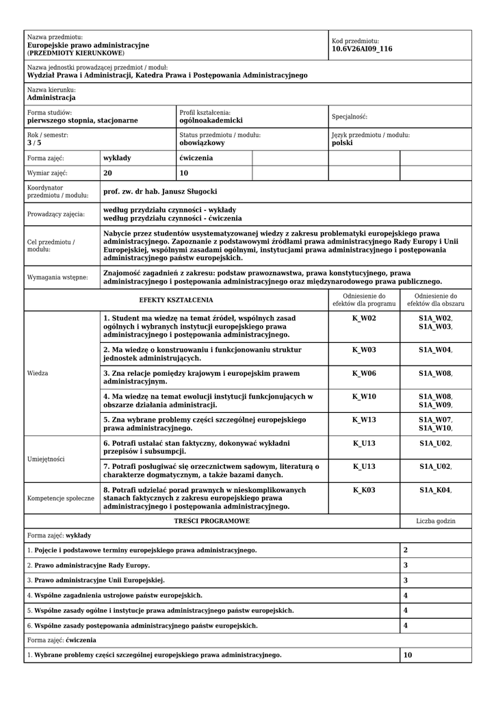 Nazwa przedmiotu: Kod przedmiotu: Europejskie prawo administracyjne 10.6V26AI09_116 (PRZEDMIOTY KIERUNKOWE) Nazwa jednostki prowadzącej przedmiot / moduł: Wydział Prawa i Administracji, Katedra Prawa i Postępowania Administracyjnego Nazwa kierunku: Administracja Forma studiów: Profil kształcenia: pierwszego stopnia, stacjonarne ogólnoakademicki Rok / semestr: 3/5 Status przedmiotu / modułu: Język przedmiotu / modułu: obowiązkowy polski Specjalność: Forma zajęć: wykłady ćwiczenia Wymiar zajęć: 20 10 Koordynator przedmiotu / modułu: prof. zw. dr hab. Janusz Sługocki Prowadzący zajęcia: według przydziału czynności - wykłady według przydziału czynności - ćwiczenia Cel przedmiotu / modułu: Nabycie przez studentów usystematyzowanej wiedzy z zakresu problematyki europejskiego prawa administracyjnego. Zapoznanie z podstawowymi źródłami prawa administracyjnego Rady Europy i Unii Europejskiej, wspólnymi zasadami ogólnymi, instytucjami prawa administracyjnego i postępowania administracyjnego państw europejskich. Wymagania wstępne: Znajomość zagadnień z zakresu: podstaw prawoznawstwa, prawa konstytucyjnego, prawa administracyjnego i postępowania administracyjnego oraz międzynarodowego prawa publicznego. Odniesienie do efektów dla programu Odniesienie do efektów dla obszaru 1. Student ma wiedzę na temat źródeł, wspólnych zasad ogólnych i wybranych instytucji europejskiego prawa administracyjnego i postępowania administracyjnego. K_W02 S1A_W02, S1A_W03, 2. Ma wiedzę o konstruowaniu i funkcjonowaniu struktur jednostek administrujących. K_W03 S1A_W04, 3. Zna relacje pomiędzy krajowym i europejskim prawem administracyjnym. K_W06 S1A_W08, 4. Ma wiedzę na temat ewolucji instytucji funkcjonujących w obszarze działania administracji. K_W10 S1A_W08, S1A_W09, 5. Zna wybrane problemy części szczególnej europejskiego prawa administracyjnego. K_W13 S1A_W07, S1A_W10, 6. Potrafi ustalać stan faktyczny, dokonywać wykładni przepisów i subsumpcji. K_U13 S1A_U02, 7. Potrafi posługiwać się orzecznictwem sądowym, literaturą o charakterze dogmatycznym, a także bazami danych. K_U13 S1A_U02, 8. Potrafi udzielać porad prawnych w nieskomplikowanych stanach faktycznych z zakresu europejskiego prawa administracyjnego i postępowania administracyjnego. K_K03 S1A_K04, EFEKTY KSZTAŁCENIA Wiedza Umiejętności Kompetencje społeczne TREŚCI PROGRAMOWE Liczba godzin Forma zajęć: wykłady 1. Pojęcie i podstawowe terminy europejskiego prawa administracyjnego. 2 2. Prawo administracyjne Rady Europy. 3 3. Prawo administracyjne Unii Europejskiej. 3 4. Wspólne zagadnienia ustrojowe państw europejskich. 4 5. Wspólne zasady ogólne i instytucje prawa administracyjnego państw europejskich. 4 6. Wspólne zasady postępowania administracyjnego państw europejskich. 4 Forma zajęć: ćwiczenia 1. Wybrane problemy części szczególnej europejskiego prawa administracyjnego. 10 Metody kształcenia Prezentacja multimedialna. Analiza tekstów z dyskusją. Nr efektu kształcenia z sylabusa Metody weryfikacji efektów kształcenia Forma i warunki zaliczenia * zajęcia praktyczne (weryfikacja poprzez obserwację) 1,2,3,4,5,6,7,8, * egzamin pisemny 1,2,3,4,5,6,7,8, Zaliczenie na podstawie obecności na ćwiczeniach i pozytywnego wyniku egzaminu. Egzamin w formie testu jednokrotnego wyboru obejmuje znajomość zagadnień omówionych w trakcie zajęć oraz zalecanej literatury przedmiotu. Zasady oceniania są następujące: - na ocenę 3,0 - od 50 %, - na ocenę 3,5 - od 65 %, - na ocenę 4,0 - od 75 %, - na ocenę 4,5 - od 85 %, - na ocenę 5 - od 90%. Ocena z egzaminu stanowi ocenę końcową. Literatura podstawowa Krawiec G. (2009): Europejskie prawo administracyjne. Oficyna a Wolters Kluwer business Literatura uzupełniająca Janku Z., Leoński Z.,Szewczyk M., Waligórski M., Wojtczak K. (red.) (2005): Europeizacja polskiego prawa administracyjnego. Kolonia Limited Kmieciak Z. (2010): Postępowanie administracyjne i sądowoadministracyjne a prawo europejskie. Wolters Kluwer Świątkiewicz J. (2007): Europejski kodeks dobrej administracji (wprowadzenie, tekst i komentarz o zastosowaniu kodeksu w warunkach polskich procedur administracyjnych). Biuro Rzecznika Praw Obywatelskich NAKŁAD PRACY STUDENTA: Liczba godzin Zajęcia dydaktyczne 30 Udział w konsultacjach 12 Zdawanie egzaminu lub/i zaliczenia 2 Przygotowanie się do zajęć 14 Studiowanie literatury 24 Przygotowanie się do egzaminu lub/i zaliczenia 18 ŁĄCZNY nakład pracy studenta w godz. 100 Liczba punktów ECTS 4
