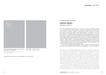 Kuratorium – CURATORIUM Edyta Ołdak, Patryk Pawlaczyk zdjęcia niedostępne w wersji internetowej Uwolnić projekt Release Project Prof. Cezary Obracht-Prondzyński słusznie zauważył, że współczesne przedmioty odnoszące się do kultur ludowych niosą informacje o społecznych oczekiwaniach, wyobrażeniach o własnej historii i tożsamości. „Mówią” o tym, jak chcemy widzieć samych siebie i jak chcemy przedstawiać siebie innym. Każde „użycie” kultury ludowej – bez względu na to, czy jest przetworzeniem o wysokich wartościach estetycznych czy banalną transpozycją – jest istotną informacją o nas samych, społeczeństwie polskim pierwszych dekad XXI wieku, które wytwarza przedmioty odnoszące się do „kultury ludowej”, ale przede wszystkim je konsumuje (Kulikowska, Obracht-Prondzyński: 2012). Można zadać pytanie, czego możemy się dzięki nim dowiedzieć o „kulturze ludowej” rozumianej jako historyczna formacja społeczno-kulturowa lub natrafić na jej kolejne, jak najbardziej współczesne odczytanie. Wnikliwie obserwując przebieg i rezultaty projektu, możemy zauważyć mechanizmy korzystania z dziedzictwa kulturowego, a także rolę muzeum etnograficznego w jego tworzeniu. W tym miejscu przyjrzyjmy się bliżej kolekcji i samemu „muzeum” jako instytucji, która wypracowała szereg rozmaitych technik naturalizujących i neutralizujących – tak, aby to, co społeczne Stołek z kolekcji Państwowego Muzeum Etnograficznego w Warszawie, nr inw. PME 5530. Stool from The State Ethnographic Museum in Warsaw Collection, no. PME 5530. Stołek „Stółek” – projekt Artur Gosk. Stool „Stółek” – design by Artur Gosk. Fotografie/Photos by E. Koprowski, Archiwum PME/from the Archives of SEM. 288 As professor Cezary Obracht-Prondzyński rightly pointed out, contemporary objects referring to folk cultures carry information about social expectations and notions about their own history and identity. They “tell” us how we want to perceive ourselves and how we want to present ourselves to other people. Each “use” of folk culture, regardless if it is a transformation with high aesthetic value or a banal transposition, is a piece of important information about ourselves, the Polish society at the beginning of the new millennium, which – despite producing items referring to “folk culture” – mostly consumes them (Kulikowska, Obracht-Prondzyński: 2012). What can we learn from them about “folk culture,” understood as historical, social and cultural formation? Can they lead us to another, more modern interpretation of this term? Careful observation of the project’s course and results shows us the mechanisms of utilising cultural heritage, as well as the role of the ethnographic museum in the process. Let us take a closer look at collections and the “museum” as an institution which has developed a number of various naturalizing and neutralizing techniques, so what is socially and culturally constructed is seen as “natural” and obvious. Objects become part of collections, become museum objects, because a discourse (theories, notions, regulations) is built around etnografia nowa | the new ethnography 06|2014 289 E dy ta O ł da k , Pat r y k Paw l ac z y k | Uwolnić projekt Release Project i kulturowo konstruowane jawiło się jako „naturalne” i oczywiste. Przedmioty trafiają do kolekcji, stają się obiektami, ponieważ budowany jest wokół nich dyskurs (teorie, pojęcia, regulacje). Dzięki tym kulturowym praktykom obiekty są wytwarzane, a jednocześnie otrzymują status dziedzictwa. Muzealnicy i specjaliści używają określonych pojęć, standardów i regulacji, aby osadzić zjawiska kulturowe i ich podmioty w sferze tradycji, gdzie stają się przykładami dziedzictwa materialnego. Działania i efekty pracy projektantów odnoszących się do spuścizny „kultury ludowej” często tłumaczy się jako twórczy powrót do korzeni, tradycji, natury. Podobnie „kultura ludowa” opisana po wielokroć i w dużym stopniu zrodzona przez te opisy jawi się jako naturalna, pierwotna, rdzenna, czysta i prawdziwa. Dzięki podobnym wyobrażeniom można łatwo uzyskać spójną wizję rzeczywistości kulturowej, wierząc, że opiera się na procesie kumulacji wiedzy i wartości. W swoich założeniach projektanci inspirujący się kulturą tradycyjną, stawiają efekty swojej pracy w opozycji do masowości kultury popularnej. Pojawia się twierdzenie, że model produkcji zgodny jest z ideą zrównoważonego rozwoju i stanowi alternatywę dla produkcji masowej, co jest „istotą rzemiosła”. Stanowi to przykład manifestacji braku zaangażowania w kulturę masową i świadomego poszukiwania alternatywy estetycznej. Gordon Mathews w Supermarkecie kultury, zauważył, że: „Czasami wybór konkretnej kultury przedstawiają jako korzenie, lecz w rzeczywistości jest to zawsze wybór, autokreacja, jedna z wersji możliwych do realizacji” (Mathews 2005: 267). Wbrew sądom i oczekiwaniom twórców, przedmioty inspirowane wzorami etnicznej czy lokalnej odmienności wpisują się w proces „utowarowienia” kultury. Wśród przedmiotów inspirowanych obiektami z kolekcji muzealnej them. Thanks to these cultural techniques objects are both produced and simultaneously receive a heritage status. Museologists and experts use certain terms, standards and regulations to anchor cultural phenomena and their subjects on the plane of tradition, where they become examples of material heritage. The activities and work results of designers referring to the legacy of “folk culture” are often explained as a return to the roots, tradition and nature. Similarly, the repeatedly described “folk culture,” to a large extent begotten by these descriptions, appears natural, primal, original, clear and true. Such notions help in achieving a cohesive vision of cultural reality, assuming it depends on the process of accumulating knowledge 