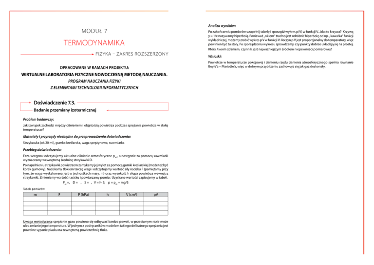 Analiza wyników: MODUŁ 7 Po zakończeniu pomiarów uzupełnij tabelę i sporządź wykres p(V) w funkcji V. Jaka to krzywa? Krzywą y = 1/x nazywamy hiperbolą. Ponieważ „okiem” trudno jest odróżnić hiperbolę od np. „kawałka” funkcji wykładniczej, możemy zrobić wykres p∙V w funkcji V. Iloczyn p∙V jest proporcjonalny do temperatury, więc powinien być tu stały. Po sporządzeniu wykresu sprawdzamy, czy punkty dobrze układają się na prostej. Który, twoim zdaniem, czynnik jest najważniejszym źródłem niepewności pomiarowej? TERMODYNAMIKA FIZYKA – ZAKRES ROZSZERZONY Powietrze w temperaturze pokojowej i ciśnieniu rzędu ciśnienia atmosferycznego spełnia równanie Boyle’a – Mariotte’a, więc w dobrym przybliżeniu zachowuje się jak gaz doskonały. OPRACOWANE W RAMACH PROJEKTU: WIRTUALNE LABORATORIA FIZYCZNE NOWOCZESNĄ METODĄ NAUCZANIA. PROGRAM NAUCZANIA FIZYKI Z ELEMENTAMI TECHNOLOGII INFORMATYCZNYCH Doświadczenie 7.3. Badanie przemiany izotermicznej Problem badawczy: Jaki związek zachodzi między ciśnieniem i objętością powietrza podczas sprężania powietrza w stałej temperaturze? Materiały i przyrządy niezbędne do przeprowadzenia doświadczenia: Strzykawka (ok.20 ml), gumka kreślarska, waga sprężynowa, suwmiarka Przebieg doświadczenia: Faza wstępna: odczytujemy aktualne ciśnienie atmosferyczne pat,, a następnie za pomocą suwmiarki wyznaczamy wewnętrzną średnicę strzykawki D. Po napełnieniu strzykawki powietrzem zamykamy jej wylot za pomocą gumki kreślarskiej (może też być korek gumowy). Naciskamy tłokiem tarczę wagi i odczytujemy wartość siły nacisku F (pamiętamy przy tym, że waga wyskalowana jest w jednostkach masy, m) oraz wysokość h słupa powietrza wewnątrz strzykawki. Zmieniamy wartość nacisku i powtarzamy pomiar. Uzyskane wartości zapisujemy w tabeli. Pat =, D = , S = , V = h∙ S, p = pat + mg/S Tabela pomiarów m F P (hPa) h V (cm3) Wnioski: pV Uwaga metodyczna: sprężanie gazu powinno się odbywać bardzo powoli, w przeciwnym razie może ulec zmianie jego temperatura. W jednym z podręczników modelem takiego delikatnego sprężania jest powolne sypanie piasku na zewnętrzną powierzchnię tłoka. MODUŁ 7 TERMODYNAMIKA FIZYKA – ZAKRES ROZSZERZONY OPRACOWANE W RAMACH PROJEKTU: WIRTUALNE LABORATORIA FIZYCZNE NOWOCZESNĄ METODĄ NAUCZANIA. PROGRAM NAUCZANIA FIZYKI Z ELEMENTAMI TECHNOLOGII INFORMATYCZNYCH Zadania – termodynamika Rozwiązanie: W ciągu 5 minut grzałka dostarczyła wodzie energię Q1 = P ∙ t. Została ona zużyta na przeprowadzenie masy M = m1 – m2 wody w parę, w temperaturze wrzenia. Pobrane ciepło wynosi Q2 = M cp; z bilansu Q1 = Q2, P∙ t = M∙ cp, więc cp = P∙ t /M, cp = 2256 kJ/kg. Zadanie 7.4. Oblicz, ile lodu o temperaturze 0º C można stopić przy pomocy 1 kg pary wodnej o temperaturze 100º C. Rozwiązanie: lód do stopienia wymaga energii Q1 = m1 ct . Energię tę uzyskamy z pary wodnej, która skropli się oddając Q2 = m2 cp,, i dalej z oziębienia wody powstałej z pary od 100º C do 0º C, Q3 = m2 cw ΔT. Nieznana masa lodu to m1, masa wody oddającej ciepło m2, ciepło właściwe wody cw, ciepło parowania wody cp, a ciepło topnienia lodu wynosi ct.. Bilans cieplny zapisujemy jako Q1 = Q2 + Q3, , i rozwiązujemy względem szukanej masy lodu m1. Wartości ciepła właściwego wody, ciepła parowania w temperaturze wrzenia i ciepła topnienia lodu znaleźć można w tablicach w Module 7. Otrzymujemy wynik m1 = 8,12 kg lodu. Zadanie 7.5. W przeprowadzonym w klasie badaniu doświadczalnym przemiany izobarycznej Jacek zapisywał wyniki pomiarów i w pośpiechu pomylił się: wpisał nowe wyniki do częściowo już wypełnionej „starej” tabelki. Podczas opracowywania wyników okazało się, że punktów na wykresie jest za dużo, ale nie wiadomo, które pochodzą z ostatniego doświadczenia. Zadanie 7.1. Według znanej anegdoty historycznej James Prescott Joule podczas podróży poślubnej w Alpy spotykając wysokie wodospady mierzył temperaturę wody u góry i u dołu, by sprawdzić swoją teorię równoważności pracy i ciepła. Najwyższym wodospadem (70 m) w Polsce jest Siklawa w Wysokich Tatrach. Oblicz, jakiej różnicy temperatury wody oczekujemy między górą i dołem. Znajdź w Internecie położenie geograficzne, nazwę i wysokość najwyższego wodospadu na świecie i powtórz obliczenia. Czy łatwo byłoby zmierzyć taką różnicę? Rozwiązanie: Energia potencjalna spadającej wody zamienia się na energię kinetyczną wody u podnóża wodospadu, a ta z kolei na energię wewnętrzną wody. Daje to mgh = mcw ΔT, co w naszym przypadku prowadzi do ΔT = gh/cw; przyjmując wartość cw wody 4200 J/kg K, otrzymujemy ΔT = 0,163 K. Zadanie 7.2. Wartość kaloryczna puszki Coca-Coli podana przez producenta wynosi 139 kcal. 1. Wyraź tę wartość w jednostkach układu SI. 2. Gdyby można było całą tę energię zgromadzić i wykorzystać do wspinaczki na szczyt, jak wysoko mogłaby się wspiąć osoba ważąca 65 kg? (zrób założenie, że wydajność ciała ludzkiego wynosi 100%; w rzeczywistości jest ona bardzo mała). Rozwiązanie: 1. 1 cal = 4,187 J, więc wartość energetyczna Coli wynosi Q = 582 kJ. 2. Energia potrzebna na wykonanie wspinaczki to energia potencjalna grawitacji ciała o masie m po osiągnięciu wysokości h, czyli m∙ g ∙h. Rozwiązując względem h otrzymujemy h =Q/mg, co po podstawieniu wartości liczbowych daje h=913 m. Zadanie 7.3. Do izolowanego naczynia z żaroodpornego szkła wlano m1 = 0,5 kg wody. Następnie grzałką ogrzewano tę wodę pod przykryciem aż do momentu, gdy zaczęła wrzeć w całej objętości. Wtedy włączono pomiar czasu i zdjęto przykrywkę. Wodę gotowano dalej przez t =5 minut, a następnie zważono całość – wodę wraz z naczyniem. Masa wody w naczyniu wynosi teraz m2 = 0.46 kg. Moc grzałki wynosi P = 300 W. Wyznacz ciepło parowania wody w temperaturze wrzenia. Przyjrzyj s