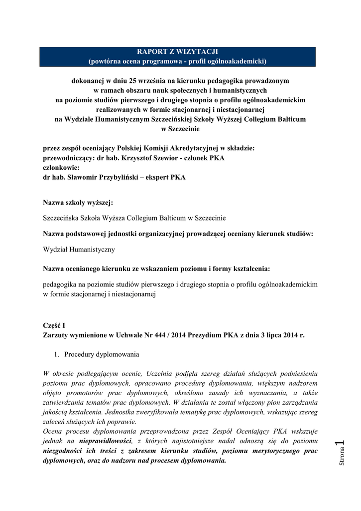 RAPORT Z WIZYTACJI (powtórna ocena programowa - profil ogólnoakademicki) dokonanej w dniu 25 września na kierunku pedagogika prowadzonym w ramach obszaru nauk społecznych i humanistycznych na poziomie studiów pierwszego i drugiego stopnia o profilu ogólnoakademickim realizowanych w formie stacjonarnej i niestacjonarnej na Wydziale Humanistycznym Szczecińskiej Szkoły Wyższej Collegium Balticum w Szczecinie przez zespół oceniający Polskiej Komisji Akredytacyjnej w składzie: przewodniczący: dr hab. Krzysztof Szewior - członek PKA członkowie: dr hab. Sławomir Przybyliński – ekspert PKA Nazwa szkoły wyższej: Szczecińska Szkoła Wyższa Collegium Balticum w Szczecinie Nazwa podstawowej jednostki organizacyjnej prowadzącej oceniany kierunek studiów: Wydział Humanistyczny Nazwa ocenianego kierunku ze wskazaniem poziomu i formy kształcenia: pedagogika na poziomie studiów pierwszego i drugiego stopnia o profilu ogólnoakademickim w formie stacjonarnej i niestacjonarnej Część I Zarzuty wymienione w Uchwale Nr 444 / 2014 Prezydium PKA z dnia 3 lipca 2014 r. Strona W okresie podlegającym ocenie, Uczelnia podjęła szereg działań służących podniesieniu poziomu prac dyplomowych, opracowano procedurę dyplomowania, większym nadzorem objęto promotorów prac dyplomowych, określono zasady ich wyznaczania, a także zatwierdzania tematów prac dyplomowych. W działania te został włączony pion zarządzania jakością kształcenia. Jednostka zweryfikowała tematykę prac dyplomowych, wskazując szereg zaleceń służących ich poprawie. Ocena procesu dyplomowania przeprowadzona przez Zespół Oceniający PKA wskazuje jednak na nieprawidłowości, z których najistotniejsze nadal odnoszą się do poziomu niezgodności ich treści z zakresem kierunku studiów, poziomu merytorycznego prac dyplomowych, oraz do nadzoru nad procesem dyplomowania. 1 1. Procedury dyplomowania Prace dyplomowe na tradycyjnych specjalnościach pedagogicznych są pisane poprawnie, natomiast problemy ujawniają się głównie na specjalności wychowanie obronne i bezpieczeństwo publiczne, pedagogika pracy socjalnej z resocjalizacją, doradztwo zawodowe i personalne. Zarzuty dotyczą zarówno braku treści pedagogicznych, jak i metodologii badań. Uchybienia te nie zostały dostrzeżone przez recenzentów i promotorów prac, a ich oceny zostały zawyżone. Szczegółowe dane zawiera Załącznik do Uchwały. Uczelnia spełnia kryterium oceny Cele i efekty kształcenia oraz system ich weryfikacji na poziomie - znacząco. 2. Funkcjonowania wewnętrznego systemu zapewnienia jakości kształcenia Uczelnia podjęła szereg inicjatyw projakościowych bazujących na Zarządzeniu Rektora, wprowadzono procedury pomiaru jakości kształcenia oraz oceny pracownika naukowego. Działaniem wykazuje się Komisja ds. Oceny Jakości Kształcenia. Powyższe należy uznać za korespondujące z zaleceniami PKA. Jednakże nie stwierdzono istotnej poprawy skuteczności funkcjonowania wewnętrznego systemu zapewnienia jakości kształcenia, w tym jego wpływu na poziom kształcenia, szczególnie w zakresie procedury dyplomowania, przeprowadzanych hospitacji i monitorowania losów absolwentów. Uczelnia prowadzi obowiązkową ocenę pracownika. W tym zakresie przyjęła stosowną procedurę, jednak stwierdzono, iż niektóre arkusze oceny pracowniczej są nierzetelnie wypełnione, tj. podpisanych przez osoby z Komisji bez żadnych wskazań, bez uwag, zaleceń, czy analiz. W ramach tej procedury ocenia się dwa zakresy: działalność naukowo-badawczą, działalność dydaktyczno-organizacyjną. Możliwe oceny to: wyróżniająca, pozytywna, negatywna. Nie określono ile punktów pracownik powinien uzyskać, by otrzymać określoną ocenę, co rodzi sytuację uznaniową, w której decyduje Komisja. Zespół Oceniający PKA ustalił, iż część pracowników zaliczonych do minimum kadrowego studiów drugiego stopnia w roku akademickim 2012/2013 uzyskało po 1 pkt. w ocenie parametrycznej, a ich ocena działalności naukowo-badawczej była pozytywna. Dowodzi to braku spójności oceny wewnątrzuczelnianej z oceną zewnętrzną. W kontekście rozwoju naukowego i zawodowego nauczyciela akademickiego skutkuje to brakiem spójności i transparentności, zamazuje także realną zdolność konkurencyjności jednostki i jej pracowników w środowisku naukowym krajowym i międzynarodowym. System nadzoru jakości kształcenia nie ma charakteru powszechnego, gdyż wyłącza z oceny niektórych nauczycieli akademickich z tytułem naukowym profesora. Cechuje go także mała skuteczność wobec wybranych grup pracowniczych (samodzielnych nauczycieli akademickich), odmawiających poddania się ocenie pracowniczej. Uczelnia spełnia kryterium oceny Wewnętrzny system zapewniania jakości kształcenia na poziomie - znacząco. Strona 2 3. Prowadzenie badań naukowych „W okresie podlegającym ocenie Uczelnia zintensyfikowała działalność naukową, co pozwala na odstąpienie od pierwotnie sformułowanych uwag i wydanie oceny spełnienia kryterium. Prowadzenie badań naukowych dla studiów drugiego stopnia na poziomie – w pełni.” Uczelnia pismem z dnia 30 kwietnia 2015 r. poinformowała PKA w raporcie z działań naprawczych o podjętych inicjatywach po otrzymanej ocenie warunkowej na kierunku pedagogika. Strona Ad. 1). Uczelnia podjęła szereg działań mających na celu naprawę niedoskonałości oraz wypracowanie i wdrożenie mechanizmów służących eliminacji nieprawidłowości: 1. Kontynuowano działania naprawcze zainicjowane po poprzedniej ocenie programowej. 2. Przekazano wnioski powizytacyjne promotorom. 3. Dokonano zmian organizacyjnych w zakresie monitorowania procedury dyplomowania. 4. Rektor Uczelni wydał zarządzenie w sprawie wygaszenia wskazanych specjalności nie realizujących efektów kształcenia na kierunku pedagogika: terapia pedagogiczna z rehabilitacja ruchową, edukacja obronna i bezpieczeństwo publiczne