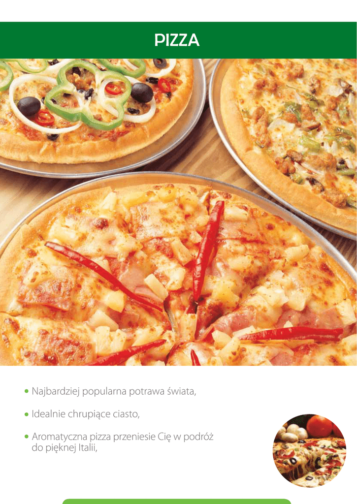 PIZZA Najbardziej popularna potrawa świata, Idealnie chrupiące ciasto, Aromatyczna pizza przeniesie Cię w podróż do pięknej Italii, PIZZA 1. SUPERPIZZA - 100%,MIESZANKA MĄCZNA 2. SUPERPIZZA ZIOŁOWA – 50% MIESZANKA MĄCZNA 3. MARGARITA - 25% MIESZANKA MĄCZNA Opis produktu: Gotowe mieszanki do sporządzenia w łatwy i szybki sposób wyśmienitych spodów pizzowych zarówno cienkich jak i puszystych. Doskonale utrzymują farsze zapobiegając ich wsiąkaniu w ciasto. Z mieszanek mącznych do produkcji pizzy można przygotować: spody do pizzy, paluchy, bułeczki, pizzerki i zawijańce. SUPER- PIZZA ZIOŁOWA – zawiera aromatyczny zestaw ziół. Receptura podstawowa SUPERPIZZA/ZIOŁOWA/MARGARITA: , Cena/kg Składnik PIZZA mieszanka Mąka pszenna Drożdże Woda RAZEM ,, Wartosc 5 / 5 / 5 kg 15 / 5 / - kg 0,8 / 0,4 / 0,25 kg 11-12 / 5,5-6 / 2,8 l 31,8 / 15, 9 / 8,05 kg Cena 1 kg 1 szt. Sposób przygotowania: Wszystkie składniki umieścić w dzieży i sporządzić ciasto. Pozostawić do odpoczynku. Następnie podzielić na kęsy. Formować spody, pizzerki lub bułki. Poddać fermentacji końcowej. Wypiekać. Parametry procesu Mieszanie wolne / szybkie Fermentacja wstępna / końcowa Wypiek 3/5 minut 15 – 40 minut 10 - 15 minut www.facebook.com/Ecotrade.gliwice Eco Trade Sp. z o.o. 44-100 Gliwice, ul. Okrężna 8 tel. (32) 231 20 87-88 faks (32) 231 20 88 wew. 102 [email protected], www.ecotrade.pl 26-27 °C 35-40 °C 240 °C