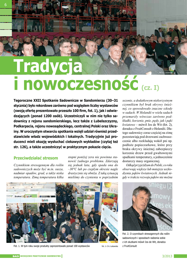 6 Tradycja i nowoczesność Tegoroczne XXII Spotkanie Sadownicze w Sandomierzu (30–31 stycznia) było rekordowe zarówno pod względem liczby wystawców (swoją ofertę prezentowało przeszło 100 firm, fot. 1), jak i odwie dzających (ponad 1200 osób). Uczestniczyli w nim nie tylko sa downicy z rejonu sandomierskiego, lecz także z Lubelszczyzny, Podkarpacia, rejonu nowosądeckiego, centralnej Polski oraz Ukra iny. W uroczystym otwarciu spotkania wzięli udział również przed stawiciele władz wojewódzkich i lokalnych. Tradycyjnie już pro ducenci mieli okazję wysłuchać ciekawych wykładów (czytaj też str. 126), a także uczestniczyć w praktycznym pokazie cięcia. Przeciwdziałać stresom Czynnikiem stresogennym dla roślin sadowniczych może być m.in. susza, nadmiar opadów, grad, a także niska temperatura. Zimą temperatura kilka stopni poniżej zera nie powinna stanowić żadnego problemu. Zdarzają się jednak lata, gdy spada ona do –30°C lub po ciepłym okresie nagle drastycznie się obniża. Z taką sytuacją mieliśmy do czynienia w poprzednim fot. A. Łukawska (cz. I) sezonie, a dodatkowym niekorzystnym czynnikiem był brak okrywy śnieżnej, co spowodowało znaczne szkody w sadach. W Holandii w wielu sadach przemarzły wówczas zarówno podkładki, korzenie, pnie, pędy, jak i pąki kwiatowe – mówił Jos de Wit (fot. 2), doradca z FruitConsult z Holandii. Dlatego sadownicy coraz częściej na zimę pozostawiają pod drzewami zachwaszczenie albo rozkładają wokół pni np. podłoże popieczarkowe, które przy braku okrywy śnieżnej zabezpieczy korzenie drzew przed gwałtownymi spadkami temperatury, a jednocześnie dostarczy masy organicznej. Odkąd przyjeżdżam do Polski, co roku obserwuję większe lub mniejsze uszkodzenia pąków kwiatowych. Jednak nigdy w trakcie rozwoju pąków nie można Fot. 2. O czynnikach stresogennych dla roślin sadowniczych i sposobach radzenia sobie z ich skutkami mówił Jos de Wit, doradca Fot. 1. W tym roku swoje produkty zaprezentowało ponad 100 wystawców miesięcznik praktycznego sadownictwa fot. 1–3 A. Łukawska z FruitConsult 3/2013 ocenić z całą pewnością, jak bardzo są uszkodzone lub jak się zregenerują. Na pewno uszkodzenia te będą miały wpływ na przewodzenie wody. Aby usprawnić jej transport do rozwijających się pąków, należy dwukrotnie zastosować saletrę potasową w dawce 10–15 kg/ha. Ponieważ wykazuje ona działanie fitotoksyczne na rozwijające się organy, należy stosować ją dolistnie najpóźniej w fazie nabrzmiewania pąków – informował J. de Wit. Na przemarzniętych zimą drzewach, w sezonie wegetacyjnym liście są zazwyczaj przebarwione, często wynika to z problemów z pobieraniem składników pokarmowych, m.in. żelaza. Dlatego w Holandii, jak informował J. de Wit, drzewa uszkodzone przez mróz są intensywnie dokarmiane dolistnie w celu poprawy asymilacji, co wpływa na wzmocnienie liści, kwiatów i owoców. Przed kwitnieniem, w trakcie kwitnienia oraz po kwitnieniu, co 7 dni zaleca się tam opryskiwać jabłonie fosforynem potasu w dawce 1,5 kg/ha. Po kwitnieniu natomiast, jeśli drzewa nie uległy uszkodzeniom mrozowym, stosuje się mocznik w dawce 1–2 kg/ha, a gdy przemarzły – w dawce 4–5 kg/ha łącznie z Wuxal Microplantem (dla uzupełnienia m.in. niedoborów żelaza). Podczas cięcia zimowego jabłoni, jak informował holenderski doradca, na ogół pozbywamy się najstarszych gałęzi, pozostawiając w obrębie korony tylko młode pędy. W przypadku drzew uszkodzonych przez mróz, należy jednak pozostawić więcej pędów, aby zapewnić większą powierzchnię liści, które będą odżywiać drzewo. Warto także pozostawić więcej jednorocznych pędów, szczególnie tych skierowanych ku górze, gdyż będą one stymulowały wzrost wegetatywny drzewa. Nie należy także wycinać całych starszych pędów, jak ma to miejsce w normalnym sezonie, ale skrócić je za pąkiem liściowym, aby wzmóc wzrost wegetatywny. Przyczyny słabego zapylenia kwiatów Główną przyczyną słabego zapylenia kwiatów drzew owocowych, według J. de Wita, są obfite zbiory owoców 3/2013 Jeśli spodziewamy się przymrozku, warto, jak informował J. de Wit, na 1–2 dni przed jego wystąpieniem zastosować dolistnie 5–6 kg mocznika/ha. W Holandii, gdy na 1–2 dni przed spodziewanym przymrozkiem temperatura w dzień jest wysoka (>18°C), sadownicy wzmacniają kwiaty na wszystkich gatunkach sadowniczych, stosując 0,5 l GA4+7*. U gruszy po takich zabiegach zaobserwowano również mniejsze porażenie przez Pseudomonas syringae (rak bakteryjny drzew owocowych). reklama 7 NAWOZY DOLISTNE Made in Germany Wirtuoz nawożenia upraw sadowniczych... Wuxal Calcium i Wuxal Aminocal. Optymalne nawożenie wapniem. Wuxal Ascofol i Wuxal AminoPlus. Biostymulacja i wzrost odporności. Wuxal Top P. Lepsze wybarwienie i jędrność owoców. Wuxal Mikro. Dokarmianie mikroelementowe. Wuxal Folibor. Lepsze zawiązywanie i plonowanie. Wuxal Boron. Najlepszy na stres w nowych przyrostach. Wirtuoz nawożenia dolistnego * w Polsce GA4+7 jest zarejestrowana tylko w celu poprawienia jakości skórki i redukcji ordzawiania się owoców jabłoni F&N Agro Polska Sp. z o. o. ul. Grójecka 1/3, 02-019 Warszawa tel. +48 22 620-32-52 www.fnagro.pl miesięcznik praktycznego sadownictwa agrotechnika 8 Uhonorowani odznaczeniem „Zasłużony dla Rolnictwa” fot. A. Łukawska Podobnie jak w poprzednich latach, pierwszego dnia Spotkania Sadowniczego w Sandomierzu uhonorowano grono osób zasłużonych dla branży sadowniczej (fot.). Odznaczenia „Zasłużony dla Rolnictwa” otrzymali: Anna Marczak (ZZO Warka), Grażyna Wójcik (Plantpress), Robert Binkiewicz (Agrosimex), Mirosław Błasiak (Compo Expert), Mirosław Korzeniowski (Bayer CropScience), Przemysław Kostrzewski (BASF), Piotr Lubaszka (Intermag), Tomasz Olszewski (ProCam), Marcin Zachwieja (sadownictwo.agro.pl). w poprzednim sezonie. Wysokie plonowanie