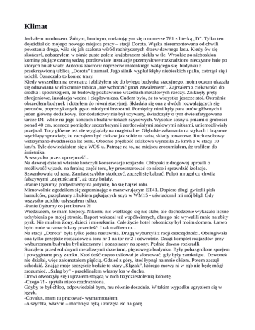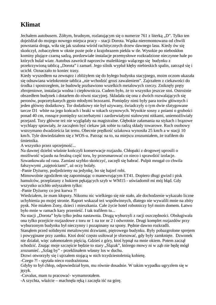 Klimat Jechałem autobusem. Żółtym, brudnym, rozlatującym się o numerze 761 z literką „D”. Tylko ten dojeżdżał do mojego nowego miejsca pracy – stacji Dorota. Wąska nieremontowana od chwili powstania droga, wiła się jak szalona wśród rachitycznych drzew dawnego lasu. Kiedy ów się skończył, zobaczyłem w oknie puste pole z krajobrazem piekła w tle. Wysokie po nieboskłon kominy plujące czarną sadzą, pordzewiałe instalacje przemysłowe rozkradzione nieczynne hale po których hulał wiatr. Autobus zawrócił naprzeciw maleńkiego walącego się budynku z przekrzywioną tablicą „Dorota” i zamarł. Jego silnik wypluł kłęby niebieskich spalin, zatrząsł się i ucichł. Oznaczało to koniec trasy. Kiedy wyszedłem na zewnątrz i zbliżyłem się do byłego budynku stacyjnego, moim oczom ukazała się odnawiana wielokrotnie tablica „nie wchodzić grozi zawaleniem”. Zajrzałem z ciekawości do środka i spostrzegłem, że budowlę pozbawiono wszelkich metalowych rzeczy. Zniknęły pręty zbrojeniowe, instalacja wodna i ciepłownicza. Cudem było, że to wszystko jeszcze stoi. Ostrożnie obszedłem budynek i dotarłem do równi stacyjnej. Składała się ona z dwóch rozwalających się peronów, poprzetykanych gęsto młodymi brzozami. Pomiędzy nimi były para torów głównych i jeden główny dodatkowy. Tor dodatkowy nie był używany, świadczyły o tym dwie sfatygowane tarcze D1 wbite na jego końcach i braki w tokach szynowych. Wysokie sosny z pniami o grubości ponad 40 cm, rosnące pomiędzy szczerbatymi i zardzewiałymi stalowymi nitkami, uniemożliwiały przejazd. Tory główne też nie wyglądały na magistralne. Głębokie załamania na stykach i brązowe wychlapy sprawiały, że zacząłem być ciekaw jak sobie tu radzą składy towarowe. Ruch osobowy wstrzymano dwadzieścia lat temu. Obecnie prędkość szlakowa wynosiła 25 km/h a w stacji 10 km/h. Tyle dowiedziałem się z WOS-u. Patrząc na to, na miejscu zrozumiałem, że trafiłem do śmietnika. A wszystko przez uprzejmość... Na dawnej dzielni właśnie kończyli konserwacje rozjazdu. Chłopaki z drogowej uprosili o możliwość wjazdu na feralną część toru, by przesmarować co nieco i sprawdzić izolacje. Szwankowała od rana. Zamiast szybko skończyć, zaczęli się babrać. Pulpit mrugał co chwila fałszywymi „zajętościami”, aż oczy bolały. -Panie Dyżurny, podjedziemy na jedynkę, bo się bajzel robi. Mimowolnie zgodziłem się zapominając o manewrującym ET41. Dopiero długi gwizd i pisk hamulców, przeplatany z hukiem pękających szyb w WM15 - uświadomił mi mój błąd. Gdy wszystko ucichło usłyszałem tylko: -Panie Dyżurny co jest kurwa ?! Wiedziałem, że mam kłopoty. Nikomu nic wielkiego się nie stało, ale dochodzenie wykazało liczne uchybienia po mojej stronie. Raport wskazał też współwinnych, dlatego nie wywalili mnie na zbity pysk. Nie miałem Żony, dzieci i mieszkania. Całe życie hotel robotniczy był moim domem. Łatwo było mnie w ramach kary przenieść. I tak trafiłem tu... Na stacji „Dorota” była tylko jedna nastawnia. Drugą wyburzyli z racji oszczędności. Obsługiwała ona tylko przejście rozjazdowe z toru nr 1 na tor nr 2 i odwrotnie. Drugi komplet rozjazdów przy wyburzonym budynku był nieczynny i pozapinany na spony. Pędnie dawno rozkradli. Stanąłem przed solidnymi metalowymi drzwiami, piętrowego budynku. Były pobazgrolone sprejem i powyginane przy zamku. Ktoś dość często usiłował je sforsować, gdy były zamknięte. Dzwonek nie działał, więc załomotałem pięścią. Gdzieś z góry, ktoś łypnął na mnie okiem. Potem zaczął schodzić. Znając moje szczęście będzie to stary „Ślązak”, którego mowy ni w ząb nie będę mógł zrozumieć. „Szlag by” - przeklinałem własny los w duchu. Drzwi otworzyły się i ujrzałem stojącą w nich trzydziestoletnią kobietę. -Czego ?! - spytała nieco rozdrażniona. Gdyby to był chłop, odpowiedział bym, mu równie dosadnie. W takim wypadku ugryzłem się w język. -Covalus, mam tu pracować- wymamrotałem. -A szychta, właźcie – machnęła ręką i zaczęła iść na górę. Wlazłem i zatrzasnąłem sfatygowane drzwi. Zamek ledwie się dawał przekręcić. Wąskie schody trzeszcząc pozwoliły wejść na górę. Nastawnia była wyposażona w urządzenia mechaniczne z sygnalizacją świetlną. Czyli machanie wajchami. Kuźwa a miałem suwaczki ! Przyjrzałem się mojej nowej „nauczycielce”. Mieliśmy w planach dwie wspólne służby w ramach wdrożenia się w temat. Nie była brzydka. Blond włosy opadały łagodnie po bokach. Twarz zdradzała lekkie przejścia. -Barbara – przedstawiła się. -Covalus – jeszcze raz powtórzyłem swoje dane. -Przeczytaj regulamin, a potem do roboty. Co ja ci będę gadała... Słusznie prawiła. Nie zniósłbym wymądrzania się. Powiesiłem kurtkę na gwoździu wbitym w ścianę i szybko przejrzałem regulamin. Po degradacji nie był zbyt rozległy. Manewry zabronione, krzyżowanie niemożliwe, przejazdy z toru na tor sporadyczne. -335547 do Doroty ! - zaskrzeczało radio. -Dorota – blondi chwyciła za manipulator. -335547 do Doroty ! - maszynista wyraźnie nic nie słyszał. Kobitka spojrzała na moją zdziwioną minę i zarechotała po męsku. -Tu tak zawsze, jak coś działa to cud. Trza dupnąć – mówiąc to trzasnęła manipulatorem o ścianę, a następnie nieco głośniej powtórzyła – DOROTA ! -A już słychać, Pani Dyżurna my są już pod wjazdem, można świecić. Kobieta uniosła kciuk w górę i znów się głośno zaśmiała. -A widzisz, jak dupniesz działa – potem wskazała mi na dźwignie sygnałowe – podaj mu przelot. Odnalazłem właściwą i chwyciwszy mocno uchwyt przestawiłem w dół. Kątem oka sprawdziłem zaryglowanie zwrotnic. Było prawidłowe. Wjazd miał podany. Pozostała tylko kwestia wyjazdu. Stacja nie miała żadnej działającej blokady. Zbyt często kradzio
