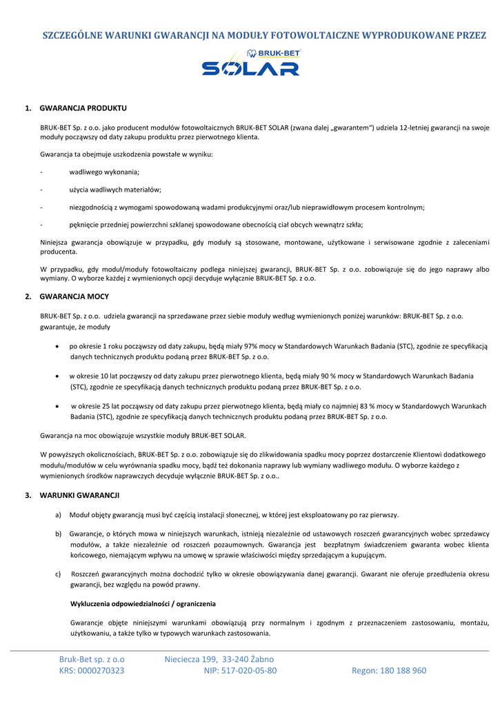 SZCZEGÓLNE WARUNKI GWARANCJI NA MODUŁY FOTOWOLTAICZNE WYPRODUKOWANE PRZEZ 1. GWARANCJA PRODUKTU BRUK-BET Sp. z o.o. jako producent modułów fotowoltaicznych BRUK-BET SOLAR (zwana dalej „gwarantem“) udziela 12-letniej gwarancji na swoje moduły począwszy od daty zakupu produktu przez pierwotnego klienta. Gwarancja ta obejmuje uszkodzenia powstałe w wyniku: - wadliwego wykonania; - użycia wadliwych materiałów; - niezgodnością z wymogami spowodowaną wadami produkcyjnymi oraz/lub nieprawidłowym procesem kontrolnym; - pęknięcie przedniej powierzchni szklanej spowodowane obecnością ciał obcych wewnątrz szkła; Niniejsza gwarancja obowiązuje w przypadku, gdy moduły są stosowane, montowane, użytkowane i serwisowane zgodnie z zaleceniami producenta. W przypadku, gdy moduł/moduły fotowoltaiczny podlega niniejszej gwarancji, BRUK-BET Sp. z o.o. zobowiązuje się do jego naprawy albo wymiany. O wyborze każdej z wymienionych opcji decyduje wyłącznie BRUK-BET Sp. z o.o. 2. GWARANCJA MOCY BRUK-BET Sp. z o.o. udziela gwarancji na sprzedawane przez siebie moduły według wymienionych poniżej warunków: BRUK-BET Sp. z o.o. gwarantuje, że moduły po okresie 1 roku począwszy od daty zakupu, będą miały 97% mocy w Standardowych Warunkach Badania (STC), zgodnie ze specyfikacją danych technicznych produktu podaną przez BRUK-BET Sp. z o.o. w okresie 10 lat począwszy od daty zakupu przez pierwotnego klienta, będą miały 90 % mocy w Standardowych Warunkach Badania (STC), zgodnie ze specyfikacją danych technicznych produktu podaną przez BRUK-BET Sp. z o.o. w okresie 25 lat począwszy od daty zakupu przez pierwotnego klienta, będą miały co najmniej 83 % mocy w Standardowych Warunkach Badania (STC), zgodnie ze specyfikacją danych technicznych produktu podaną przez BRUK-BET Sp. z o.o. Gwarancja na moc obowiązuje wszystkie moduły BRUK-BET SOLAR. W powyższych okolicznościach, BRUK-BET Sp. z o.o. zobowiązuje się do zlikwidowania spadku mocy poprzez dostarczenie Klientowi dodatkowego modułu/modułów w celu wyrównania spadku mocy, bądź też dokonania naprawy lub wymiany wadliwego modułu. O wyborze każdego z wymienionych środków naprawczych decyduje wyłącznie BRUK-BET Sp. z o.o.. 3. WARUNKI GWARANCJI a) Moduł objęty gwarancją musi być częścią instalacji słonecznej, w której jest eksploatowany po raz pierwszy. b) Gwarancje, o których mowa w niniejszych warunkach, istnieją niezależnie od ustawowych roszczeń gwarancyjnych wobec sprzedawcy modułów, a także niezależnie od roszczeń pozaumownych. Gwarancja jest bezpłatnym świadczeniem gwaranta wobec klienta końcowego, niemającym wpływu na umowę w sprawie właściwości między sprzedającym a kupującym. c) Roszczeń gwarancyjnych można dochodzić tylko w okresie obowiązywania danej gwarancji. Gwarant nie oferuje przedłużenia okresu gwarancji, bez względu na powód prawny. Wykluczenia odpowiedzialności / ograniczenia Gwarancje objęte niniejszymi warunkami obowiązują przy normalnym i zgodnym z przeznaczeniem zastosowaniu, montażu, użytkowaniu, a także tylko w typowych warunkach zastosowania. Bruk-Bet sp. z o.o KRS: 0000270323 Nieciecza 199, 33-240 Żabno NIP: 517-020-05-80 Regon: 180 188 960 SZCZEGÓLNE WARUNKI GWARANCJI NA MODUŁY FOTOWOLTAICZNE WYPRODUKOWANE PRZEZ Warunkiem skorzystania z uprawnień gwarancyjnych jest, zapewnienie takich warunków eksploatacji, aby wydajność modułów nie została zredukowana przez środki lub zdarzenia, które znajdują się poza zakresem kontroli gwaranta, w szczególności: ▶ zmiana/uszkodzenia w wyniku działania siły wyższej (grad, pożar, awaria zasilania, uderzenie pioruna, powódź, śnieżyce, lawiny, mróz, trzęsienia ziemi, trąby powietrzne, wybuchy wulkanów, osunięcia ziemi, plagi owadów oraz inne działania zwierząt, itd.), ▶ nieprawidłowy montaż, uruchomienie, eksploatacja lub nieprawidłowy demontaż i/ lub ponowny montaż modułów (np. z powodu nieprzestrzegania instrukcji montażu obowiązującej w czasie instalacji), ▶ użytkowanie na jednostkach ruchomych, takich jak pojazdy i statki oraz inne zastosowanie modułów niezależne od sieci energetycznych, ▶ szkodliwy wpływ warunków zewnętrznych (np. wstrząsów zewnętrznych, uderzeniem spadających ciał obcych lub naciskiem zewnętrznym, środki chemiczne i inne zabrudzenia), ▶ połączenie z modułami innych producentów o innej konstrukcji lub parametrach użytkowych, ▶ uszkodzenia systemu, w którym zamontowany jest moduł, ▶ niewystarczająca wentylacja, lub przekroczenie temperatur maksymalnych podanych w instrukcji obsługi. Przyjęcie przez gwaranta do rozpatrzenia roszczeń z tytułu udzielonych gwarancji jest ponadto uwarunkowane tym, że moduły są wykorzystywane prawidłowo, tj. zgodnie ze swoim przeznaczeniem i nie ma na nich oznak zużycia ani uszkodzeń zewnętrznych większych niż wynikające z normalnego użycia, a także nie doszło do uszkodzeń etykiety produktu. Należy również bezwzględnie przestrzegać instrukcji montażu i obsługi. Przestrzeganie wymienionych tam wskazówek bezpieczeństwa i ostrzeżeń, a także podanej na arkuszu danych dozwolonej instrukcji montażu i obsługi, jest wymagalnym warunkiem wysunięcia roszczeń gwarancyjnych. Roszczeń gwarancyjnych nie można przenosić na osoby trzecie. 4. ŚWIADCZENIE GWARANCYJNE O wszystkich zdarzeniach podlegających gwarancji należy pisemnie informować firmę BRUK-BET sp. z o.o Nieciecza 199, 33-240 Żabno. Warunkiem zgłoszenia roszczeń gwarancyjnych jest przedłożenie przez klienta końcowego dowodu zakupu dokonanego od gwaranta. Jeśli w momencie zdarzenia podlegającego gwarancji dany typ modułu nie będzie już produkowany, gwarant zastrzega sobie prawo dostarczenia modułów fotowoltaicznych innego typu (inny rozmiar, kształt, kolor i/lub moc). Dla dostarczonych w ramach rozpatrzenia roszczeń gwarancyjnych lub naprawionych przez gwaranta modułów, obo