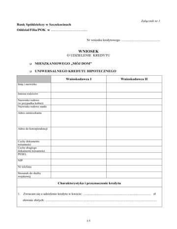 Załącznik nr 1 Bank Spółdzielczy w Szczekocinach Oddział/Filia/POK w ......................................... Nr wniosku kredytowego ............................................... WNIOSEK O UDZIELENIE KREDYTU MIESZKANIOWEGO „MÓJ DOM” UNIWERSALNEGO KREDYTU HIPOTECZNEGO Wnioskodawca I Wnioskodawca II Imię i nazwisko Imiona rodziców Nazwisko rodowe (w przypadku kobiet) Nazwisko rodowe matki Adres zamieszkania Adres do korespondencji Cechy dokumentu toŜsamości Cechy drugiego dokumentu toŜsamości PESEL NIP Nr telefonu Stosunek do słuŜby wojskowej Charakterystyka i przeznaczenie kredytu 1. Zwracam się o udzielenie kredytu w kwocie: .................................................................................. zł słownie złotych: ........................................................................................................................................ 1/5 2. Okres kredytowania: .......... lat w tym okres karencji w spłacie kapitału kredytu: ........... miesięcy 3. Spłata kredytu: □ raty malejące (równe raty kapitałowe i malejące raty odsetkowe) □ raty równe (równe raty kapitałowo-odsetkowe – annuitetowe) 4. Przedmiot finansowania: realizacja inwestycji prowadzonej na nieruchomości stanowiącej własność Wnioskodawcy: .......................................................................................................................................................... realizacja inwestycji prowadzonej przez spółdzielnię mieszkaniową lub developera: ........................................................................................................................................................... zakup lub zamiana lokalu/ domu jednorodzinnego, spłata kredytu mieszkaniowego: .......................................................................................................................................................... inne cele mieszkaniowe: …………………………………………………………………………………………………….. inny cel: .......................................................................................................................................................... 5. Koszt inwestycji: .............................................................zł słownie złotych: ..................................................................................................................................... 6. Przewidywane terminy wykorzystania kredytu i wysokość poszczególnych transz: termin 1) .................................................... 2) .................................................... 3) .................................................... 4) .................................................... 5) .................................................... kwota kwota słownie ..................................... ................................................................................................................. ..................................... ................................................................................................................. ..................................... ................................................................................................................. ..................................... ................................................................................................................. ..................................... ................................................................................................................. 2/5 7. Deklarowany udział własny w finansowaniu inwestycji: .................................................................... zł słownie złotych: ....................................................................................................................................... w formie: .................................................................................................................................................. ................................................................................................................................................................... ................................................................................................................................................................... 8. Sposób zapłaty prowizji za udzielenie kredytu: □ wpłata gotówką przez kredytobiorcę przed uruchomieniem kredytu □ pobranie przez Bank ze środków na rachunku oszczędnościowo-rozliczeniowym w dniu wypłaty □ pobranie przez Bank ze środków kredytowych Prawne zabezpieczenia spłaty kredytu Jako prawne zabezpieczenie kredytu proponuję: 1. hipotekę na: nieruchomości stanowiącej własność/ uŜytkowanie wieczyste ......................................................., spółdzielczym własnościowym prawie do lokalu, prawie do domu jednorodzinnego w spółdzielni mieszkaniowej dla której/-ego prowadzona jest przez ............................................................................................. (określenie sądu) księga wieczysta KW nr .................................................., 2. weksel własny in blanco; 3. cesję praw na rzecz Banku z polisy ubezpieczeniowej nieruchomości od ognia i zdarzeń losowych; 4. cesja praw na rzecz Banku z polisy ubezpieczeniowej na Ŝycie: tak nie 5. do czasu ustanowienia hipoteki ubezpieczenie pomostowe: ........................................................................................................................................................................ 6. inne..................................................................................................................................................... ........................................................................................................................................................................ ...............