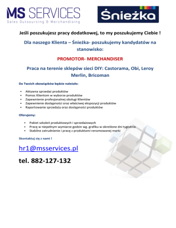 Jeśli poszukujesz pracy dodatkowej, to my poszukujemy Ciebie ! Dla naszego Klienta – Śnieżka- poszukujemy kandydatów na stanowisko: PROMOTOR- MERCHANDISER Praca na terenie sklepów sieci DIY: Castorama, Obi, Leroy Merlin, Bricoman Do Twoich obowiązków będzie należało: Aktywna sprzedaż produktów Pomoc Klientom w wyborze produktów Zapewnienie profesjonalnej obsługi Klientów Zapewnienie dostępności oraz właściwej ekspozycji produktów Raportowanie sprzedaży oraz dostępności produktów Oferujemy: Pakiet szkoleń produktowych i sprzedażowych Pracę w niepełnym wymiarze godzin wg. grafiku w określone dni tygodnia Stabilne zatrudnienie i pracę z produktami renomowanej marki Skontaktuj się z nami ! [email protected] tel. 882-127-132