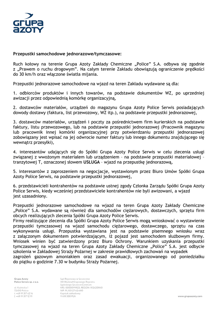Przepustki samochodowe jednorazowe/tymczasowe: Ruch kołowy na terenie Grupa Azoty Zakłady Chemiczne „Police” S.A. odbywa się zgodnie z „Prawem o ruchu drogowym”. Na całym terenie Zakładu obowiązują ograniczenie prędkości do 30 km/h oraz włączone światła mijania. Przepustki jednorazowe samochodowe na wjazd na teren Zakładu wydawane są dla: 1. odbiorców produktów i innych towarów, na podstawie dokumentów WZ, po uprzedniej awizacji przez odpowiednią komórkę organizacyjną, 2. dostawców materiałów, urządzeń do magazynu Grupa Azoty Police Serwis posiadających dowody dostawy (faktura, list przewozowy, WZ itp.), na podstawie przepustki jednorazowej, 3. dostawców materiałów, urządzeń i poczty za pośrednictwem firm kurierskich na podstawie faktury, listu przewozowego, lub na podstawie przepustki jednorazowej (Pracownik magazynu lub pracownik innej komórki organizacyjnej przy potwierdzaniu przepustki jednorazowej zobowiązany jest wpisać na jej odwrocie numer faktury lub innego dokumentu znajdującego się wewnątrz przesyłki), 4. interesantów udających się do Spółki Grupa Azoty Police Serwis w celu zlecenia usługi związanej z wwożonym materiałem lub urządzeniem – na podstawie przepustki materiałowej – tranzytowej T, oznaczonej słowem USŁUGA – wjazd na przepustkę jednorazową, 5. interesantów z zaproszeniem na negocjacje, wystawionym przez Biuro Umów Spółki Grupa Azoty Police Serwis, na podstawie przepustki jednorazowej, 6. przedstawicieli kontrahentów na podstawie ustnej zgody Członka Zarządu Spółki Grupa Azoty Police Serwis, kiedy wcześniej przedstawiciele kontrahentów nie byli awizowani, a wjazd jest uzasadniony. Przepustki jednorazowe samochodowe na wjazd na teren Grupa Azoty Zakłady Chemiczne „Police” S.A. wydawane są również dla samochodów ciężarowych, dostawczych, sprzętu firm obcych realizujących zlecenia Spółki Grupa Azoty Police Serwis. Firmy realizujące zlecenia dla Spółki Grupa Azoty Police Serwis mogą wnioskować o wystawienie przepustki tymczasowej na wjazd samochodu ciężarowego, dostawczego, sprzętu na czas wykonywania usługi. Przepustka wystawiana jest na podstawie pisemnego wniosku wraz z załączonym dokumentem potwierdzającym, iż pojazd jest samochodem służbowym firmy. Wniosek winien być zatwierdzony przez Biuro Ochrony. Warunkiem uzyskania przepustki tymczasowej na wjazd na teren Grupa Azoty Zakłady Chemiczne „Police” S.A. jest odbycie szkolenia w Zakładowej Straży Pożarnej w zakresie prawidłowych zachowań na wypadek zagrożeń gazowym amoniakiem oraz zasad ewakuacji, organizowanego od poniedziałku do piątku o godzinie 7.30 w budynku Straży Pożarnej.