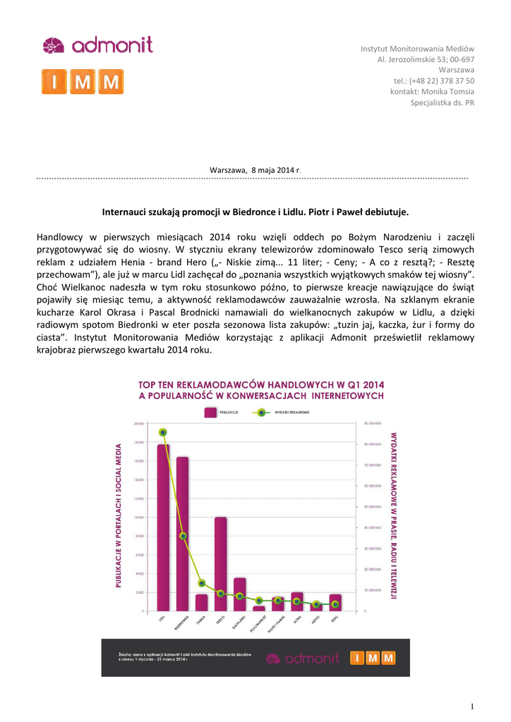 usługę badania wizerunku w prasie, radiu, telewizji oraz w internecie i w mediach społecznościowych. Analizy i raporty IMM