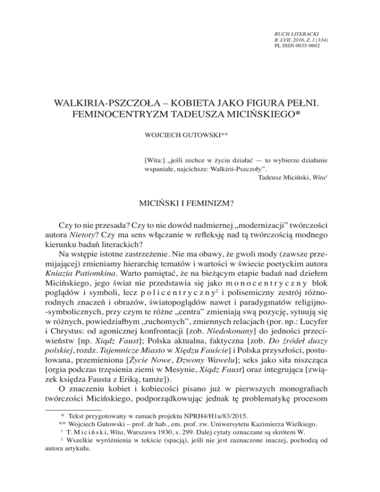 RUCH LITERACKI R. LVII, 2016, Z. 1 (334) PL ISSN 0035-9602 WALKIRIA-PSZCZOŁA – KOBIETA JAKO FIGURA PEŁNI. FEMINOCENTRYZM TADEUSZA MICIŃSKIEGO* WOJCIECH GUTOWSKI** [Wita:] „jeśli zechce w życiu działać — to wybierze działanie wspaniałe, najcichsze: Walkirii-Pszczoły”. Tadeusz Miciński, Wita1 MICIŃSKI I FEMINIZM? Czy to nie przesada? Czy to nie dowód nadmiernej „modernizacji” twórczości autora Nietoty? Czy ma sens włączanie w refleksję nad tą twórczością modnego kierunku badań literackich? Na wstępie istotne zastrzeżenie. Nie ma obawy, że gwoli mody (zawsze przemijającej) zmieniamy hierarchię tematów i wartości w świecie poetyckim autora Kniazia Patiomkina. Warto pamiętać, że na bieżącym etapie badań nad dziełem Micińskiego, jego świat nie przedstawia się jako m o n o c e n t r y c z n y blok poglądów i symboli, lecz p o l i c e n t r y c z n y2 i polisemiczny zestrój różnorodnych znaczeń i obrazów, światopoglądów nawet i paradygmatów religijno-symbolicznych, przy czym te różne „centra” zmieniają swą pozycję, sytuują się w różnych, powiedziałbym „ruchomych”, zmiennych relacjach (por. np.: Lucyfer i Chrystus: od agonicznej konfrontacji [zob. Niedokonany] do jedności przeciwieństw [np. Xiądz Faust]; Polska aktualna, faktyczna [zob. Do źródeł duszy polskiej, rozdz. Tajemnicze Miasto w Xiędzu Fauście] i Polska przyszłości, postulowana, przemieniona [Życie Nowe, Dzwony Wawelu]; seks jako siła niszcząca [orgia podczas trzęsienia ziemi w Mesynie, Xiądz Faust] oraz integrująca [związek księdza Fausta z Eriką, tamże]). O znaczeniu kobiet i kobiecości pisano już w pierwszych monografiach twórczości Micińskiego, podporządkowując jednak tę problematykę procesom * Tekst przygotowany w ramach projektu NPRH4/H1a/83/2015. ** Wojciech Gutowski – prof. dr hab., em. prof. zw. Uniwersytetu Kazimierza Wielkiego. 1 T. M i c i ń s k i, Wita, Warszawa 1930, s. 299. Dalej cytaty oznaczane są skrótem W. 2 Wszelkie wyróżnienia w tekście (spacją), jeśli nie jest zaznaczone inaczej, pochodzą od autora artykułu. 4 Wojciech Gutowski indywiduacji i inicjacji męskich bohaterów; kobiety tam występowały jako personifikacje archetypów Anima i Magna Mater3. Dopiero Tadeusz Linkner, analizując różnice między dwiema wersjami młodzieńczego opowiadania Nauczycielka (I wersja – publikowana w „Czasie” 1894 r.; II – publikowana w Dębach czarnobylskich, 1911), dobitnie podkreślił: „Bo jeżeli emancypacyjne kwestie pojawiły się już w pierwszej wersji Nauczycielki, tak potem z o s t a ł y o n e w z b o g a c o n e o m y ś l i f e m i n i s t y c z n e” [wyróżnienie T. Linknera]4. W niniejszym szkicu – nie przekreślając dotychczasowych własnych ustaleń – eksponuję feminocentryzm jako jeden z istotnych (ale nie najistotniejszy) „-centryzmów” świata przedstawionego autora Nietoty. Przypominam, że Młoda Polska również w tematyce kobiecej i erotycznej eksponuje ujęcia skrajne, antynomiczne. Stąd taka popularność dwóch wzorców granicznych: „kobiety fatalnej, niszczącej” oraz „kobiety idealnej, inspiratorki”5. Ale ten dualizm: mizoginizmu i uwielbienia należy uzupełnić trzecim punktem widzenia, który wspierając dążenia emancypacyjne, dostrzega w kobiecie przede wszystkim – człowieka, dodajmy człowieka nowego6, wieloperspektywicznego, człowieka-twórcę. 3 Zob. J. P r o k o p, Żywioł wyzwolony. Studium o poezji Tadeusza Micińskiego, Kraków 1978; W. G u t o w s k i, W poszukiwaniu życia nowego. Mit a światopogląd w twórczości Tadeusza Micińskiego, Toruń 1980. Także w pracy poświęconej wyłącznie postaciom kobiecym autorka zauważa: „Akcentowana jest jej [kobiety] rola jako przewodniczki, bądź istoty w taki czy inny sposób prowadzącej do zguby poszukującego bohatera płci męskiej […] stają się [kobiety – WG] pomocne w procesie inicjacyjnym bohatera, mają znaczący wpływ na jego kształtującą się świadomość samego siebie, jak i świadomość narodową.” A. K l i m, Od nimfomanki do kobiety metafizycznie fatalnej. Obraz płci pięknej w twórczości Tadeusza Micińskiego w zbiorze: „Gorsza” kobieta. Dyskursy inności, samotności, szaleństwa, pod red. D. Adamowicz, Y. Anisimovets, O. Taranek, Wrocław 2008, s. 91. G. Igliński podkreśla interioryzację postaci kobiecych w liryce, które określają wieloznaczną egzystencję bohaterów: „Wyobrażeniem tajemnicy miłosci i śmierci jest u Micińskiego postać kobieca – bogini, królewna, kochanka – nosząca najróżniejsze imiona. Bohater […] czuje się jej »dzieckiem, smokiem, i wielkim krwawym piorunem!«”. Te n ż e, Serca upiorny kwiat. Pierwiastek żeński w liryce Tadeusza Micińskiego [w:] Magia serca i słowa w modernistycznych snach i wizjach, Warszawa 2005, s. 57. 4 T. L i n k n e r, Dziennik w pamiętniku [w:] Te n ż e, Zanim skończyło się maskaradą. Ze studiów nad twórczością Tadeusza Micińskiego, Gdańsk 2003, s. 34. Na temat Nauczycielki zob. też interesujące studium J. Zacharskiej, Nauczycielka w literaturze przełomu XIX i XX wieku [w:] Ta ż, O kobiecie w literaturze przełomu XIX i XX wieku, Białystok 2000; oryginalną interpretację P. Próchniaka „Sprawa czysta jak zła”. U podstaw światopoglądu: „Nauczycielka” [w:] Te n ż e, Pęknięty płomień. O pisarstwie Tadeusza Micińskiego, Lublin 2006 oraz mój szkic Inna siłaczka? Wokół „Nauczycielki” Tadeusza Micińskiego [w:] Te n ż e, Między inicjacją a nicością. Studia i szkice o literaturze modernizmu, Bydgoszcz 2013. 5 Zob. W. G u t o w s k i, Nagie dusze i maski. O młodopolskich mitach miłości, Kraków 1997. 6 Który sam dla siebie jest pytaniem, niezgłębioną tajemnicą. Por. M. S t a l a, Człowiek z właściwościami. (W kręgu antropologicznej problematyki Młodej Polski) w zbiorze: Stulecie Młodej Polski, studia pod red. M. Podr