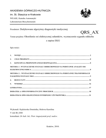 AKADEMIA GÓRNICZO-HUTNICZA im. St. Staszica w Krakowie WEAIiE, Katedra Automatyki Laboratorium Biocybernetyki Przedmiot: Dedykowane algorytmy diagnostyki medycznej. QRS_AX Temat projektu: Określenie osi elektrycznej załamków, wyznaczenie sygnału oddechu z zapisu EKG Spis treści: 1. WSTĘP .......................................................................................................................................................... 2 2. CELE PROJEKTU ...................................................................................................................................... 8 3. KONCEPCJA PROPONOWANEGO ROZWIĄZANIA ......................................................................... 8 METODA 1 : WYZNACZENIE SYGNAŁU ODDECHOWEGO NA PODSTAWIE ANALIZY OSI ELEKTRYCZNEJ SERCA. ................................................................................................................................. 8 METODA 2 : WYZNACZENIE SYGNAŁU ODDECHOWEGO NA PODSTAWIE TRANSFORMACJI FALKOWEJ SYGNAŁU EKG ............................................................................................................................ 9 4. REZULTATY ............................................................................................................................................. 10 5. WNIOSKI ................................................................................................................................................... 16 LITERATURA..................................................................................................................................................... 17 DODATEK A. OPIS INFORMATYCZNY PROCEDUR ............................................................................... 18 DODATEK B. OPIS GRAFICZNEGO INTERFEJSU UŻYTKOWNIKA ................................................... 21 Wykonali: Kędzierska Dominika, Holewa Karolina V rok IB_EIM konsultant: Dr hab. Inż. Piotr Augustyniak prof. nadzw. Kraków, 2010. 1. Wstęp Elektrokardiografia jest nieinwazyjną metodą diagnostyczną, której celem jest rozpoznanie przebiegu zjawisk elektrycznych w sercu. Ze względu na stosunkowo niski koszt oraz łatwość wykonania badania w porównaniu do innych metod diagnostycznych, badanie to jest często zlecane przez lekarzy. Badanie polega na rejestracji z powierzchni klatki piersiowej elektrycznej czynności mięśnia sercowego. Urządzenie służące do odebrania potencjałów ze skóry za pomocą specjalnych elektrod nazywane jest elektrokardiografem. Zarejestrowane potencjały są wzmacniane i zapisywane przez aparat na papierze lub cyfrowo w postaci tzw. krzywej EKG. Otrzymany w ten sposób elektrokardiogram pozwala na dokonanie pomiarów różnych charakterystycznych elementów krzywej EKG, zwanych odstępami, odcinkami i załamkami, których wartości są odzwierciedleniem miejsca i czasu trwania zjawisk elektrycznych w mięśniu serca. Rysunek 1 przedstawia przebieg krzywej EKG na którym wyróżniamy załamki, odcinki oraz odstępy, których zmiana kształtu lub odległości między sąsiadującymi załamkami jest najczęściej związana z jakąś patologią. Rys. 1 Przebieg krzywej EKG. 2|Strona Opis podstawowych składowych elektrokardiografu Załamek TP Jest spowodowany repolaryzacją przedsionków, jednak zazwyczaj go nie widać, ponieważ występuje w tym samym czasie co załamek QRS. Załamek P Załamek ten jest wyrazem depolaryzacji przedsionków, którego czas trwania u zdrowych osób powinien zawierać się w przedziale od 0,08s do 0,11 s. Odcinek PQ Jest fragmentem krzywej EKG występującym od końca załamka P aż do początku zespołu QRS. W warunkach fizjologicznych znajduje się w linii izoelektrycznej, zaś jego czas trwania powinien wynosić od 0,04s do 0,10 s. Odstęp PQ Jest to fragment zapisu EKG obejmujący czas od początku załamka P do początku zespołu QRS, czyli obejmuje załamek P oraz odcinek PQ. Prawidłowy czas trwania odstępu PQ to 0,12-0,2s. Zespół QRS Jest elektrokardiograficznym odzwierciedleniem depolaryzacji komór, który składa się z dwóch lub więcej załamków określonych jako Q, R i S. Prawidłowy czas trwania to od 0,06 s do 0,11 s. Odcinek ST Fragment ten obejmuje czas trwania od końca zespołu QRS do początku załamka T. W warunkach prawidłowych powinien być on izoelektryczny, czyli znajdować się na tej samej wysokości co odcinek TP. Załamek T Odpowiada repolaryzacji komór. Prawidłowy czas trwania załamka T powinien wynosić od 0,12 s do 0,16 s. Odstęp QT Jest to fragment zapisu EKG składający się z zespołu QRS, odcinka ST i załamka T. Odstęp QT reprezentuje wszystkie zdarzenia podczas skurczu komór, zaś jego czas trwania jest zmienny i zależy od częstości rytmu serca. 3|Strona Fala U To mały, płaski załamek, który jest czasami widoczny po załamku T, a przed załamkiem P. Nieznana jest dokładna faza cyklu pracy serca reprezentowana przez załamek U. Oś elektryczna serca jest sumą wszystkich wektorów wytwarzanych przez potencjały czynnościowe pojedynczych miocytów komór. Jest generowana przez każdy z załamków, a także przez odstępy między nimi. Określa ona położenie serca wewnątrz jamy ciała, a także stosunek masy mięśniowej komory lewej i prawej. Odchylenie osi elektrycznej serca w prawo lub w lewo może mieć przyczynę w : przeroście prawej komory serca, dekstrokardii czy ekotopowego pobudzenia i rytmu komorowego, czyli wstecznej propagacji fali depolaryzacyjnej z dolnej części przedsionków lub węzła przedsionkowokomorowego bądź z komór. Na podstawie analizy sygnału EKG możemy wyznaczyć sygnał oddechu, który określa m.in. głębokość wdechu i wydechu oraz istnienie groźnego dla życia bezdechu podczas snu. Współczesne systemy monitoringu EKG pozwalają na rejestrację sygnału EKG z jednoczesnym monitoringiem oddechu pacjenta. Funkcja ta standardowo zaimplementowana jest w szpitalnych kardiomonitorach o