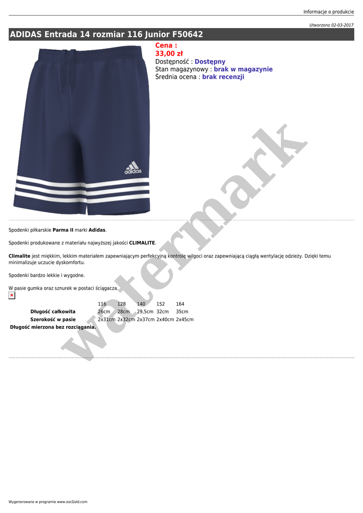 Informacje o produkcie Utworzono 02-03-2017 ADIDAS Entrada 14 rozmiar 116 Junior F50642 Cena : 33,00 zł er m ar k Dostępność : Dostępny Stan magazynowy : brak w magazynie Średnia ocena : brak recenzji Spodenki piłkarskie Parma II marki Adidas. Spodenki produkowane z materiału najwyższej jakości CLIMALITE. Climalite jest miękkim, lekkim materiałem zapewniającym perfekcyjną kontrolę wilgoci oraz zapewniającą ciągłą wentylację odzieży. Dzięki temu minimalizuje uczucie dyskomfortu. Spodenki bardzo lekkie i wygodne. at W pasie gumka oraz sznurek w postaci ściągacza. 116 128 140 Długość całkowita 26cm 28cm 29,5cm 32cm Szerokość w pasie 2x31cm 2x32cm 2x37cm 2x40cm 2x45cm w Długość mierzona bez rozciągania. Wygenerowano w programie www.oscGold.com 152 164 35cm
