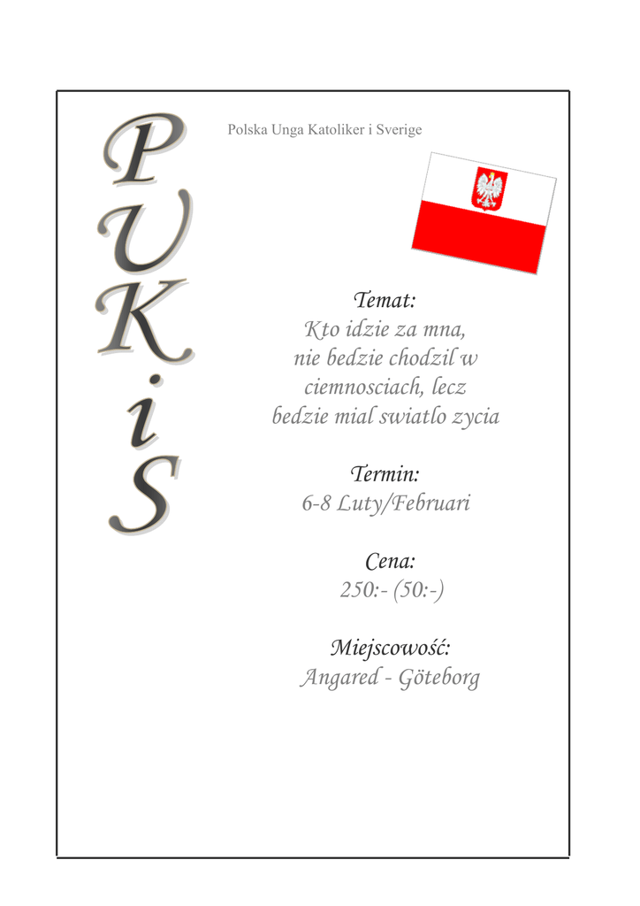Polska Unga Katoliker i Sverige Temat: Kto idzie za mna, nie bedzie chodzil w ciemnosciach, lecz bedzie mial swiatlo zycia Termin: 6-8 Luty/Februari Cena: 250:- (50:-) Miejscowość: Angared - Göteborg Na obóz zgłaszajcie się do kolejnych osób: Sztokholm i okolice: Maria Białobrzeska: 0738416137 [email protected] Ks. Mariusz Chamarczuk: 0704899120 [email protected] Malmö i okolice: Sławek Wojnikow: 0739565032 [email protected] (PROSZĘ PRZECZYTAĆ!) Z ZA AP PA AM MIIĘ ĘT TA AJJ!! Jesli ktoś jest chetny, a ma jakieś problemy (np. finansowe) niech da znać, pomożemy rozwiązać. Osoby, które zmagają się z problemami zdrowotnymi lub alergią, proszone są przede wszystkim o zabranie ze sobą odpowiednich medykamentów oraz o wcześniejszą informację na ten temat do osób zapisujących na obóz. NA SPOTKANIACH PUKIS OBOWIĄZUJĄ PODSTAWOWE ZASADY DOBREGO WYCHOWANIA: WSZYSCY UCZESTNICZYMY W ZABAWACH PRZEWIDZIANYCH W PROGRAMIE. CHŁOPCY I DZIEWCZĘTA ŚPIĄ W ODDZIELNYCH POMIESZCZENIACH. ZAKAZ SPOŻYWANIA ALKOHOLU! Osoby nie przestrzegające tych zasad będą odsyłane do domu na koszt własny lub szczęśliwych rodziców! Na obóz należy zabrać: Dużo dobrego humorku Śpiwór lub prześcieradło (poduszkę dla tych co chcą) ciepłe ubranka, wygodne buty, latarki, ręczniki itp. Ostatnia data zgłaszania: 2/2 ‐09 Ponieważ zawsze są spóźnione zgłoszenia i może braknąć miejsc w busach, BARDZO proszę zgłaszać sie przed podana datą PODAJ TO ZAPROSZENIE DALEJ!! Pozdrawiam Maria Białobrzeska