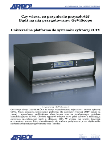 Czy wiesz, co przyniesie przyszłość? Bądź na nią przygotowany: GeViScope Uniwersalna platforma do systemów cyfrowej CCTV [rysunek: GeViScope] GeViScope firmy GEUTEBRÜCK to nowy, wszechstronny rejestrator i serwer cyfrowej CCTV. Nowa koncepcja uniwersalnej platformy dla systemów cyfrowej CCTV bazuje na znanej i sprawdzonej architekturze klient/serwer oraz na standardowym protokole komunikacyjnym TCP/IP. Obróbka sygnałów odbywa się w pełni cyfrowo, a realizują ją sprzętowo specjalizowane karty z układami DSP. W wyniku tak prostej koncepcji otrzymujemy system, który charakteryzuje się wieloma pożądanymi przez użytkownika zaletami sprzętu służącego ochronie osób i mienia: 1. Najwyższa szybkość przetwarzania sygnału przez układy DSP Wszystkie sygnały wideo/audio przetwarzane są w czasie rzeczywistym. Oznacza to zapis obrazu z prędkością 25 klatek na sekundę dla każdego kanału wideo. Niezależnie od procesu nagrywania, w czasie rzeczywistym przetwarzany jest sygnał do transmisji strumieniowej "na żywo". Nagrywanie oczywiście może być sterowane przez harmonogram czasowy lub na bieżąco zmieniać się pod wpływem zdarzeń, które zostały zaprogramowane podczas konfigurowania urządzenia. Każdemu kanałowi wideo może towarzyszyć zapis i transmisja sygnału audio. 2. Wygoda obsługi i serwisu Przetwarzanie sygnału w czasie rzeczywistym ma również istotne znaczenie dla obsługi systemu w przypadku synchronizowania sygnałów audio i wideo oraz przy stosowaniu kamer obrotowych, gdzie ograniczenie opóźnienia ma duże znaczenie podczas manualnego sterowania tymi kamerami. Zaawansowane programowe narzędzia diagnostyczne pozwalają na szybkie lokalizowanie ewentualnych usterek, a modułowa budowa urządzenia upraszcza ich usuwanie. 3. Pewny sprzęt Sprzęt CCTV powinien przede wszystkim gwarantować pewność działania. GeViScope może być wyposażony w redundantne zasilacze, system zapisu na macierzach RAID oraz zintegrowany sprzętowy system "watchdog", który czuwa nad poprawnym działaniem urządzenia. Kontrolowana jest praca wentylatorów chłodzących, temperatura wewnątrz obudowy, stan dysków twardych. W przypadku wykrycia anomalii generowany jest odpowiedni komunikat lub wysterowany jest przekaźnik sygnalizacyjny, a w skrajnym przypadku wymuszany jest restart urządzenia. 4. Inteligentne oprogramowanie Struktura bazy danych gromadzącej zapisane dane gwarantuje szybkość działania oraz bezpieczeństwo zgromadzonego materiału. W przypadku awarii dysku, tracone są wyłącznie dane z tego dysku, pozostałe sekwencje wideo są nienaruszone. System jest również odporny na przypadkowe zaniki napięcia zasilania, gdyż system jest gotowy do pracy natychmiast po jego ponownym załączeniu, bez niepotrzebnego czasu na testowanie zawartości dysków i stanu bazy. Opcja automatycznej archiwizacji umożliwia wygodne zabezpieczanie całości lub wybranych fragmentów nagrań. Zaawansowany system uprawnień reguluje dostęp użytkowników do zgromadzonych nagrań. Programowe maskowanie wybranych fragmentów obrazu może zmieniać sie zależnie od harmonogramu, występujących zdarzeń lub od uprawnień użytkownika. Zaawansowana detekcja ruchu do zastosowań wewnętrznych i zewnętrznych wykorzystuje algorytmy detekcji ruchu dostępne dotychczas wyłącznie w specjalizowanych urządzeniach. Detekcja "zewnętrzna" wykorzystuje m. in. analizę obrazu w czasie rzeczywistym dla 128 dowolnie deklarowanych obszarów, które mogą być dowolnie łączone w strefy wzbudzania, wyciszania i podtrzymywania alarmów, analizowany jest kierunek i prędkość ruchu obiektów oraz tłumione są wpływy czynników środowiskowych, takich jak np. drgania kamery, ruch liści drzew na wietrze lub opady atmosferyczne. Również mechanizm programowania i przetwarzania alarmów jest bardzo zaawansowany i umożliwia np. ustawianie 3 różnych priorytetów alarmów. Bardzo efektywne jest również wykorzystanie przestrzeni dyskowej, gdyż dane przechowywane są na wskazanych obszarach, z których każdy może mieć inną wielkość, deklarowany okres przechowywania nagrań i priorytet zapisu. 5. Algorytmy kompresji obrazu Unikalna cecha GeViScope to "inteligentna kompresja dynamiczna" (intelligent dynamic compression, IDC). Algorytm ten pozwala na ekonomiczne i efektywne wykorzystanie dostępnej przestrzeni dyskowej poprzez automatyczne dostosowanie prędkości rejestracji obrazów i ich jakości do priorytetu danego zdarzenia oraz do zawartości zakłóceń obrazu. Wszystko to odbywa się w czasie rzeczywistym i powoduje odrzucenie nadmiarowych obrazów "nieruchomych", nie niosących żadnej nowej informacji. Dwa różne poziomy nagrywania ciągłego gwarantują użyteczne udokumentowanie każdego zdarzenia, nawet gdy wystąpi sytuacja krytyczna i ilość tych zdarzeń gwałtownie wzrośnie. 6. Detekcja obecności sygnału audio GeViScope posiada wbudowaną detekcje sygnału audio. Alarm aktywowany jest, gdy natężenie dźwięku przekroczy zadany próg. Może to być np. szept lub ciche kroki, ale również zbicie szyby. Alarm taki jest przetwarzany jak każde inne zdarzenie alarmowe, które można oprogramować w systemie. 7. Modularność i wszechstronność Budowa modularna pozwala na wybór opcji sprzętowych i programowych zgodnych z wymaganiami danej aplikacji. Rejestratory można dowolnie łączyć w strukturze sieciowej. Takie podejście do architektury systemu umożliwia idealne wkomponowanie go w systemy zintegrowane. Dostępne rozszerzenia sprzętowe, uaktualnienia oprogramowania, system dodatkowych licencji uaktywniających takie opcje jak dodatkowe algorytmy kompresji, detekcję ruchu lub algorytmy analizy obrazu gwarantują łatwe serwisowanie i modyfikację systemu tak, aby spełniał on nowe oraz wciąż rosnące potrzeby użytkownika systemu. GeViScope zachowuje tradycyjne podejście firmy GEUTEBRÜCK do budowy systemów CCTV, gwarantujące łatwe