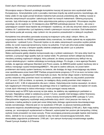 Dzień złych informacji i amerykańskich szczytów Wczorajsza sesja w Stanach przebiegła kompletnie inaczej niż jeszcze rano wyobrażali sobie Europejczycy. Amerykańskie rynki z początku niemrawo kręciły się wokół poziomu neutralnego, ale kiedy udało im się wyjść ponad środowe maksima byki poczuły prawdziwą siłę. Indeksy ruszyły w kierunku sierpniowych szczytów i zakończyły dzień na nowych maksimach. Główną przyczyną wzrostu były informacje ze spółek, które optymistycznie patrzą w przyszłość. Wczorajsza zwyżka powoduje, że do wyjścia na 12 miesięczny plus S&P500 potrzebuje jeszcze 16 proc., ale wraz z upływającym czasem baza będzie się zmniejszać i wystarczy, że uda się utrzymać obecny poziom indeksu do 7 października i już będziemy mówili o pierwszym rocznym wzroście. Dziś kalendarium jest równie puste jak wczoraj, więc rynkom nic nie powinno przeszkodzić w dalszych zwyżkach. Kompletnie inna atmosfera panowała wczoraj na krajowym rynku akcji i złotym. Mimo, że rozpoczęcie handlu na WIG20 zapowiadało dobry scenariusz, bo indeks opierał się na azjatyckim optymizmie i zyskiwał 2 proc. Pewność byków co do ataku sierpniowych szczytów szybko jednak znikła, bo rynek rozpoczął dynamiczny marsz na południe. O tym jak silna była podaż najlepiej świadczy fakt, że wraz z tempem spadku istotnie zwiększał się obrót i już w południe przekroczyliśmy barierę miliarda złotych. Słabe zachowanie giełdy idealnie komponowało się z rynkiem walutowym. Od rana złoty tracił na wartości, a przyczyn tego spadku było aż nazbyt wiele. Po pierwsze echem odbijał się środowy nieudany przetarg rządowych obligacji, który pokazał, że obawy przyszłoroczny deficyt nie są niczym abstrakcyjnym i realnie oddziałują na kondycję złotego. Po drugie, z rana agencja Reuters podała, że agencja raitingowa Standard and Poors uważa, że „polski system bankowy stoi w obliczu rosnącego ryzyka kredytowego”. Nie jest to żadne odkrycie, bo przed takim problemem stoi każdy system bankowy na świecie, ale dodając do tego umacniającego się dolara oraz opublikowane przez bank BNP Paribas przypomnienie prognozy 4,70 zł za euro na koniec roku spowodowała, że negatywnych informacji było za dużo. Na domiar złego nawet z technicznego punktu widzenia złoty powinien tracić na wartości, ponieważ nie udało mu się przebić poziomów 4,07 za euro i 2,80 za dolara, co sprawia, że następny dłuży postój powinien mieć miejsce w okolicach 4,20 i 2,96 zł odpowiednio dla euro i dolara. Optymistycznie można zauważyć, że skoro tyle negatywnych informacji pojawiło się jednego dnia to w najbliższym czasie nie będzie ich wcale, a brak złych informacji to dobra informacja i może pomagać naszej walucie. Końcówka sesji na GPW była wczoraj na tyle słaba, że staliśmy się najsłabszym parkietem w Europie. Największy wkład w ostateczny ponad 1,5 proc. spadek miał taniejący sektor finansowy. PEKAO i PKO BP straciły ponad 3 proc., a honoru branży bronił jedynie BRE zyskując 0,7 proc. Zdecydowanie negatywny wydźwięk sesji podkreśla duży obrót i choć jeszcze nie mamy do czynienia z żadną paniką to rynek jest coraz bliżej testu dolnego ograniczenia dwumiesięcznego kanału wzrostowego. Obecnie jest on na wysokości 2150 pkt. co jeszcze bardziej podkreśla znaczenie wsparcia ukształtowanego w trakcie sierpniowej konsolidacji (2160 pkt.). Byki mają realną szansę, po wczorajszych wydarzeniach w Stanach, wykorzystać ten poziom jak trampolinę z której wybicie może prowadzić na nowe szczyty. Przez wczorajszą przecenę początek będzie dziś bardzo dobry. Jednak to na co popyt musi uważać to aby nie było rozczarowującej końcówki, która stwarzałaby zagrożenie przełamania 2160 pkt. i tym samym kontynuacji wrześniowego spadku. Paweł Cymcyk Analityk A-Z Finanse