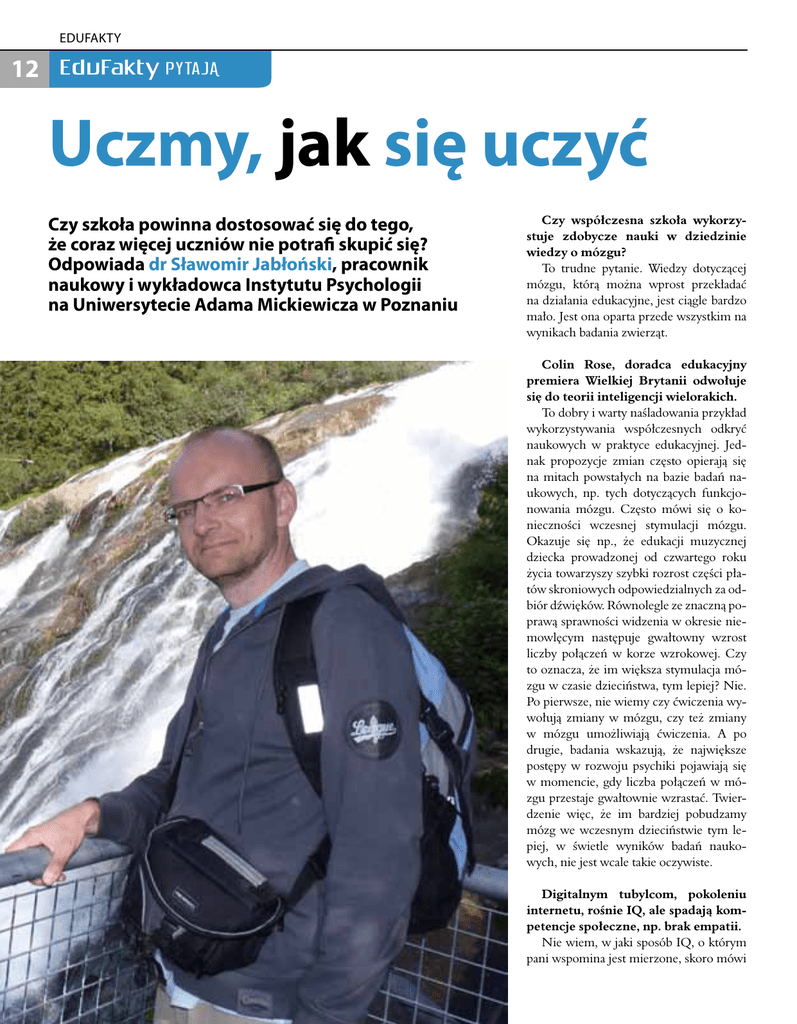 edufakty 12 PYTAJĄ Uczmy, jak się uczyć Czy szkoła powinna dostosować się do tego, że coraz więcej uczniów nie potrafi skupić się? Odpowiada dr Sławomir Jabłoński, pracownik naukowy i wykładowca Instytutu Psychologii na Uniwersytecie Adama Mickiewicza w Poznaniu Czy współczesna szkoła wykorzystuje zdobycze nauki w dziedzinie wiedzy o mózgu? To trudne pytanie. Wiedzy dotyczącej mózgu, którą można wprost przekładać na działania edukacyjne, jest ciągle bardzo mało. Jest ona oparta przede wszystkim na wynikach badania zwierząt. Colin Rose, doradca edukacyjny premiera Wielkiej Brytanii odwołuje się do teorii inteligencji wielorakich. To dobry i warty naśladowania przykład wykorzystywania współczesnych odkryć naukowych w praktyce edukacyjnej. Jednak propozycje zmian często opierają się na mitach powstałych na bazie badań naukowych, np. tych dotyczących funkcjonowania mózgu. Często mówi się o konieczności wczesnej stymulacji mózgu. Okazuje się np., że edukacji muzycznej dziecka prowadzonej od czwartego roku życia towarzyszy szybki rozrost części płatów skroniowych odpowiedzialnych za odbiór dźwięków. Równolegle ze znaczną poprawą sprawności widzenia w okresie niemowlęcym następuje gwałtowny wzrost liczby połączeń w korze wzrokowej. Czy to oznacza, że im większa stymulacja mózgu w czasie dzieciństwa, tym lepiej? Nie. Po pierwsze, nie wiemy czy ćwiczenia wywołują zmiany w mózgu, czy też zmiany w mózgu umożliwiają ćwiczenia. A po drugie, badania wskazują, że największe postępy w rozwoju psychiki pojawiają się w momencie, gdy liczba połączeń w mózgu przestaje gwałtownie wzrastać. Twierdzenie więc, że im bardziej pobudzamy mózg we wczesnym dzieciństwie tym lepiej, w świetle wyników badań naukowych, nie jest wcale takie oczywiste. Digitalnym tubylcom, pokoleniu internetu, rośnie IQ, ale spadają kompetencje społeczne, np. brak empatii. Nie wiem, w jaki sposób IQ, o którym pani wspomina jest mierzone, skoro mówi marzec 2011 13 się, że rośnie. Być może mierzenie obejmuje kompetencje, które są przez dziecko ćwiczone, gdy siedzi przed komputerem, a więc np. koordynacja wzrokowo-ruchowa, szybkość reakcji, reagowanie na bodźce ruchowe. Natomiast w części testu Wechslera, który bada inteligencję słowną, ci sami młodzi mogą nie być orłami. Rzeczywiście, latem na podwórkach widać coraz mniej dzieci np. grających w piłkę. Dobrze, jeśli robią coś przy komputerze w grupie. Źle, gdy kontakt z rówieśnikami jest ograniczony tylko do sieci. Dzisiaj rozmowa rodzica z dzieckiem jest dialogiem międzykulturowym. Trzeba wiele odkryć, by odpowiedzieć na pytanie, jaka jest kultura „digitalnych tubylców”, jakie są ich kompetencje. Konflikt pokoleń istnieje od zarania dziejów. Ale dziś mamy niesamowite przyspieszenie cywilizacyjne... Konflikt pokoleń ma dzisiaj inną postać. Kiedyś było tak, że kultura dorosłych uczyła życia, przekazywała wzorce. Natomiast dzisiaj często jest tak, że to dzieci w wielu obszarach uczą dorosłych – np. obsługi komputera, komórki, tłumaczą, co to jest skype, gadu-gadu, czat. W związku z tym dzieci nie do końca postrzegają dorosłych jako autorytety, jako nauczycieli życia. Wrośnięta w epokę internetu współczesna młodzież ma trochę inaczej ukształtowany mózg niż wcześniejsze pokolenia. Chyba więc w edukacji powinniśmy już wyciągać z tego wnioski. Młodzi potrafią z powodzeniem wykonywać kilka rzeczy naraz, natomiast nie potrafią skupić się, powiedzmy, na operze. Ma pani rację. Podkreśla się, że jedną z podstawowych kompetencji uczenia się jest zdolność hamowania i kontrolowania zachowań impulsywnych. Jeśli ktoś nie potrafi skupić się dłużej na monotonnej czynności, po prostu tej kompetencji nie ma. Czy szkoła powinna się jakoś dostosować do tego, że coraz więcej osób nie potrafi skupić się? To kwestia szersza, związana z psychologią rozwojową czy wychowawczą. Kształtowanie umiejętności kontrolowania własnych impulsów jest możliwe już od drugiego roku życia. Mniej więcej w tym czasie rozpoczyna się intensywny rozwój płatów czołowych mózgu, które odpowiadają za kontrolę impulsów i emocji. Jeżeli ta zdolność nie jest wystarczająco stymulowana w okresie przedszkolnym, to do szkoły trafiają młodzi ludzie, którzy mają z tym kłopot. Wykształcenie tej umiejętności w przedszkolu jest bazą skutecznego uczenia się, które polega na tym, że młody człowiek musi podporządkować bieg swoich procesów psychicznych zewnętrznej instrukcji nauczyciela. Od szkoły nie można żądać więc podporządkowania się temu, że coraz więcej dzieci nie ma umiejętności kontrolowania impulsów. Całkowite podporządkowanie się oznaczałoby konieczność zaprzestania uczenia. Trzeba się raczej zastanowić, jak w szkole rozwijać brakujące kompetencje. mie, Singapurze, gdzie dzieci odnoszą duże sukcesy z tego przedmiotu. Tamtejsze podręczniki są krótkie, konkretne, wyjaśniają wszystko na czytelnych przykładach. Oprzyrządowanie edukacji, zarówno podręczniki, jak i pomoce szkolne, funkcjonują dziś u nas na zasadzie wolnego rynku. Co się sprzedaje, jest drukowane czy tworzone. Bez względu na to, czy jest dobre. Prowadzi się mało badań naukowych dotyczących efektywności wykorzystywania w procesie nauczania zarówno pomocy fizycznych, jak i samych metod. A jeśli się je prowadzi, ich wyniki nie są wykorzystywane w budowaniu m. in. programów kształcenia. To szerszy problem, nie tylko polskiej edukacji. Najpierw wprowadza się jakąś zmianę, a później ewentualnie bada się jej skutki. A może należy zmienić pruski system edukacyjny z ławką i biurkiem? Kwestią otwartą jest, w jakich warunkach będzie odbywało się nauczanie. Czy dzieci mają siedzieć w ławkach, czy nie, czy mają mieć zeszyty i podręczniki, czy nie. Natomiast szko