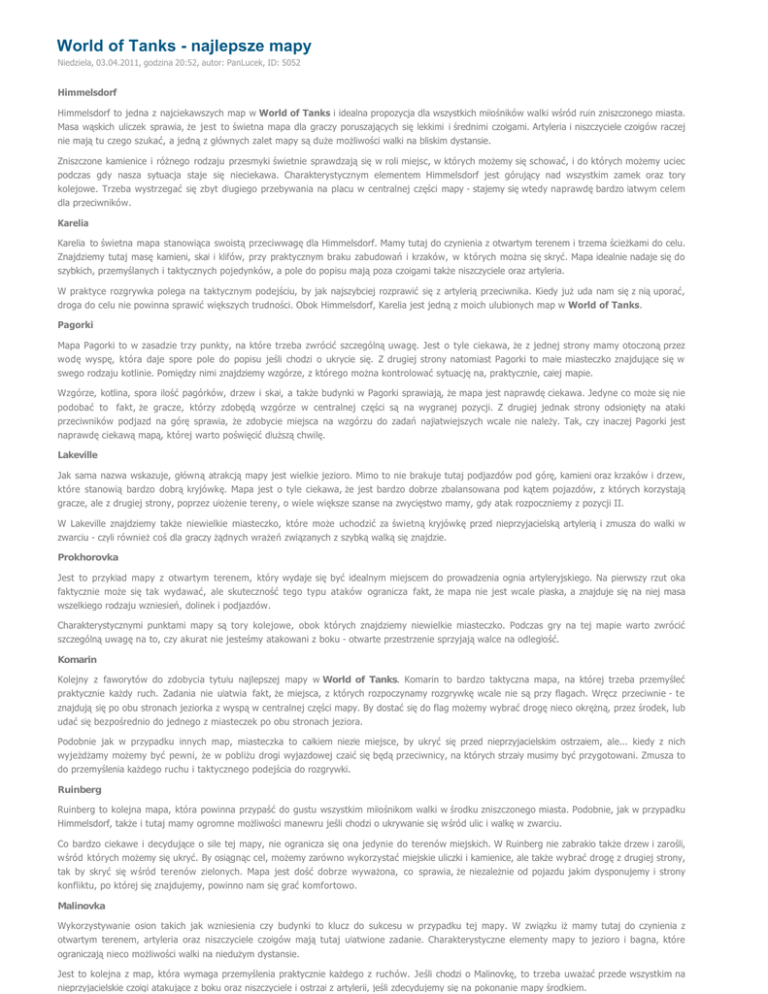 World of Tanks - najlepsze mapy Niedziela, 03.04.2011, godzina 20:52, autor: PanLucek, ID: 5052 Himmelsdorf Himmelsdorf to jedna z najciekawszych map w World of Tanks i idealna propozycja dla wszystkich miłośników walki wśród ruin zniszczonego miasta. Masa wąskich uliczek sprawia, że jest to świetna mapa dla graczy poruszających się lekkimi i średnimi czołgami. Artyleria i niszczyciele czołgów raczej nie mają tu czego szukać, a jedną z głównych zalet mapy są duże możliwości walki na bliskim dystansie. Zniszczone kamienice i różnego rodzaju przesmyki świetnie sprawdzają się w roli miejsc, w których możemy się schować, i do których możemy uciec podczas gdy nasza sytuacja staje się nieciekawa. Charakterystycznym elementem Himmelsdorf jest górujący nad wszystkim zamek oraz tory kolejowe. Trzeba wystrzegać się zbyt długiego przebywania na placu w centralnej części mapy - stajemy się wtedy naprawdę bardzo łatwym celem dla przeciwników. Karelia Karelia to świetna mapa stanowiąca swoistą przeciwwagę dla Himmelsdorf. Mamy tutaj do czynienia z otwartym terenem i trzema ścieżkami do celu. Znajdziemy tutaj masę kamieni, skał i klifów, przy praktycznym braku zabudowań i krzaków, w których można się skryć. Mapa idealnie nadaje się do szybkich, przemyślanych i taktycznych pojedynków, a pole do popisu mają poza czołgami także niszczyciele oraz artyleria. W praktyce rozgrywka polega na taktycznym podejściu, by jak najszybciej rozprawić się z artylerią przeciwnika. Kiedy już uda nam się z nią uporać, droga do celu nie powinna sprawić większych trudności. Obok Himmelsdorf, Karelia jest jedną z moich ulubionych map w World of Tanks. Pagorki Mapa Pagorki to w zasadzie trzy punkty, na które trzeba zwrócić szczególną uwagę. Jest o tyle ciekawa, że z jednej strony mamy otoczoną przez wodę wyspę, która daje spore pole do popisu jeśli chodzi o ukrycie się. Z drugiej strony natomiast Pagorki to małe miasteczko znajdujące się w swego rodzaju kotlinie. Pomiędzy nimi znajdziemy wzgórze, z którego można kontrolować sytuację na, praktycznie, całej mapie. Wzgórze, kotlina, spora ilość pagórków, drzew i skał, a także budynki w Pagorki sprawiają, że mapa jest naprawdę ciekawa. Jedyne co może się nie podobać to fakt, że gracze, którzy zdobędą wzgórze w centralnej części są na wygranej pozycji. Z drugiej jednak strony odsłonięty na ataki przeciwników podjazd na górę sprawia, że zdobycie miejsca na wzgórzu do zadań najłatwiejszych wcale nie należy. Tak, czy inaczej Pagorki jest naprawdę ciekawą mapą, której warto poświęcić dłuższą chwilę. Lakeville Jak sama nazwa wskazuje, główną atrakcją mapy jest wielkie jezioro. Mimo to nie brakuje tutaj podjazdów pod górę, kamieni oraz krzaków i drzew, które stanowią bardzo dobrą kryjówkę. Mapa jest o tyle ciekawa, że jest bardzo dobrze zbalansowana pod kątem pojazdów, z których korzystają gracze, ale z drugiej strony, poprzez ułożenie tereny, o wiele większe szanse na zwycięstwo mamy, gdy atak rozpoczniemy z pozycji II. W Lakeville znajdziemy także niewielkie miasteczko, które może uchodzić za świetną kryjówkę przed nieprzyjacielską artylerią i zmusza do walki w zwarciu - czyli również coś dla graczy żądnych wrażeń związanych z szybką walką się znajdzie. Prokhorovka Jest to przykład mapy z otwartym terenem, który wydaje się być idealnym miejscem do prowadzenia ognia artyleryjskiego. Na pierwszy rzut oka faktycznie może się tak wydawać, ale skuteczność tego typu ataków ogranicza fakt, że mapa nie jest wcale płaska, a znajduje się na niej masa wszelkiego rodzaju wzniesień, dolinek i podjazdów. Charakterystycznymi punktami mapy są tory kolejowe, obok których znajdziemy niewielkie miasteczko. Podczas gry na tej mapie warto zwrócić szczególną uwagę na to, czy akurat nie jesteśmy atakowani z boku - otwarte przestrzenie sprzyjają walce na odległość. Komarin Kolejny z faworytów do zdobycia tytułu najlepszej mapy w World of Tanks. Komarin to bardzo taktyczna mapa, na której trzeba przemyśleć praktycznie każdy ruch. Zadania nie ułatwia fakt, że miejsca, z których rozpoczynamy rozgrywkę wcale nie są przy flagach. Wręcz przeciwnie - te znajdują się po obu stronach jeziorka z wyspą w centralnej części mapy. By dostać się do flag możemy wybrać drogę nieco okrężną, przez środek, lub udać się bezpośrednio do jednego z miasteczek po obu stronach jeziora. Podobnie jak w przypadku innych map, miasteczka to całkiem niezłe miejsce, by ukryć się przed nieprzyjacielskim ostrzałem, ale... kiedy z nich wyjeżdżamy możemy być pewni, że w pobliżu drogi wyjazdowej czaić się będą przeciwnicy, na których strzały musimy być przygotowani. Zmusza to do przemyślenia każdego ruchu i taktycznego podejścia do rozgrywki. Ruinberg Ruinberg to kolejna mapa, która powinna przypaść do gustu wszystkim miłośnikom walki w środku zniszczonego miasta. Podobnie, jak w przypadku Himmelsdorf, także i tutaj mamy ogromne możliwości manewru jeśli chodzi o ukrywanie się wśród ulic i walkę w zwarciu. Co bardzo ciekawe i decydujące o sile tej mapy, nie ogranicza się ona jedynie do terenów miejskich. W Ruinberg nie zabrakło także drzew i zarośli, wśród których możemy się ukryć. By osiągnąc cel, możemy zarówno wykorzystać miejskie uliczki i kamienice, ale także wybrać drogę z drugiej strony, tak by skryć się wśród terenów zielonych. Mapa jest dość dobrze wyważona, co sprawia, że niezależnie od pojazdu jakim dysponujemy i strony konfliktu, po której się znajdujemy, powinno nam się grać komfortowo. Malinovka Wykorzystywanie osłon takich jak wzniesienia czy budynki to klucz do sukcesu w przypadku tej mapy. W związku iż mamy tutaj do czynienia z otwartym terenem, artyleria oraz niszczyciele czołgów mają tutaj ułatwione zadanie. Charakt