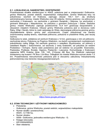 6.1. LOKALIZACJA, SĄSIEDZTWO, DOSTĘPNOŚĆ Przedmiotowa działka ewidencyjna nr 454/5, położona jest w miejscowości Golkowice, gmina Wieliczka, powiat wielicki, województwo małopolskie. Gmina Wieliczka leży na południowy- wschód od Krakowa, zajmując obszar 100,1 km 2. Jej strukturę administracyjna tworzą: miasto Wieliczka oraz 29 sołectw. Gmina graniczy: na północnym zachodzie z Krakowem, na zachodzie z gminami Świątniki i Siepraw, na wschodzie z gminami Biskupice i Niepołomice, na południu z gminami Dobczyce i Gdów. Siedziba gminy- miasto Wieliczka- zajmuje powierzchnie 13,4 km 2 granicząc bezpośrednio z obszarem miejskim Krakowa. Obszar gminy Wieliczka położony jest w dorzeczu rzeki Raby, Wilgi i Serafy, które to rzeki wpływają do Wisły, stanowiącej północną granicę gminy. Ukształtowanie terenu gminy jest urozmaicone. Część południowa ma bardzo zróżnicowaną rzeźbę terenu, natomiast północna, położona w pradolinie Wisły, jest raczej nizinna. Golkowice to wieś, oddalona od centrum Krakowa o 12 km, granicząca z nim od północnozachodniej strony. Położona na Pogórzu Wielickim, na dwóch wzniesieniach rozdzielonych południkowo rzeką Wilgą. Od zachodu graniczy z osiedlem Zbydniowice, od północy z osiedlami Rajsko i Soboniowice, od wschodu z wsią Grabówki, od południa ze wsiami Podstolice i Ochojno. Sama wieś podzielona jest od wieków na przysiółki: Sosnowiec, Pastwiska, Podlesie, Środek, Gąsiory, Pasternik i Lasowice. Komunikację z Krakowem zapewnia MPK Kraków (linie 135, 145, 214)oraz AB Bus. Do Wieliczki natomiast dostaniemy się busami: FK Bus i Uni-Bus. Odległość do miasta Wieliczka wynosi około 7,5 km. Przedmiotowa nieruchomość położona jest w otoczeniu zabudowy mieszkaniowej jednorodzinnej oraz terenów niezagospodarowanych. https://www.google.pl/maps/ 6.2. STAN TECHNICZNY I UŻYTKOWY NIERUCHOMOŚCI Położenie; Golkowice, gmina Wieliczka, powiat wielicki, województwo małopolskie Numer działki i powierzchnia; – 454/5 - 0,1156 ha, Numer obrębu: 0006– Golkowice, jednostka ewidencyjna Wieliczka - G. Księga wieczysta; KR1I/00040652/5 Stan władania; prawo własności nieruchomości. Kształt działki; działka regularna o kształcie zbliżonym do prostokąta. Ukształtowanie terenu; Teren płaski z niewielkim spadkiem w kierunku południowym. Uzbrojenie działki: urządzenia infrastruktury technicznej w sąsiedztwie. Zagospodarowanie terenu; działka ewidencyjna nr 454/5 jest niezabudowana, nieogrodzona, niezagospodarowana, porośnięta roślinnością niepielęgnowaną i samosiejkami. Otoczenie, sąsiedztwo: przedmiotowa nieruchomość położona jest w otoczeniu terenów zabudowanych nowymi i starszymi budynkami mieszkalnymi jednorodzinnymi oraz terenów niezabudowanych. Dostęp komunikacyjny; działka posiada bezpośredni dostęp do drogi publicznej, wąskiej, o nawierzchni utwardzonej. 6.3. STAN PRAWNY NIERUCHOMOŚCI OZNACZENIE KSIĘGI WIECZYSTEJ: Księga wieczysta; KR1I/00040652/5 prowadzona przez Sąd Rejonowy w Wieliczce, III Wydział Ksiąg wieczystych. Dział I-O – OZNACZENIE NIERUCHOMOŚCI: Numer bieżący nieruchomości: 1 Numer porządkowy: 1 Województwo: małopolskie Powiat: wielicki Gmina: Wieliczka Miejscowość: Golkowice Działka ewidencyjna: Identyfikator działki: 121905_5.0006.454/1 Numer działki: 454/1 Numer obrębu ewidencyjnego i nazwa: 0006 Golkowice Położenie: 1 Sposób korzystania: B- tereny mieszkaniowe Przyłączenie: numer Księgi /00006215/0, obszar 0,1100 ha Identyfikator działki: 121905_5.0006.454/5 Numer działki: 454/5 Numer i nazwa obrębu ewidencyjnego: 0006 Golkowice Położenie:1 Sposób korzystania: S – sady Obszar: 0,2256 ha Dział I-Sp – SPIS PRAW ZWIĄZANYCH Z WŁASNOŚCIĄ: Brak wpisu Dział II – WŁASNOŚĆ: Numer udziału w prawie: 1 Wielkość udziału: 1/1 Osoba fizyczna: Lista wskazań udziału w prawie: 1 Imię pierwsze: Stanisław Nazwisko: Jałocha Imię ojca: Franciszek Imię matki: Anna Dział III – PRAWA, ROSZCZENIA I OGRANICZENIA: Numer wpisu: 1 Rodzaj wpisu: inny wpis Treść wpisu: wszczęcie egzekucji z nieruchomości na podstawie tytułu wykonawczego: - bankowego tytułu egzekucyjnego sygn. akt 25298/14971/02/2012 z dnia 29-10-2012r., - Postanowienia Sądu Rejonowego w Wieliczce sygn. akt I CO 2520/12 z dnia 23-11-2012r. Inna osoba prawna lub jednostka organizacyjna niebędąca osobą prawną: Nazwa: Bank Polska Kasa Opieki Spółka Akcyjna terenowy zespół windykacji detalicznej z siedzibą w Krakowie Numer wpisu: 2 Rodzaj wpisu: inny wpis Treść wpisu: przyłączenie się do wszczęcia egzekucji z nieruchomości na podstawie tytułu wykonawczego: - bankowego tytułu egzekucyjnego sygn. akt 1723/2012 z dnia 04-04-2012r., - Postanowienia Sądu Rejonowego w Wieliczce sygn. akt I CO 1016/12 z dnia 11-05-2012r. Inna osoba prawna lub jednostka organizacyjna niebędąca osobą prawną: Nazwa: Meritum Bank ICB Spółka akcyjna z siedzibą w Gdańsku Numer wpisu: 3 Rodzaj wpisu: inny wpis Treść wpisu: przyłączenie się do wszczęcia egzekucji z nieruchomości na podstawie tytułu wykonawczego: 1. Bankowego tytułu egzekucyjnego sygn. akt sąd. 3115/2012/DMRIW/PS z dnia 2012-08-01. 2. Postanowienia Sądu Rejonowego w Wieliczce sygn. akt sąd. I CO 2160/12 z dnia 2012-10-04. Inna osoba prawna lub jednostka organizacyjna niebędąca osobą prawną: Nazwa: Alior Bank S.A. z siedzibą w Warszawie Numer wpisu: 4 Rodzaj wpisu: inny wpis Treść wpisu: przyłączenie się do wszczęcia egzekucji na podstawie tytułu wykonawczego : 1. Bankowego tytułu egzekucyjnego sygn. akt. sąd.2759/2012/DMRIW/MM z dnia 22-05-2012. 2. Postanowienia Sądu Rejonowego w Wieliczce sygn. akt. sąd I CO 1685/12 z dnia 26-07-2012. Inna osoba prawna lub jednostka organizacyjna niebędąca osobą prawną: Nazwa: Alior Bank Spółka Akcyjna z siedzibą w Warszawie Dział IV – HIPOTEKA: Numer wzmianki i chwila zamieszczenia: DZ. KW./KR1I/6209/06/2, 2007-01-1912.