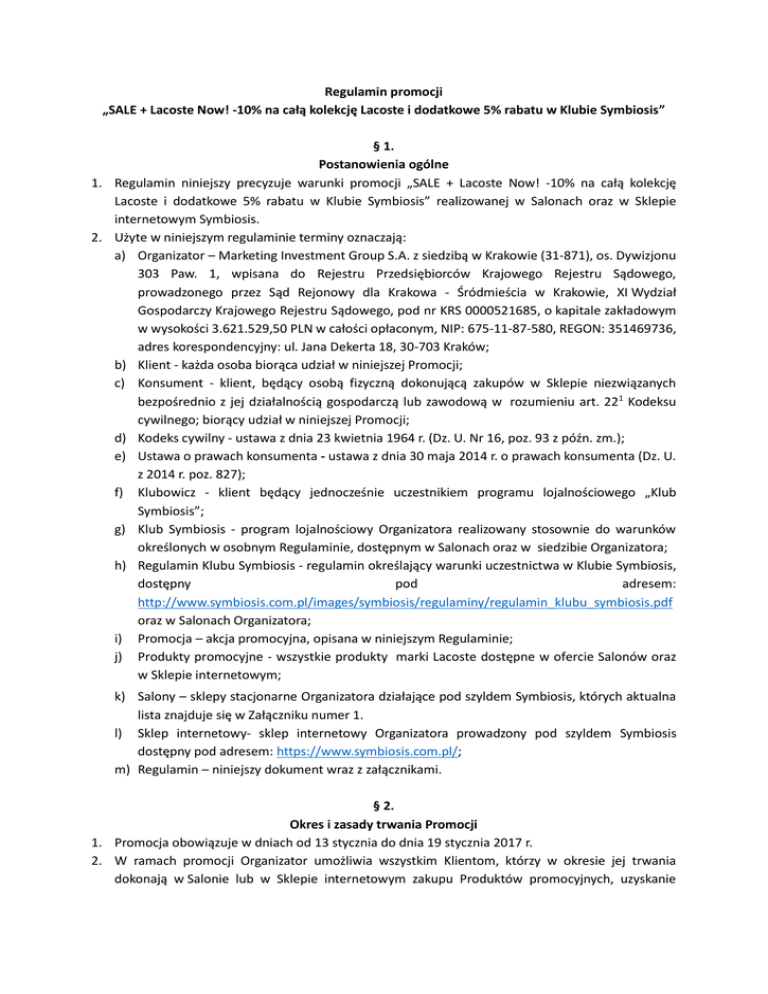 Regulamin promocji „SALE + Lacoste Now! -10% na całą kolekcję Lacoste i dodatkowe 5% rabatu w Klubie Symbiosis” § 1. Postanowienia ogólne 1. Regulamin niniejszy precyzuje warunki promocji „SALE + Lacoste Now! -10% na całą kolekcję Lacoste i dodatkowe 5% rabatu w Klubie Symbiosis” realizowanej w Salonach oraz w Sklepie internetowym Symbiosis. 2. Użyte w niniejszym regulaminie terminy oznaczają: a) Organizator – Marketing Investment Group S.A. z siedzibą w Krakowie (31-871), os. Dywizjonu 303 Paw. 1, wpisana do Rejestru Przedsiębiorców Krajowego Rejestru Sądowego, prowadzonego przez Sąd Rejonowy dla Krakowa - Śródmieścia w Krakowie, XI Wydział Gospodarczy Krajowego Rejestru Sądowego, pod nr KRS 0000521685, o kapitale zakładowym w wysokości 3.621.529,50 PLN w całości opłaconym, NIP: 675-11-87-580, REGON: 351469736, adres korespondencyjny: ul. Jana Dekerta 18, 30-703 Kraków; b) Klient - każda osoba biorąca udział w niniejszej Promocji; c) Konsument - klient, będący osobą fizyczną dokonującą zakupów w Sklepie niezwiązanych bezpośrednio z jej działalnością gospodarczą lub zawodową w rozumieniu art. 221 Kodeksu cywilnego; biorący udział w niniejszej Promocji; d) Kodeks cywilny - ustawa z dnia 23 kwietnia 1964 r. (Dz. U. Nr 16, poz. 93 z późn. zm.); e) Ustawa o prawach konsumenta - ustawa z dnia 30 maja 2014 r. o prawach konsumenta (Dz. U. z 2014 r. poz. 827); f) Klubowicz - klient będący jednocześnie uczestnikiem programu lojalnościowego „Klub Symbiosis”; g) Klub Symbiosis - program lojalnościowy Organizatora realizowany stosownie do warunków określonych w osobnym Regulaminie, dostępnym w Salonach oraz w siedzibie Organizatora; h) Regulamin Klubu Symbiosis - regulamin określający warunki uczestnictwa w Klubie Symbiosis, dostępny pod adresem: http://www.symbiosis.com.pl/images/symbiosis/regulaminy/regulamin_klubu_symbiosis.pdf oraz w Salonach Organizatora; i) Promocja – akcja promocyjna, opisana w niniejszym Regulaminie; j) Produkty promocyjne - wszystkie produkty marki Lacoste dostępne w ofercie Salonów oraz w Sklepie internetowym; k) Salony – sklepy stacjonarne Organizatora działające pod szyldem Symbiosis, których aktualna lista znajduje się w Załączniku numer 1. l) Sklep internetowy- sklep internetowy Organizatora prowadzony pod szyldem Symbiosis dostępny pod adresem: https://www.symbiosis.com.pl/; m) Regulamin – niniejszy dokument wraz z załącznikami. § 2. Okres i zasady trwania Promocji 1. Promocja obowiązuje w dniach od 13 stycznia do dnia 19 stycznia 2017 r. 2. W ramach promocji Organizator umożliwia wszystkim Klientom, którzy w okresie jej trwania dokonają w Salonie lub w Sklepie internetowym zakupu Produktów promocyjnych, uzyskanie rabatu w wysokości 10% (słownie: dziesięć procent) od aktualnej ceny zakupionego Produktu promocyjnego z zastrzeżeniem wynikającym z ust. 5 niniejszego paragrafu. 3. Wskazany rabat nie łączy się z innymi akcjami promocyjnymi Organizatora za wyjątkiem rabatu wynikającego z Regulaminu „Klub Symbiosis”. Maksymalna wysokość rabatu, jaki może uzyskać Klubowicz w niniejszej Promocji wynosi 15% (słownie: piętnaście procent). 4. Chęć przystąpienia do Promocji w Salonie należy zgłosić przed wystawieniem dokumentu fiskalnego. 5. W Sklepie internetowym ceny z uwzględnieniem wyżej wskazanego rabatu widoczne są obok Produktów promocyjnych. § 3. Zasady zwrotu i wymiany Produktów promocyjnych zakupionych w Sklepie internetowym 1. Zgodnie z art. 27 Ustawy o prawach konsumenta Konsumentowi przysługuje prawo do odstąpienia od Umowy Sprzedaży Produktów promocyjnych bez podania jakiejkolwiek przyczyny w terminie 14 (słownie: czternastu) dni od dnia w którym Konsument wszedł w posiadanie Produktów promocyjnych lub w którym wskazana przez Konsumenta osoba trzecia inna niż Kurier weszła w posiadanie Produktów promocyjnych. 2. Konsument ponosi odpowiedzialność za zmniejszenie wartości Produktu promocyjnego będące wynikiem korzystania z niego w sposób wykraczający poza konieczny do stwierdzenia charakteru, cech i funkcjonowania Produktu. 3. Ponad uprawnienia Konsumenta, o których mowa w § 3. ust 1 niniejszego Regulaminu Sprzedawca przyznaje wszystkim Klientom dodatkową umowną możliwość odstąpienia od Umowy Sprzedaży bez podawania przyczyn poprzez złożenie właściwego oświadczenia Sprzedawcy na piśmie w terminie do 30 dni od daty wejścia w posiadanie Produktów promocyjnych przez Klienta, pod warunkiem że zwracane Produkty są w stanie niezmienionym, chyba że zmiana była konieczna w granicach zwykłego zarządu. §4. Zasady zwrotu oraz wymiany Produktów promocyjnych zakupionych w Salonach 1. Klientowi przysługuje prawo do odstąpienia od umowy sprzedaży Produktów promocyjnych bez podania przyczyn poprzez złożenie oświadczenia na piśmie w terminie 30 dni (słownie: trzydziestu) od dnia otrzymania Produktów promocyjnych, pod warunkiem, ze zwracane produkty znajdują się w stanie niezmienionym (brak śladów użytkowania i/lub zniszczenia), chyba że zmiana była konieczna w granicach zwykłego zarządu. 2. W przypadku odstąpienia od umowy sprzedaży w ramach niniejszej Promocji Klientowi zwracana jest tylko i wyłącznie cena rzeczywiście przez niego uiszczona za Produkty promocyjne. § 5. Zasady reklamacji 1. Reklamacje związane z uczestnictwem w niniejszej Promocji winny być zgłaszane w ciągu 14 dni od dnia zakończenia Promocji pod adres Organizatora lub na adres poczty elektronicznej: [email protected] z dopiskiem „ Reklamacja”. 2. Organizator ustosunkuje się do przedstawionych zarzutów w terminie do 14 dni od chwili jej otrzymania i poinformuje o tym Klubowicza pisemnie na adres podany w reklamacji bądź za pośrednictwem poczty elektronicznej według wyboru Klubowicza. § 6. Postanowienia końcowe 1. Treść niniejszego Regulaminu jest dostępna w Sklepie Internetowym, w Salonach oraz w siedzib