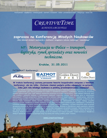 kreatywność – współpraca – innowacyjność – kontakt z biznesem – nauka – przedsiębiorczość – integracja – nasza rola zaprasza na Konferencję Młodych Naukowców „Rola dokonań młodych naukowców a możliwości osiągnięcia sukcesu naukowego i zawodowego” Motoryzacja w Polsce – transport, logistyka, rynek sprzedaży oraz nowości techniczne. NT: Kraków, 31.05.2011 PATRONAT Konferencji: W trakcie konferencji zostaną poruszone kwestie bezpośrednio związane z tematem konferencji, ale nie tylko… Zostanie również podjęta próba odpowiedzi na pytanie: Jaka jest rola młodego naukowca w polskiej przedsiębiorczości i biznesie? Absolwenci studiów drugiego stopnia coraz częściej podejmują decyzję o rozpoczęciu studiów doktoranckich. Decyzja ta często podyktowana jest chęcią pozostania na uczelni w charakterze naukowca i wykładowcy. Niestety po otrzymaniu dyplomu doktora nauk tylko część młodych naukowców pozostanie na uczelni macierzystej. Część młodych doktorów zasili inne uczelnie i jednostki naukowe, a zdecydowana większość rozpocznie kolejny etap swojego życia w instytucjach państwowych i firmach prywatnych. Dlatego też obok realizacji własnych badań naukowych i pisania pracy, doktoranci powinni podjąć wszelkie możliwe działania zmierzające do nawiązania współpracy z firmami prywatnymi, w których lub, z którymi będą realizować dalszą karierę zawodową. Włączanie się doktorantów w różnego rodzaju projekty międzyuczelniane, współpracę w modelu naukowiec-firma, udział we wszelkich konferencjach i szkoleniach o charakterze biznesowo-naukowym zwiększa szanse doktorantów na rozwój naukowy i zawodowy, a przede wszystkim może przynieść upragnioną satysfakcję. Młodzi naukowcy, którzy pozostali na Uczelni Wyższej w charakterze często asystenta, adiunkta mają również wiele możliwości nawiązania współpracy ze stale rozwijającym się polskim biznesem. Należy zastanowić się w jaki sposób przenieść własne dokonania i pomysły naukowe do realizacji w biznesie. Niewątpliwie szansą dla biznesu są innowacje. Każdy biznesmen zdaje sobie sprawę, że nie ma innowacji bez nowych pomysłów i badań naukowych. Współpraca młodych naukowców z firmami prywatnymi staje się szansą dla rozwoju polskiej nauki i biznesu. www.creativetime.pl